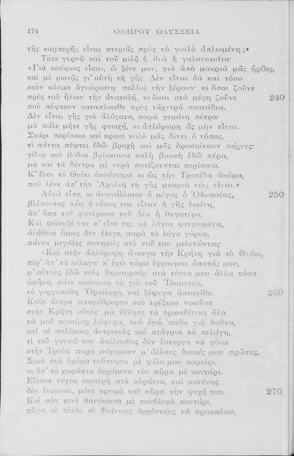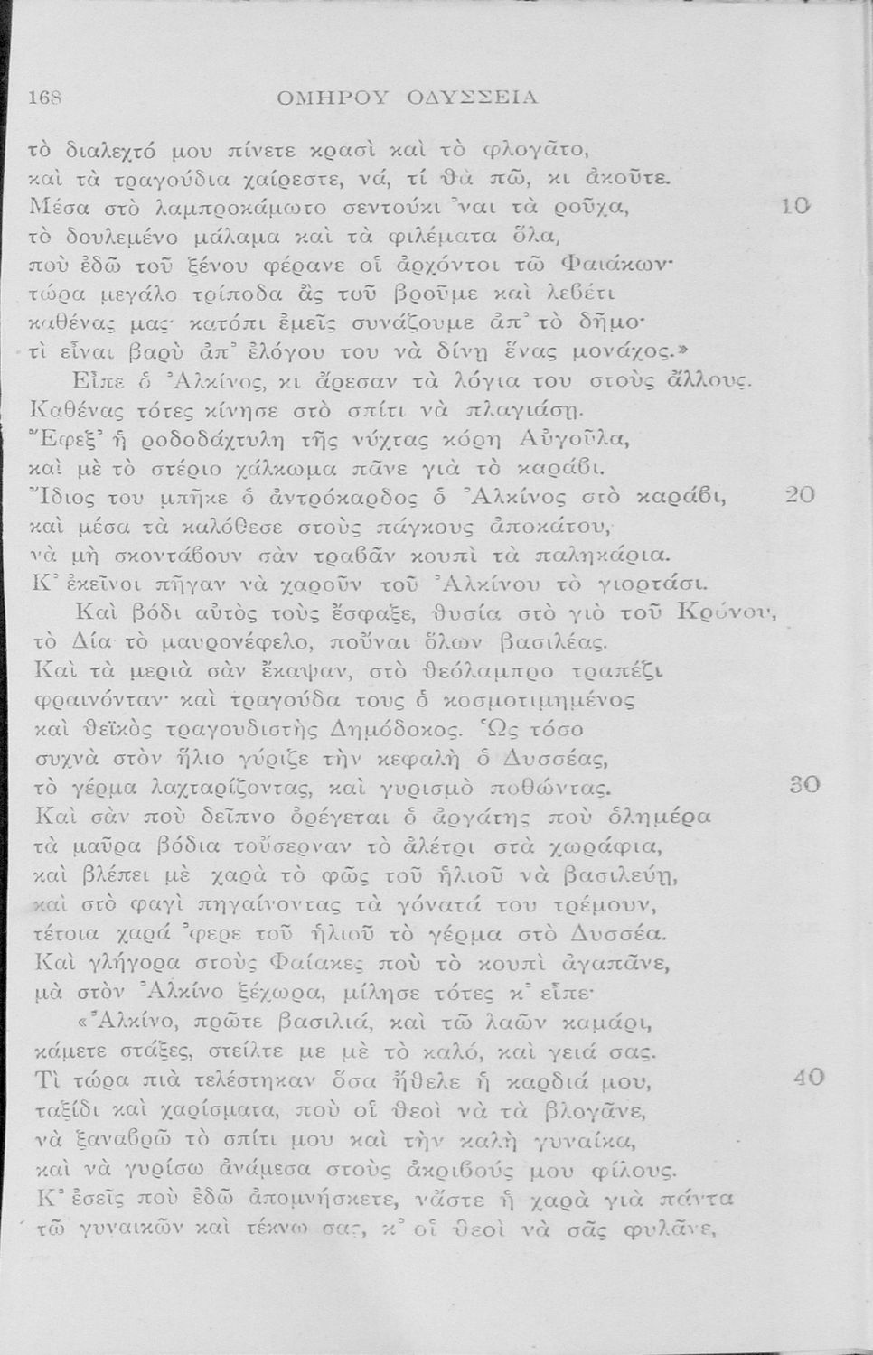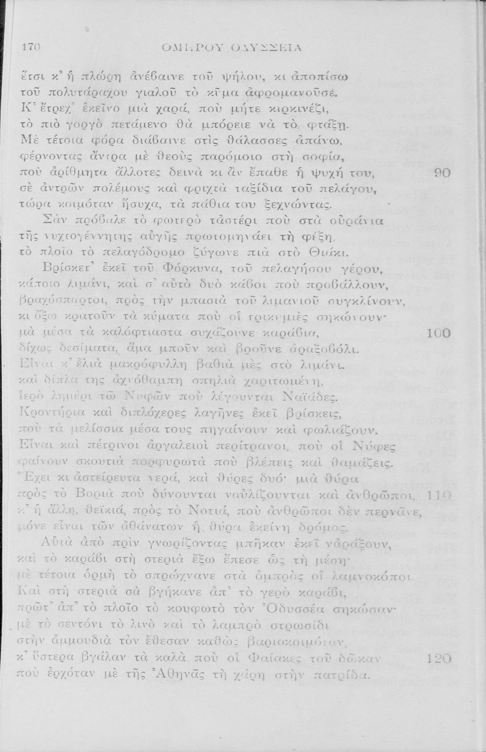 Σχολικό εγχειρίδιο του Γυμνασίου για το μάθημα των Αρχαίων Ελληνικών. Πρόκειται για το κείμενο της Οδύσσειας μεταφρασμένο στο τέλος περιλαμβάνει λεξιλόγιο.
