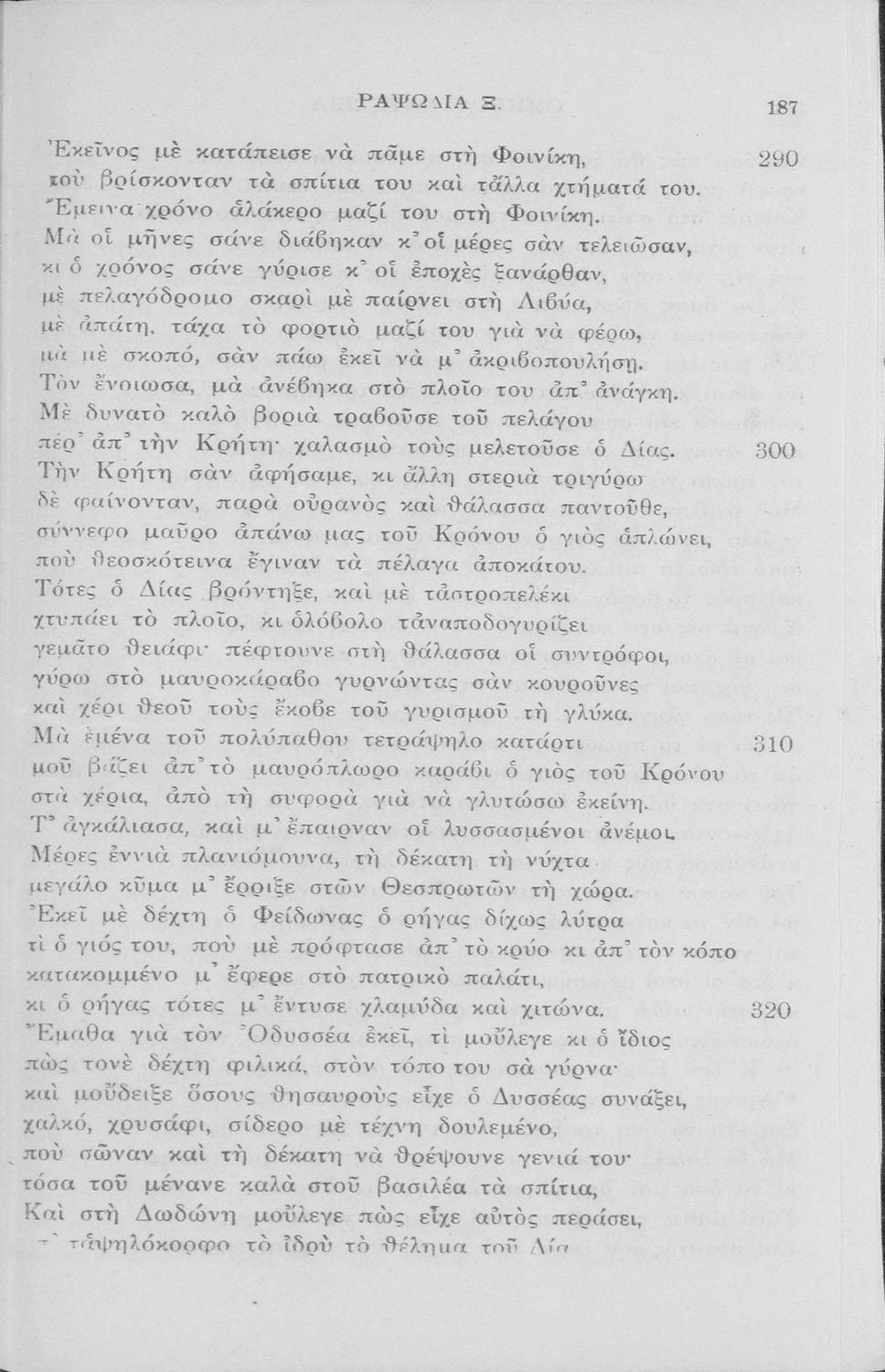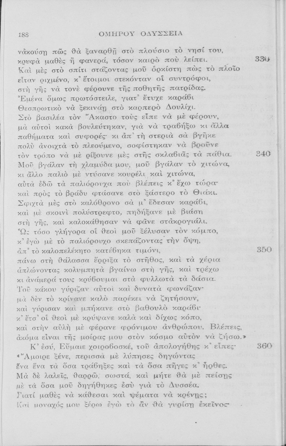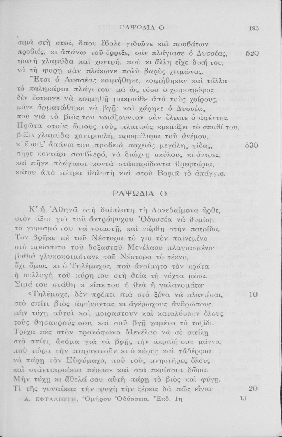 520 ## _aΣχολικό εγχειρίδιο του Γυμνασίου για το μάθημα των Αρχαίων Ελληνικών. Περιέχει τις ραψωδίες της Οδύσσειας και ερμηνευτικά, πραγματολογικά σχόλια, καθώς κ και γραμματικές παρατηρήσεις του συγγραφέα. Εγκρίθηκε για μια πενταετία 1932-1937.