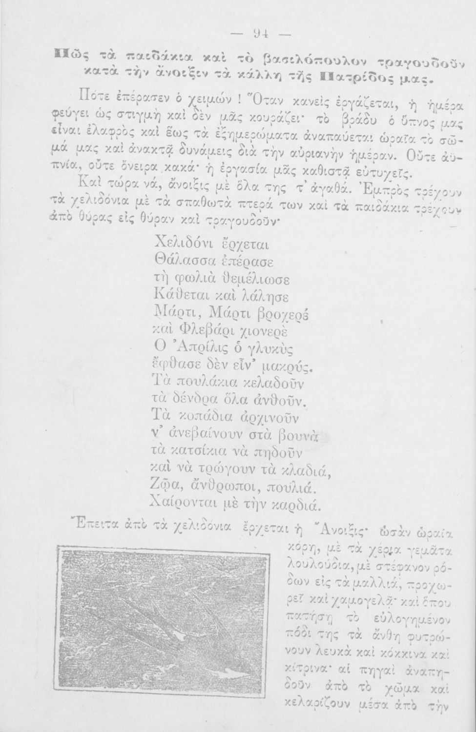 Αναγνωστικό του Δημοτικού. Περιέχει κείμενα της Γαλάτειας Καζαντζάκη. Στο τέλος του βιβλίου υπάρχουν καλλιγραφικά υποδείγματα από το Αναγνωσματάριο του Δημοσθένη Ανδρεάδη.