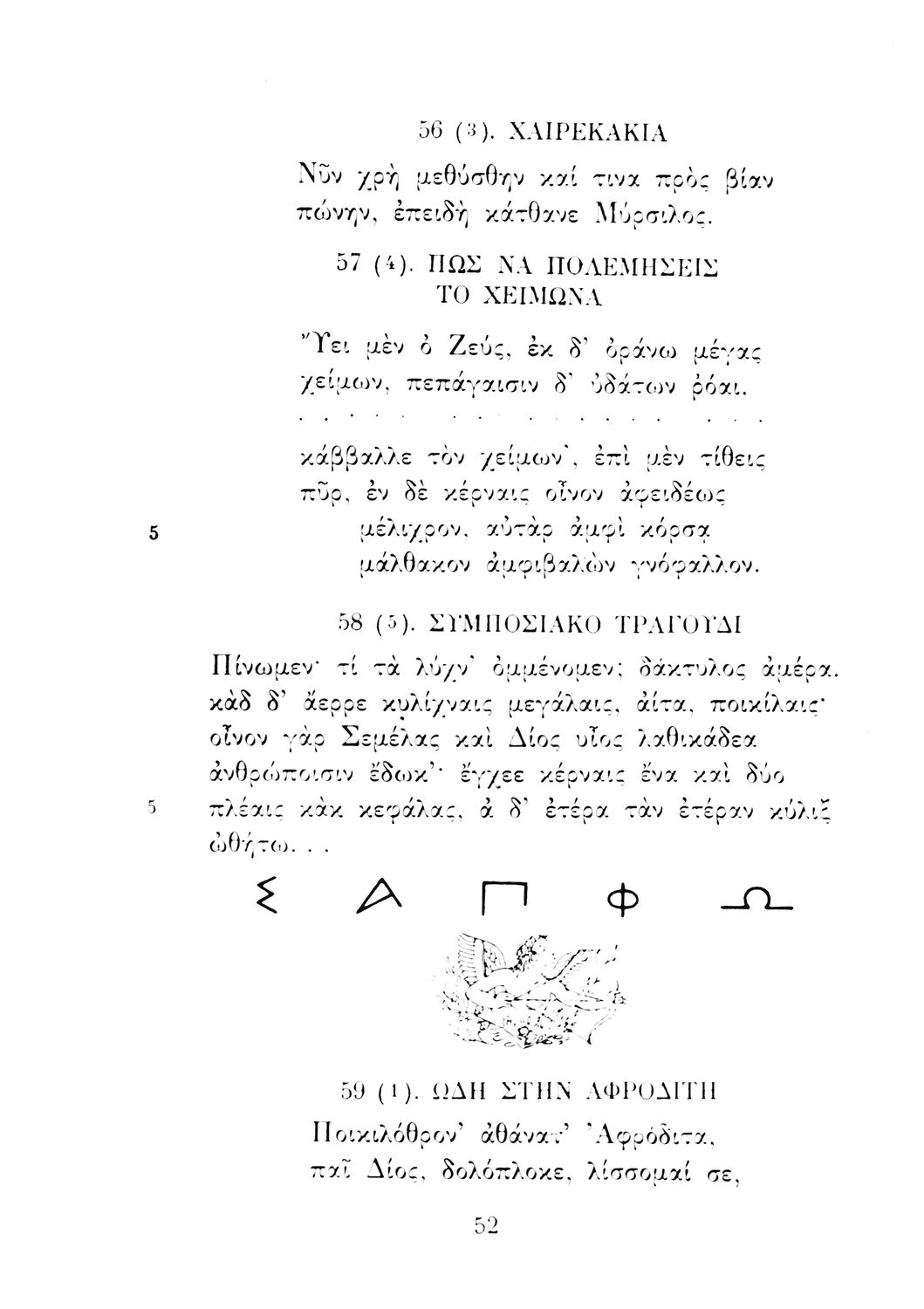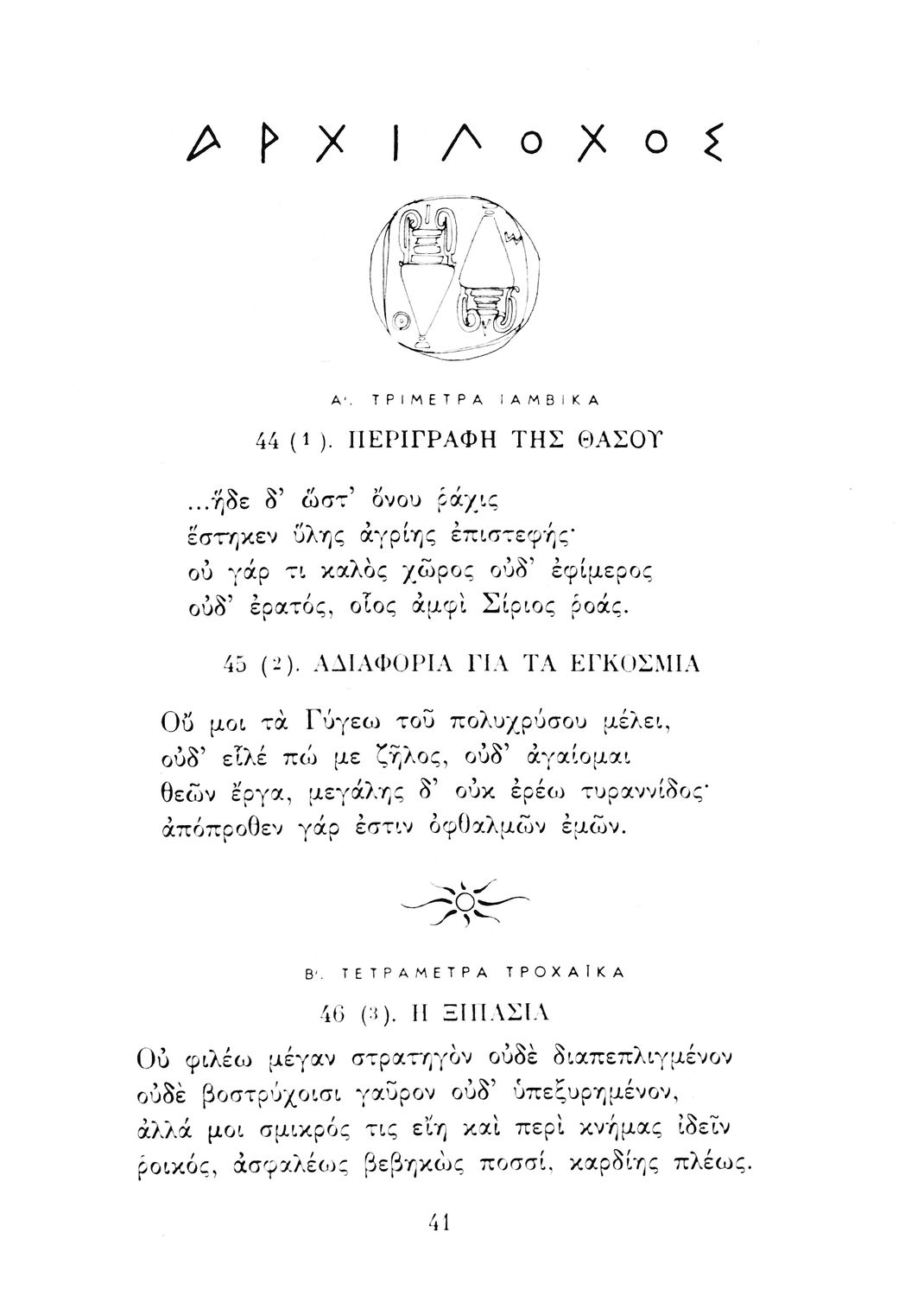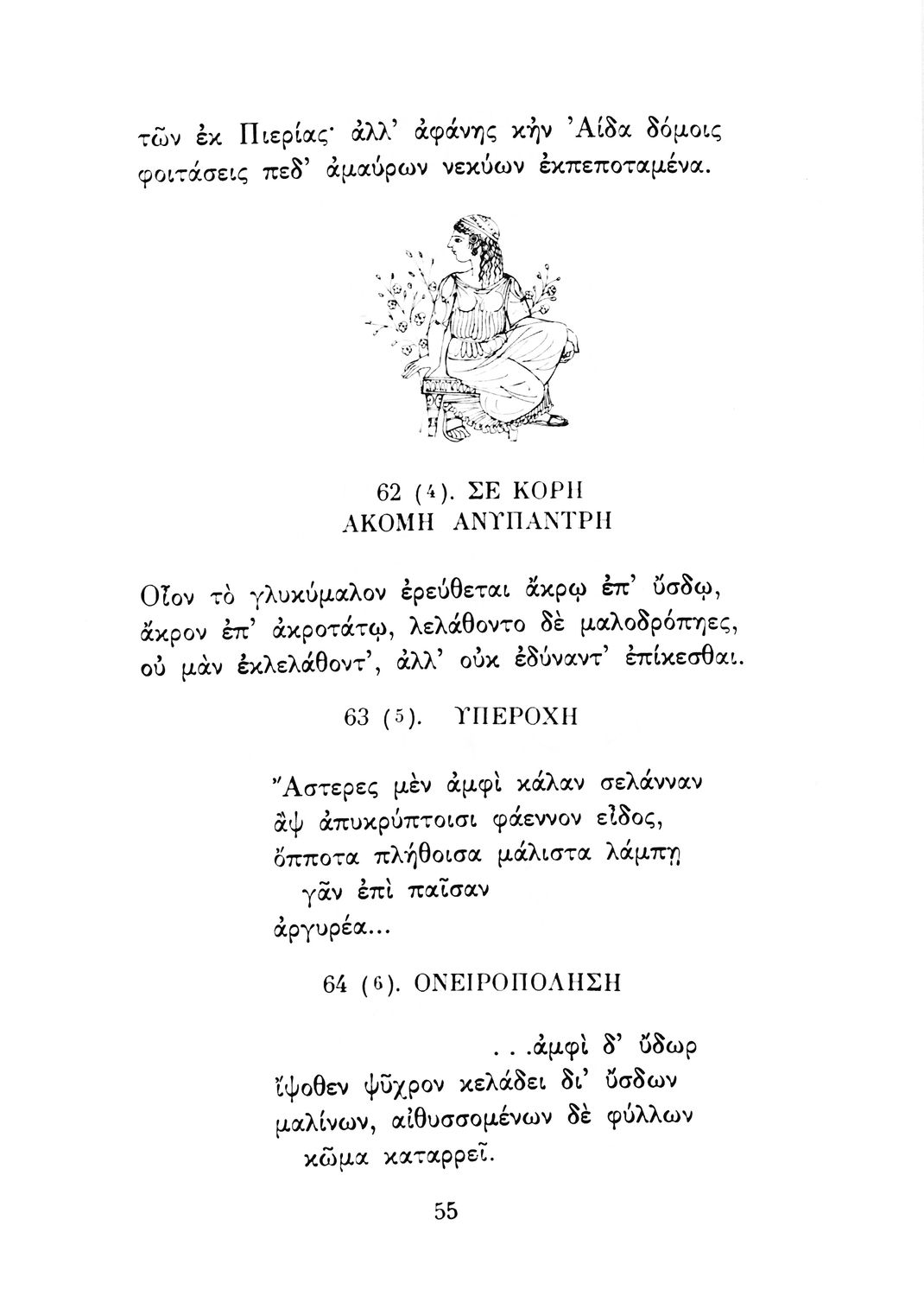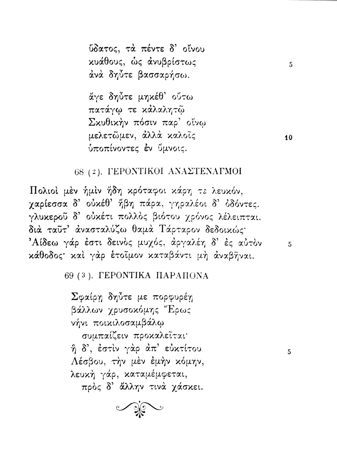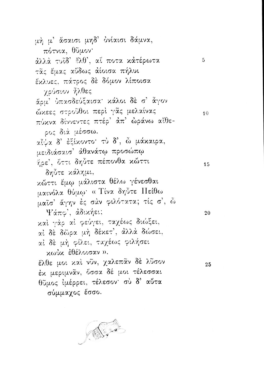 Σχολικό εγχειρίδιο Αρχαίων Ελληνικών Γ΄ Λυκείου που περιλαμβάνει εισαγωγή στη λυρική ποίηση, έργα αρχαίων Ελλήνων ποιητών, ερμηνευτικά και πραγματολογικά σχόλια, και λεξιλογικές παρατηρήσεις. Η εισαγωγή, τα σημειώματα και οι ερμηνευτικές σημειώσεις μεταγλωττίστηκαν από τον επ. Γεν. Επιθεωρητή Μ.Ε. Δορμπαράκη.