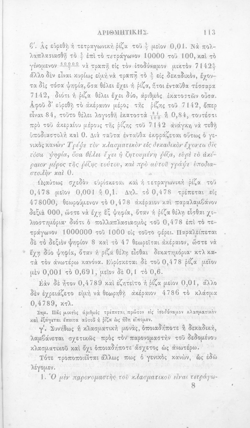 Σχολικό εγχειρίδιο Αριθμητικής που εστιάζει στις αριθμητικές πράξεις και τις εφαρμογές τους. Ο συγγραφέας κρίνει την αναλυτική μέθοδο ως προσφορότερη για την Στοιχειώδη Εκπαίδευση και εκθειάζει τον "από μνήμης