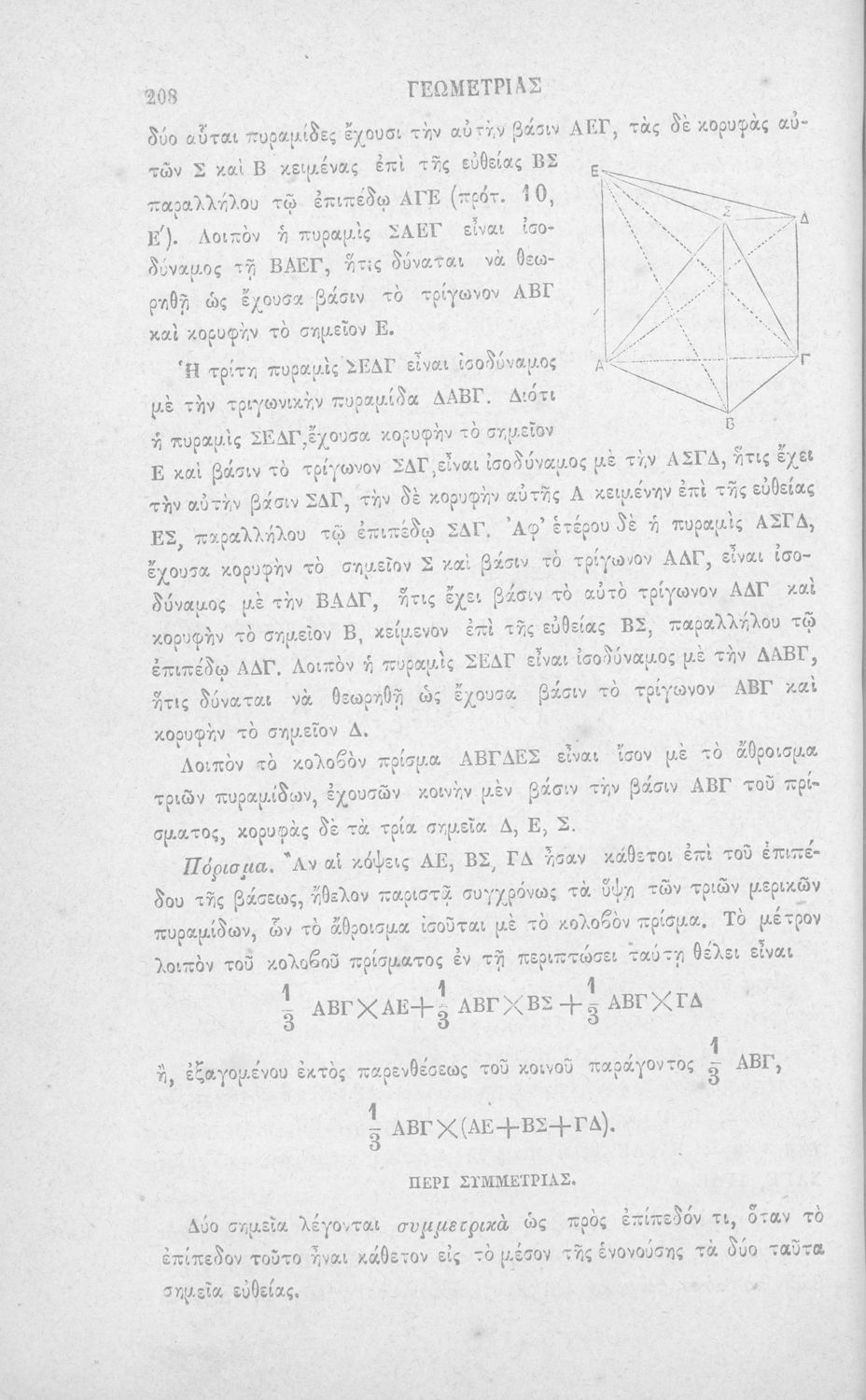 Σχολικό εγχειρίδιο Γεωμετρίας Γυμνασίων και Αστικών Σχολείων χωρισμένο σε Επιπεδομετρία και Στερεομετρία. Περιλαμβάνει και στοιχεία Χωρομετρίας.