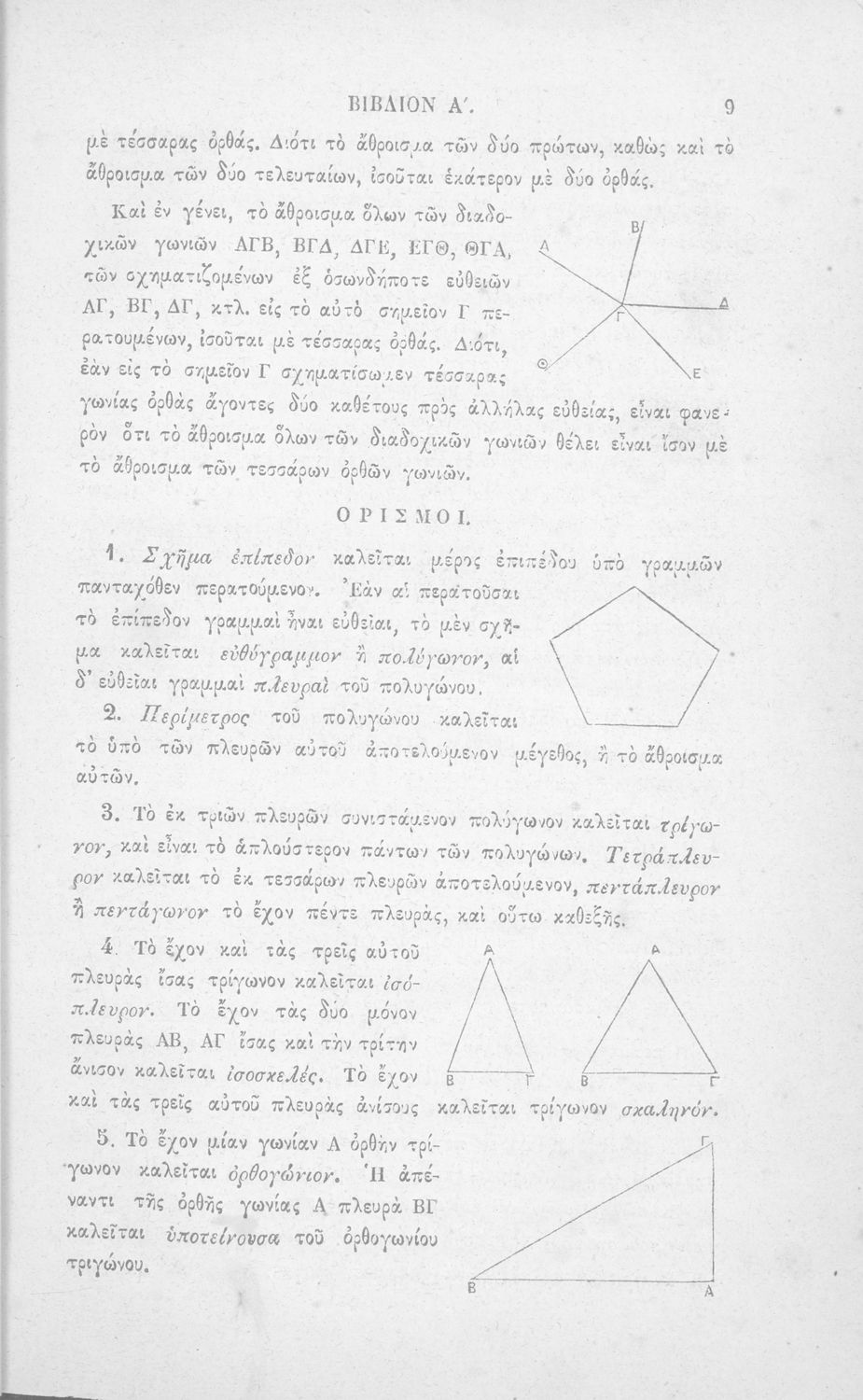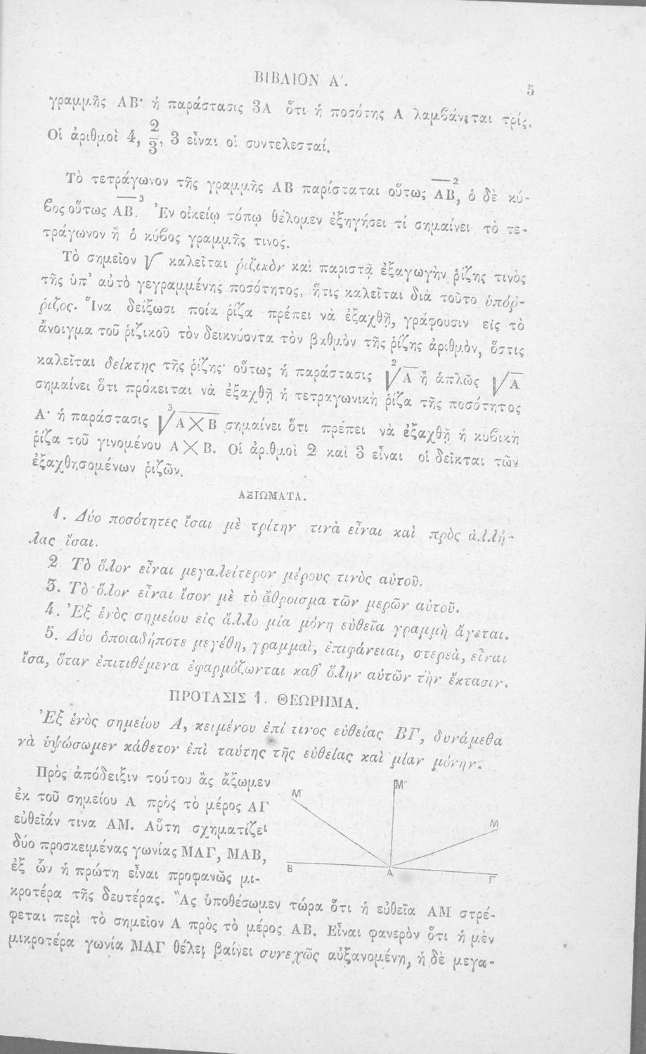 Σχολικό εγχειρίδιο Γεωμετρίας που είναι χωρισμένο σε αξιώματα, θεωρήματα και πορίσματα και εστιάζει στην Επίπεδη Γεωμετρία και τη Στερεομετρία.
