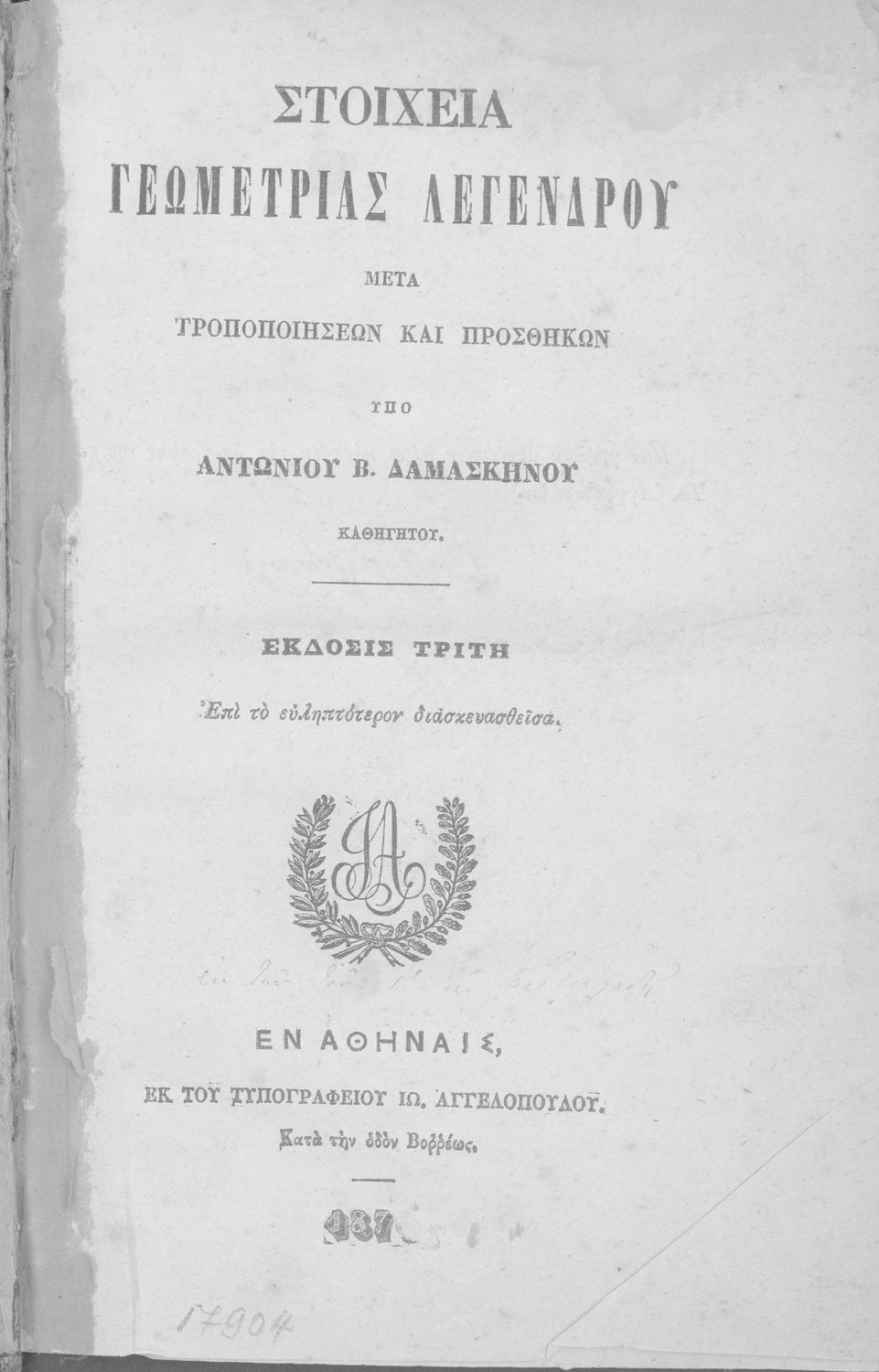 Τίτλος: Στοιχεία Γεωμετρίας Λεγένδρου μετά τροποποιήσεων και προσθηκών