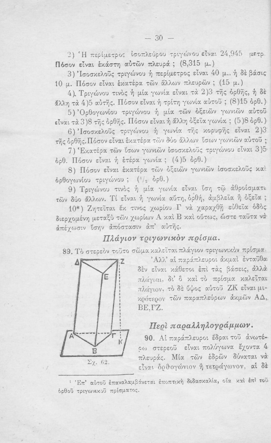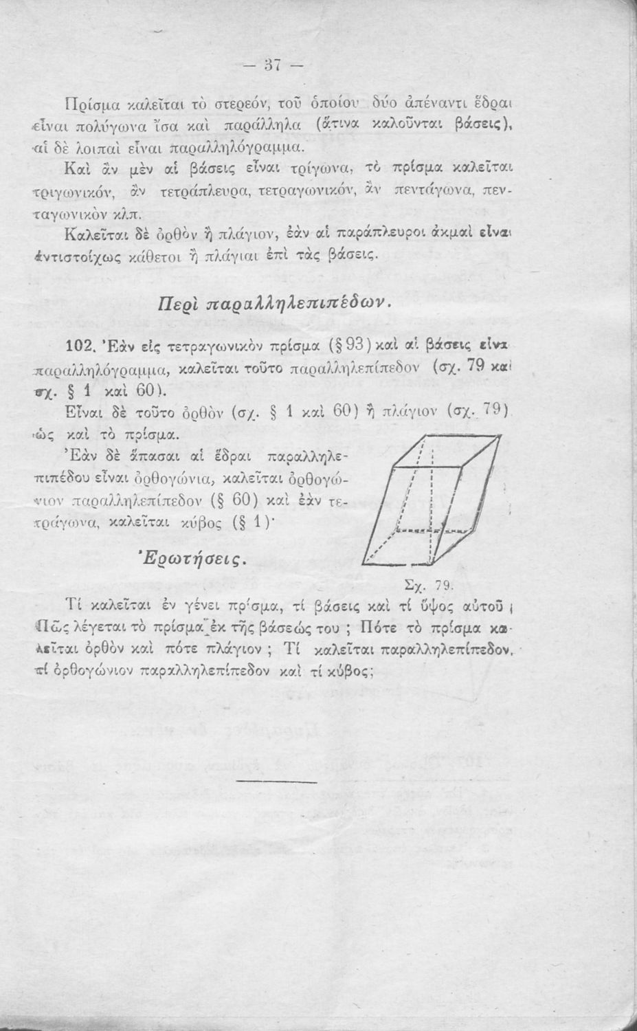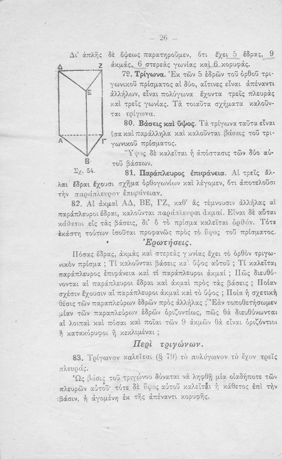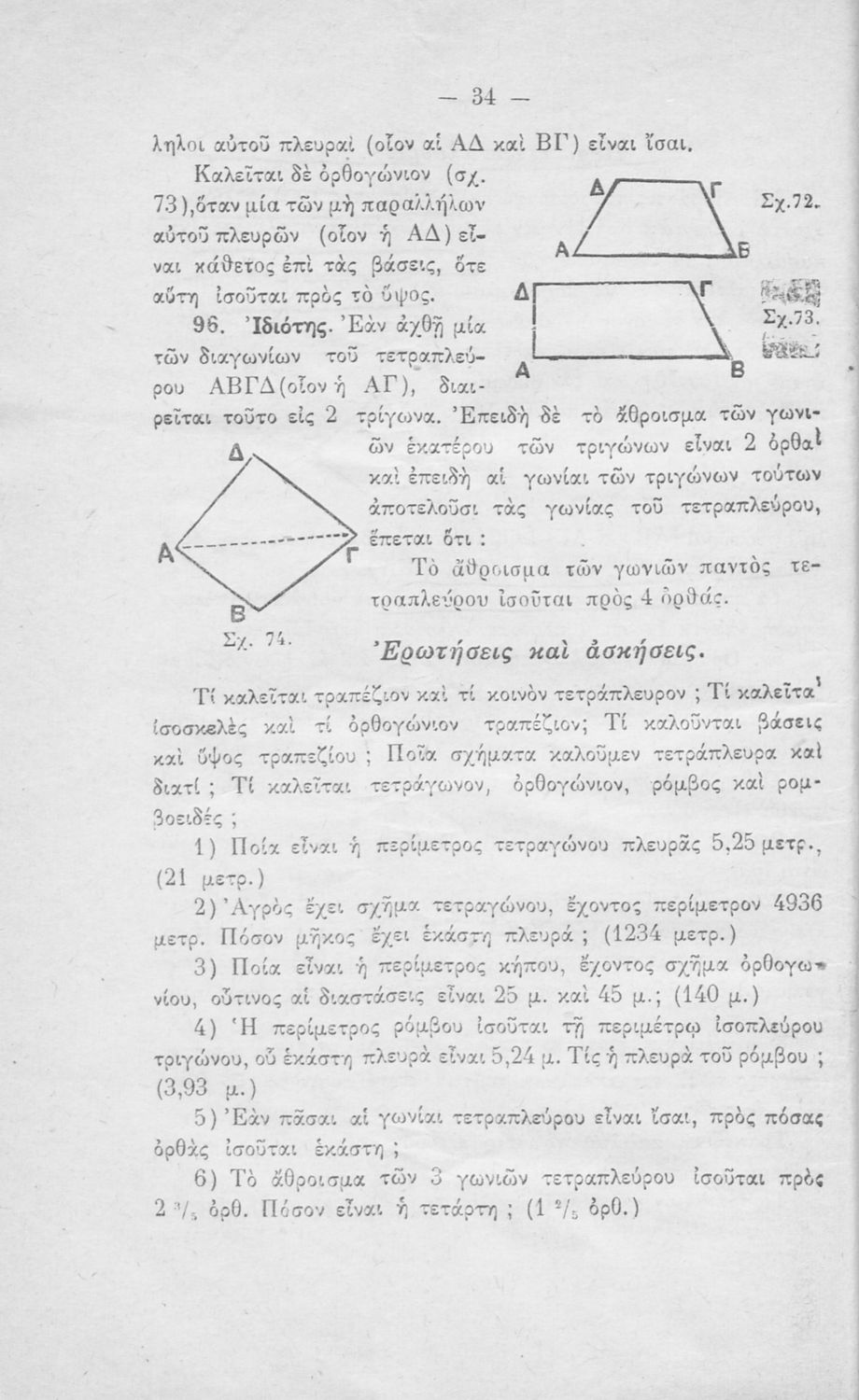 Σχολικό εγχειρίδιο Γεωμετρίας για την Α΄, Β΄ και Γ΄ τάξη των Ελληνικών και Αστικών Σχολείων και Παρθεναγωγείων που είναι χωρισμένο σε Επιπεδομετρία και Στερεομετρία και περιλαμβάνει θεωρία και ασκήσεις.