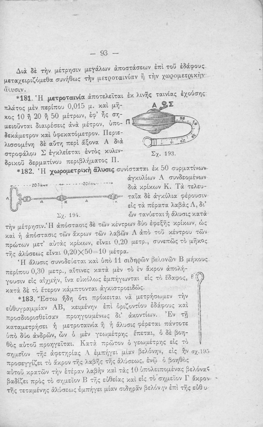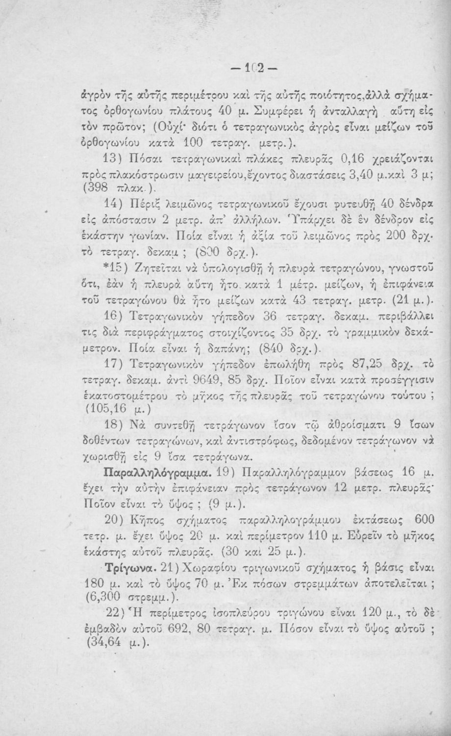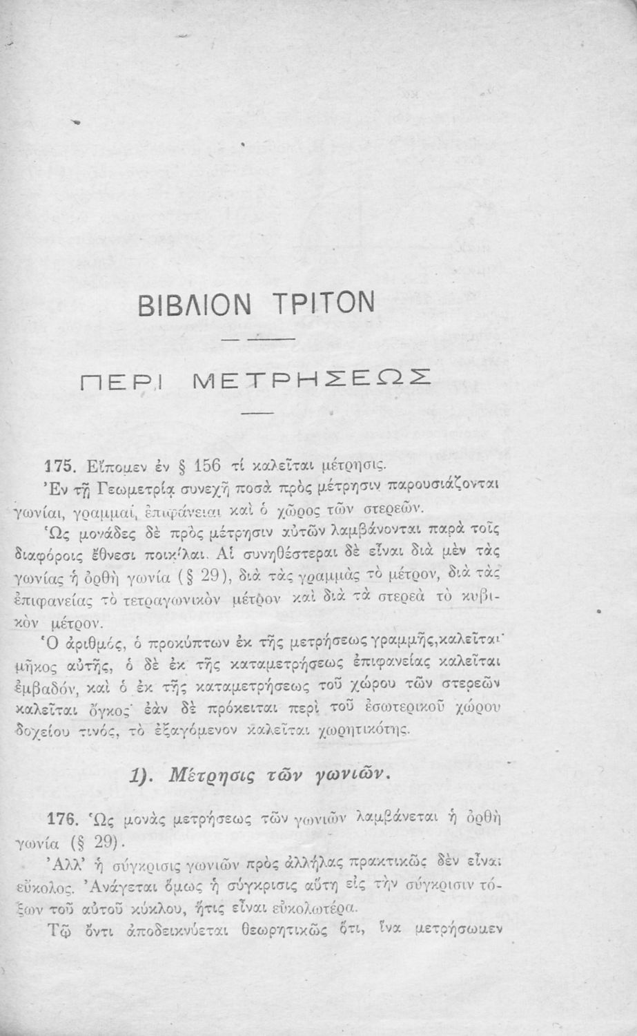 Σχολικό εγχειρίδιο Γεωμετρίας για την Α΄, Β΄ και Γ΄ τάξη των Ελληνικών και Αστικών Σχολείων και Παρθεναγωγείων που είναι χωρισμένο σε Επιπεδομετρία και Στερεομετρία και περιλαμβάνει θεωρία και ασκήσεις.