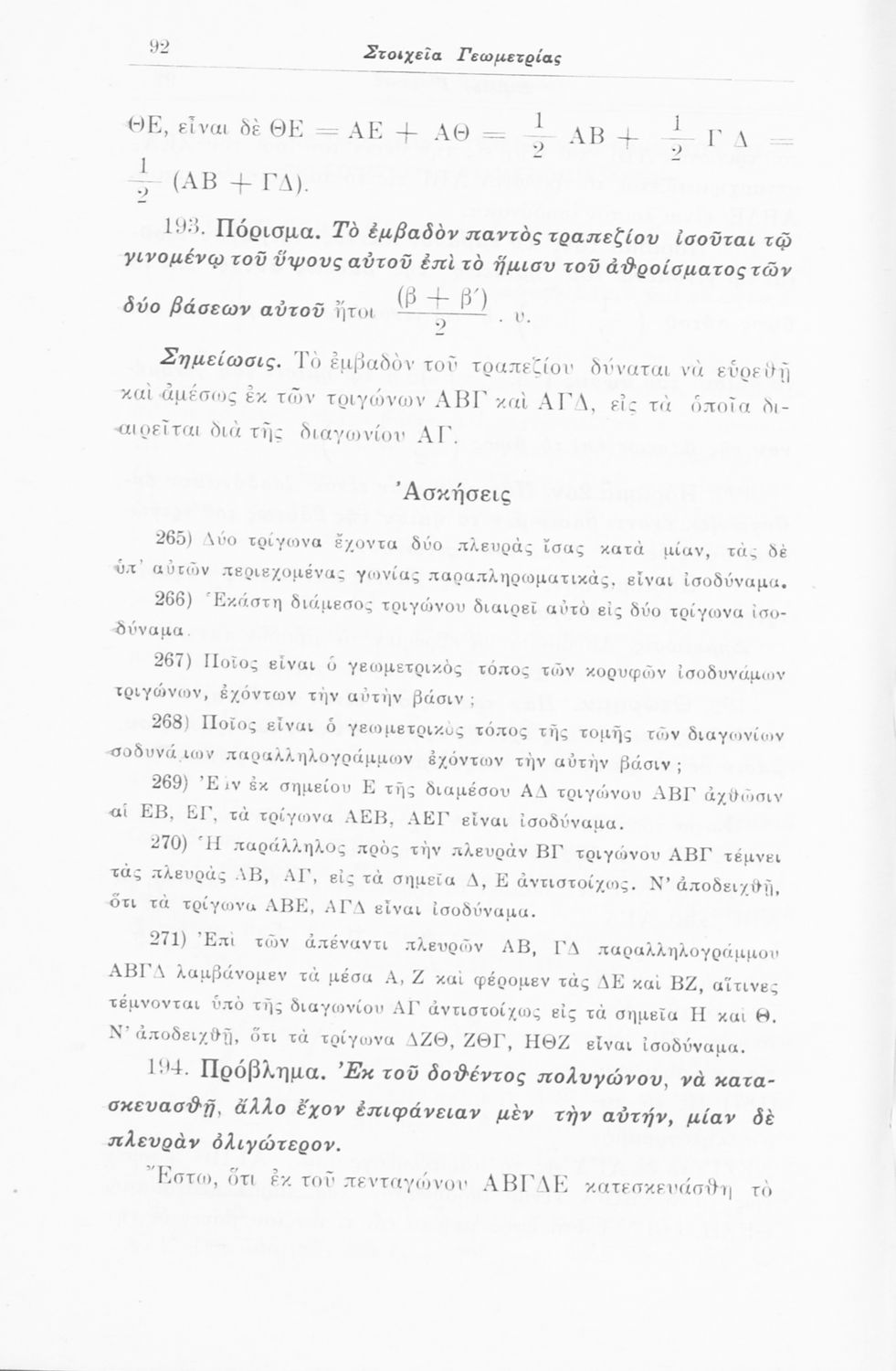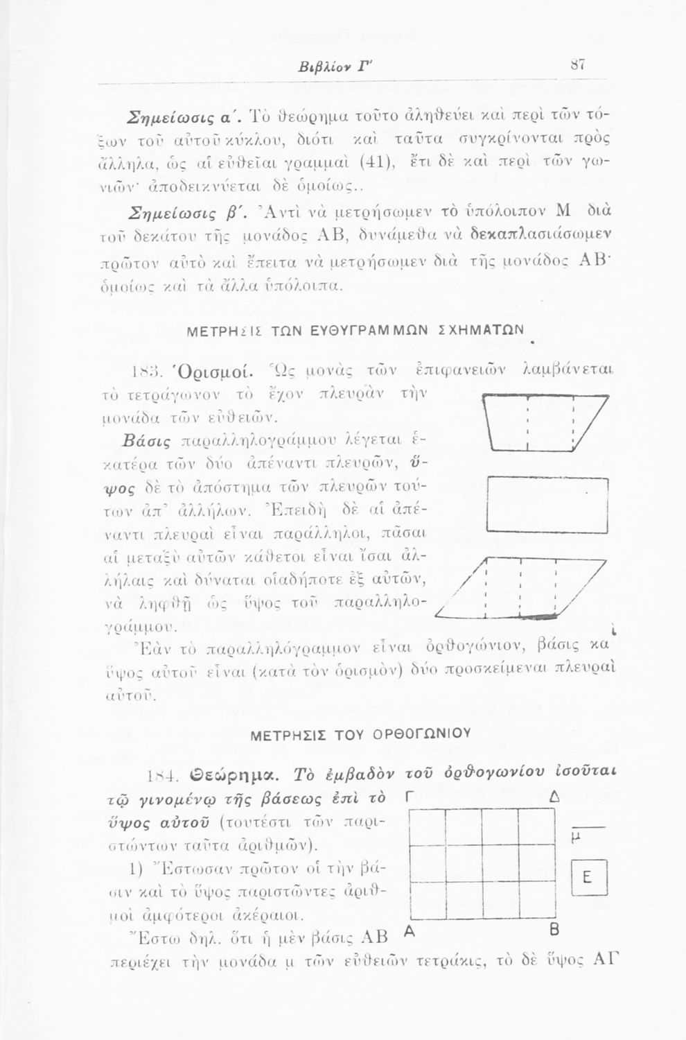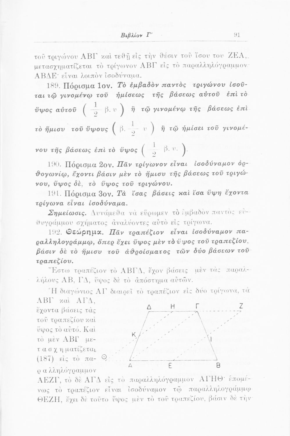 Σχολικό εγχειρίδιο Γεωμετρίας Γυμνασίου χωρισμένο σε ορισμούς, θεωρήματα, πορίσματα και ασκήσεις που εστιάζει στην Επιπεδομετρία και τη Στερεομετρία. Διαθέτει και παράρτημα με στοιχεία Αναλυτικής Γεωμετρίας.