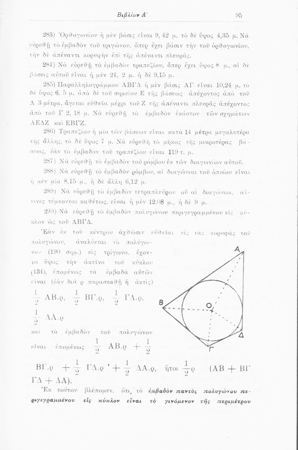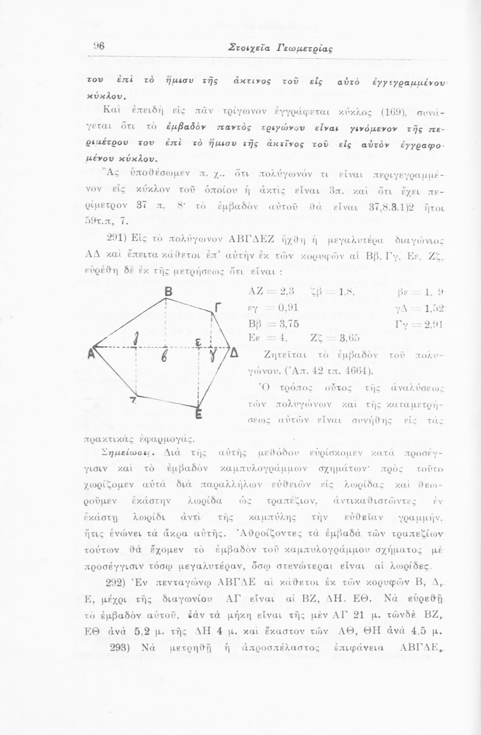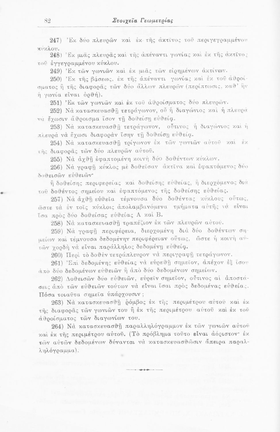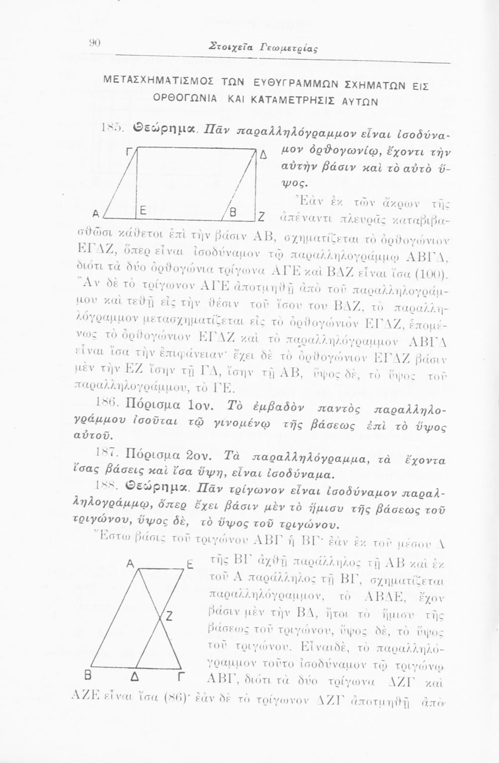 Σχολικό εγχειρίδιο Γεωμετρίας Γυμνασίου χωρισμένο σε ορισμούς, θεωρήματα, πορίσματα και ασκήσεις που εστιάζει στην Επιπεδομετρία και τη Στερεομετρία. Διαθέτει και παράρτημα με στοιχεία Αναλυτικής Γεωμετρίας.