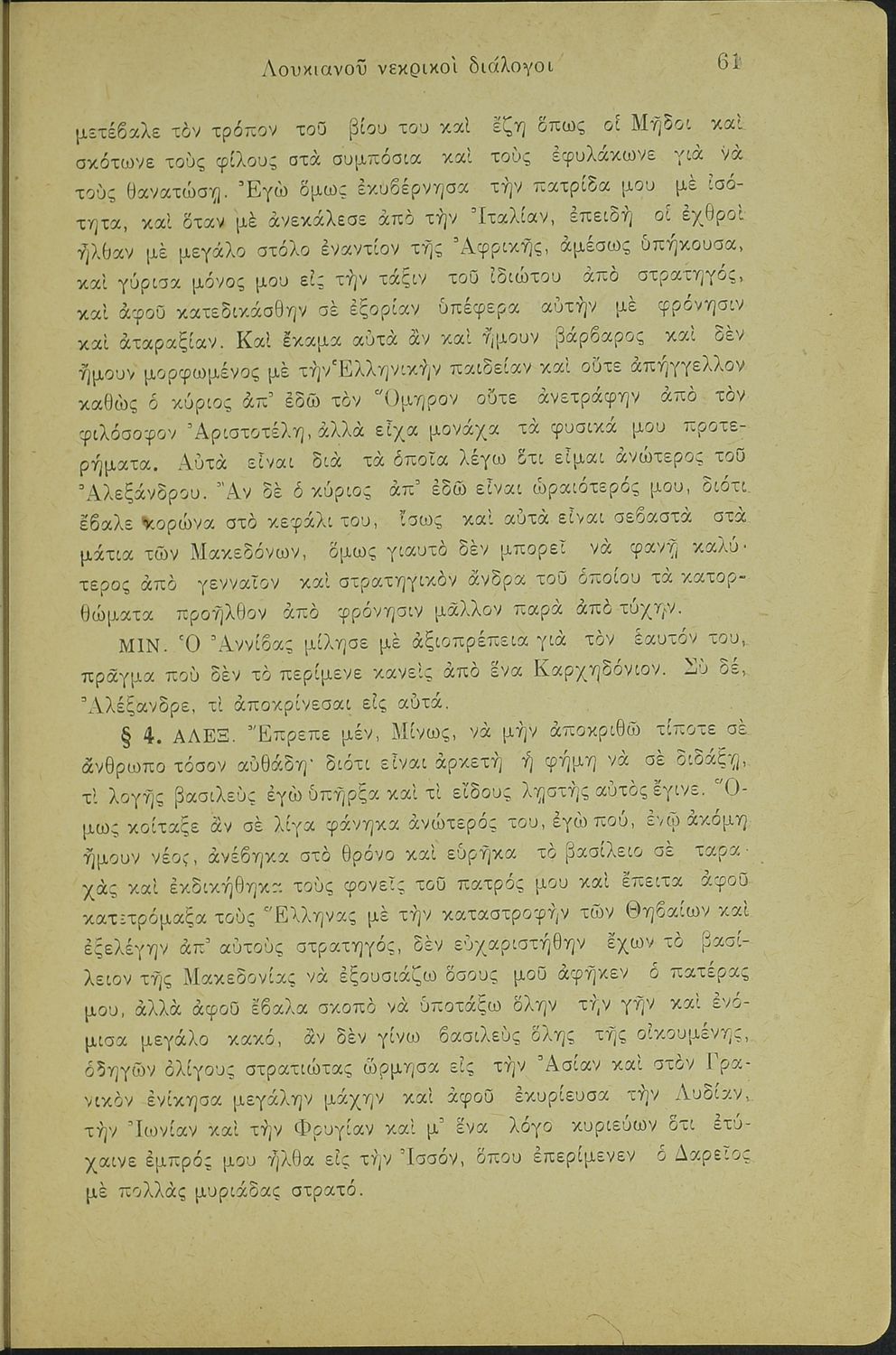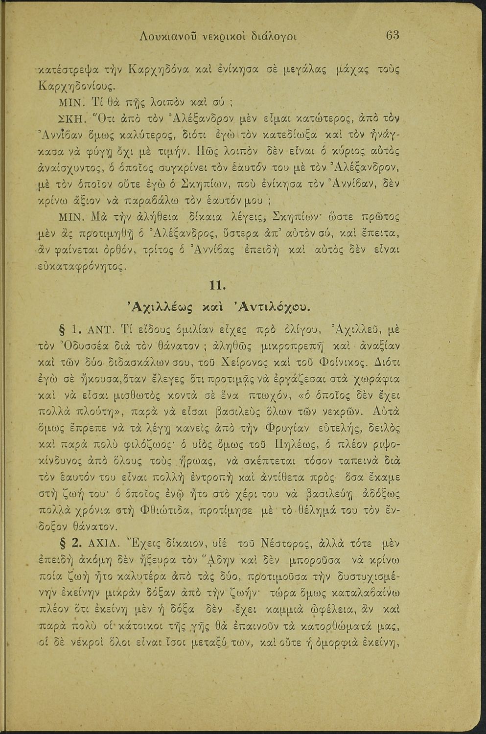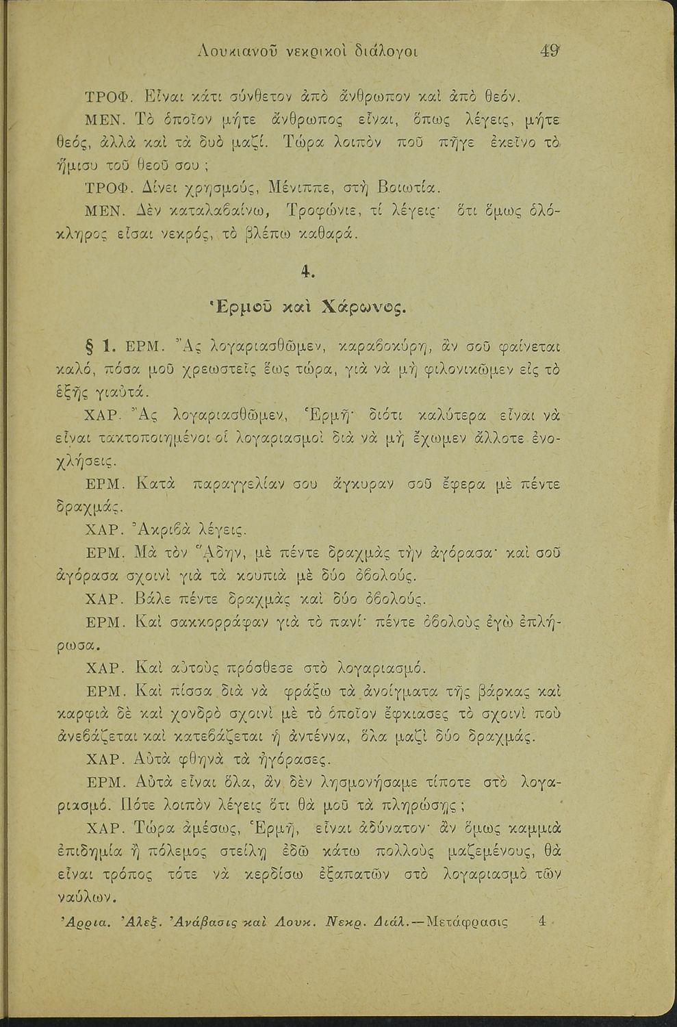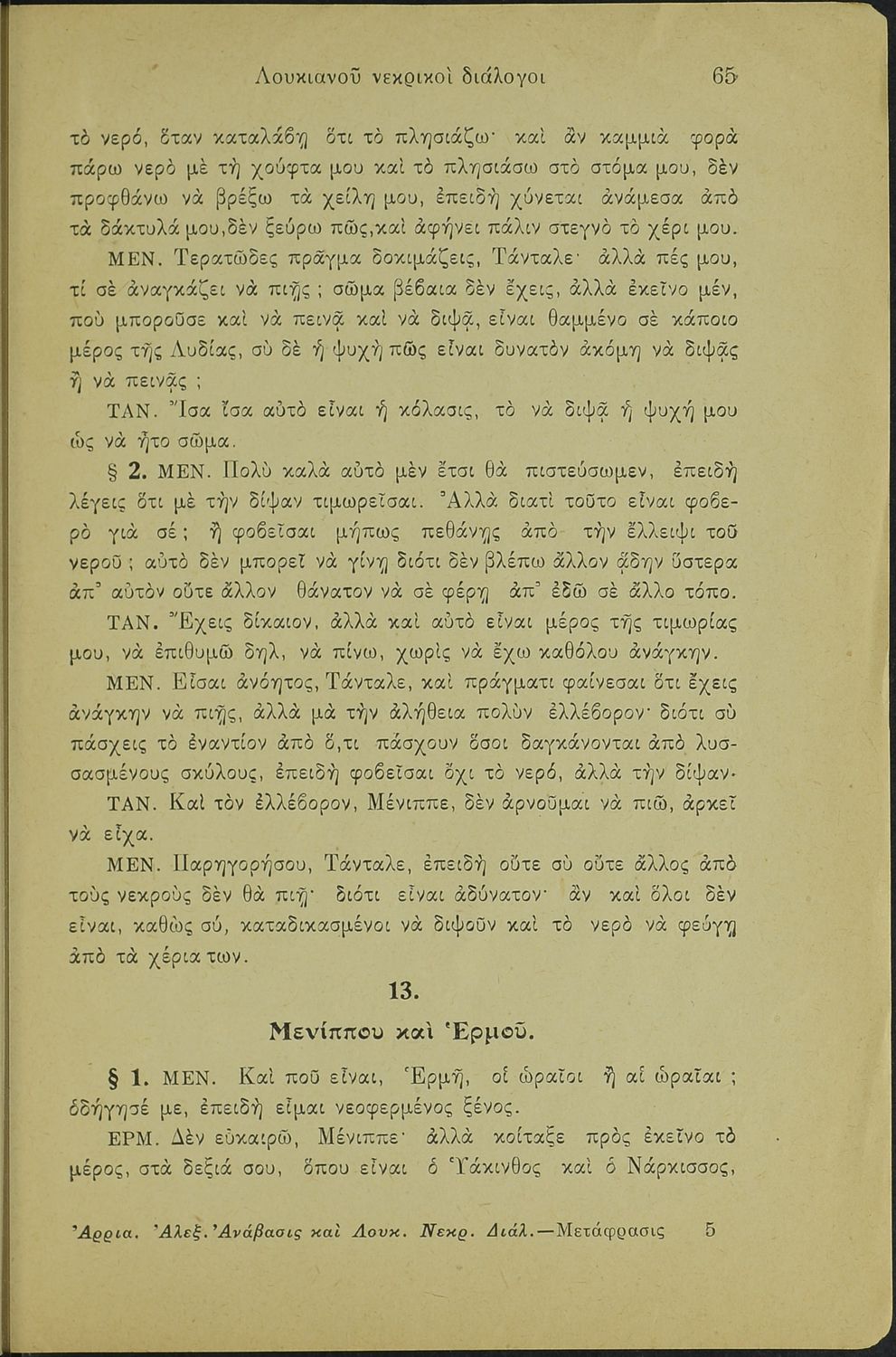 Μαθητικό βοήθημα Αρχαίων Ελληνικών για τα Αστικά Σχολεία και Παρθεναγωγεία που περιέχει μετάφραση αποσπασμάτων από το έργο του Αρριανού Αλέξανδρου Ανάβασις και του Λουκιανού Νεκρικοί Διάλογοι, ερμηνευτικά και πραγματολογικά σχόλια.