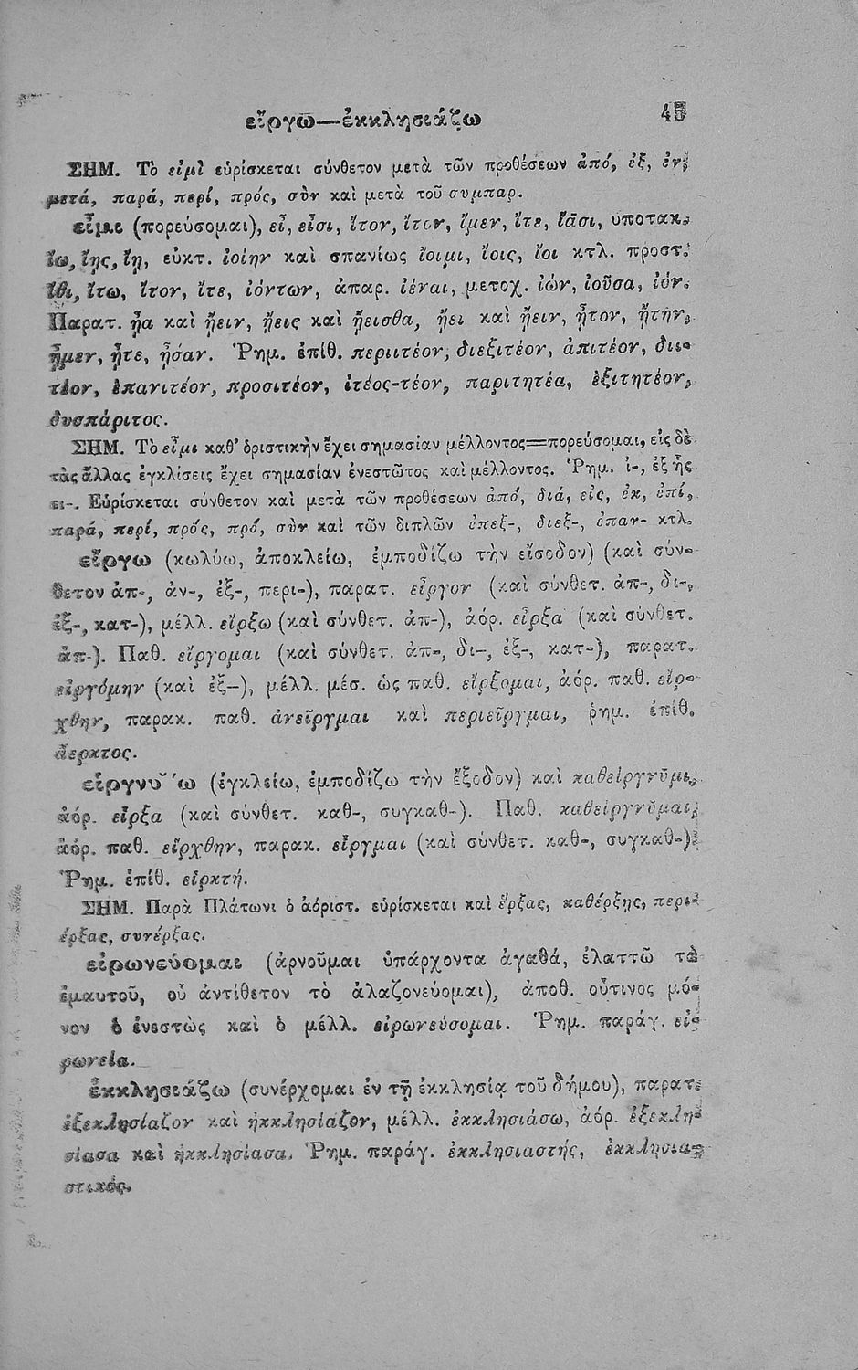 Μαθητικό βοήθημα Αρχαίων Ελληνικών για τα Ελληνικά Σχολεία, Παρθεναγωγεία και Γυμνάσια που περιλαμβάνει γραμματική της αρχαίας ελληνικής και κατάλογο ανωμάλων ρημάτων.