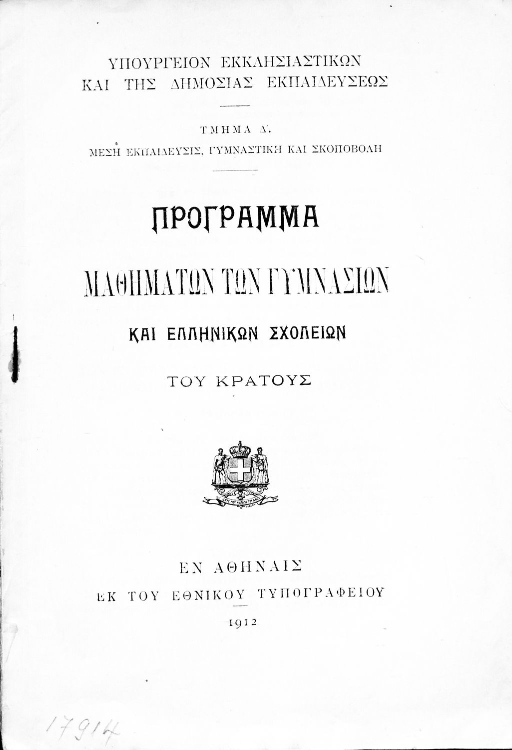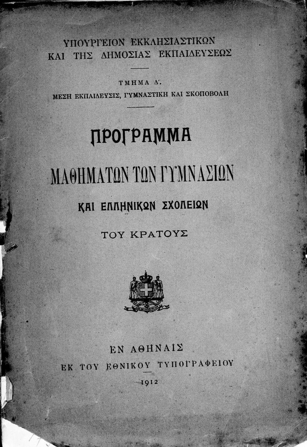 Αναλυτικό πρόγραμμα που εκδόθηκε με εντολή του Υπουργείου των Εκκλησιαστικών και της Δημόσιας Εκπαιδεύσεως από το τμήμα Δ΄, Μέσης Εκπαίδευσης, Γυμναστικής και Σκοποβολής. Στο εξώφυλλο υπάρχει το βασιλικό σήμα.
