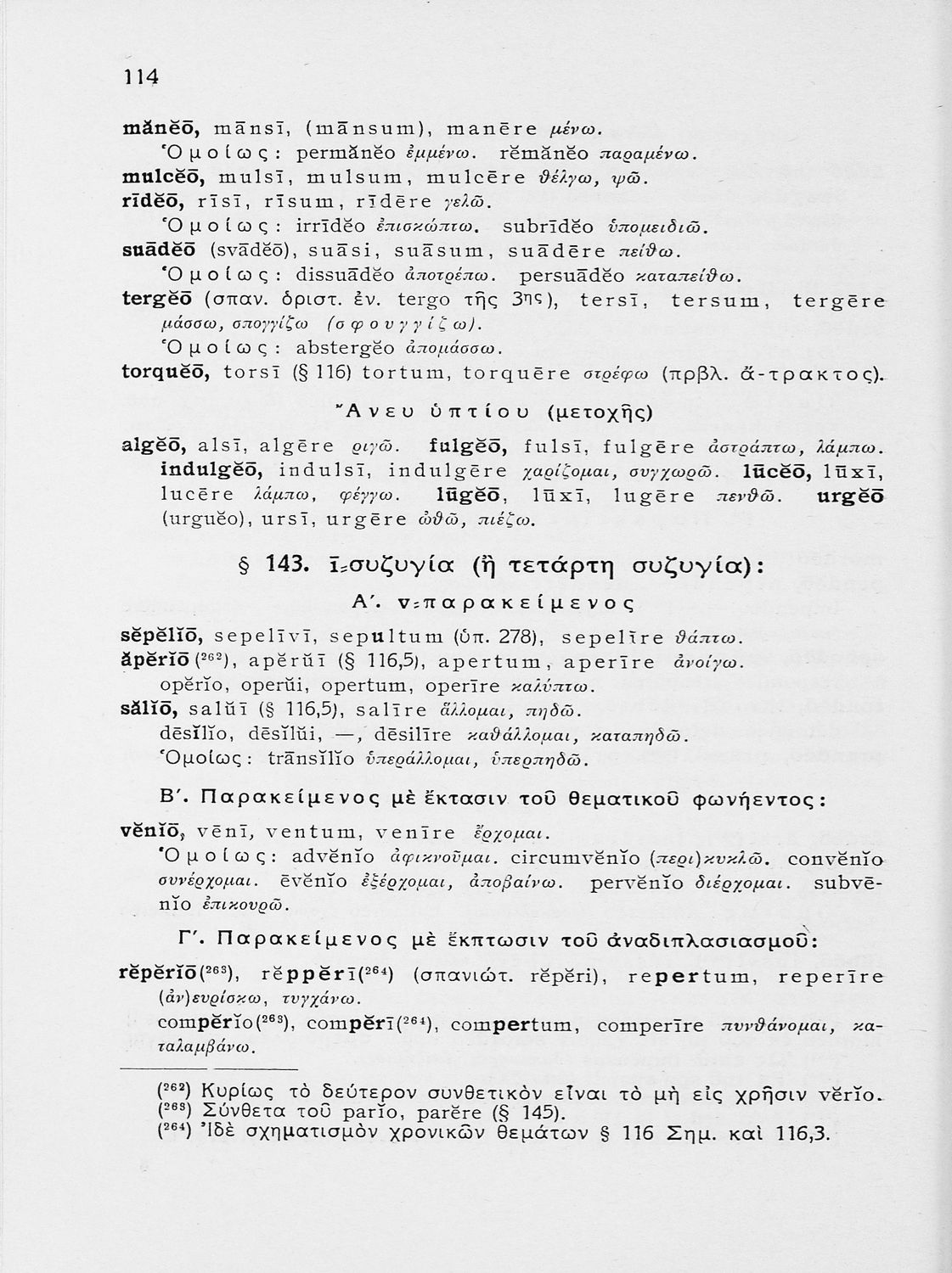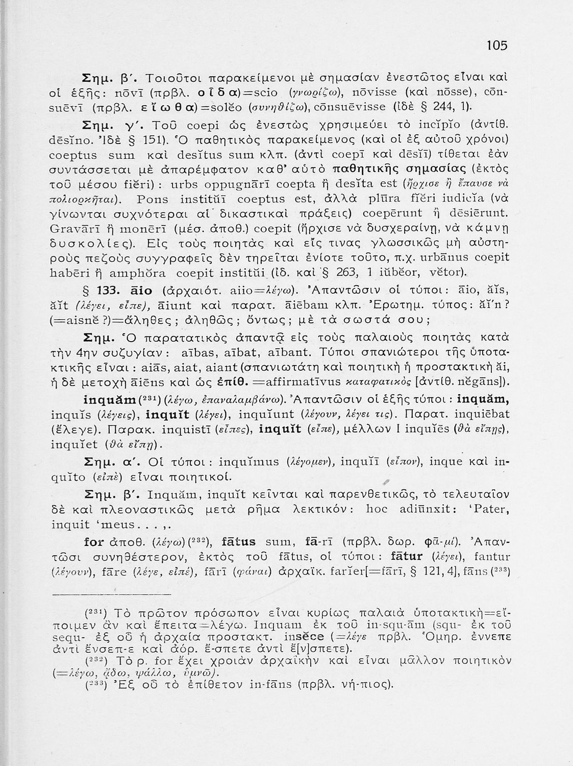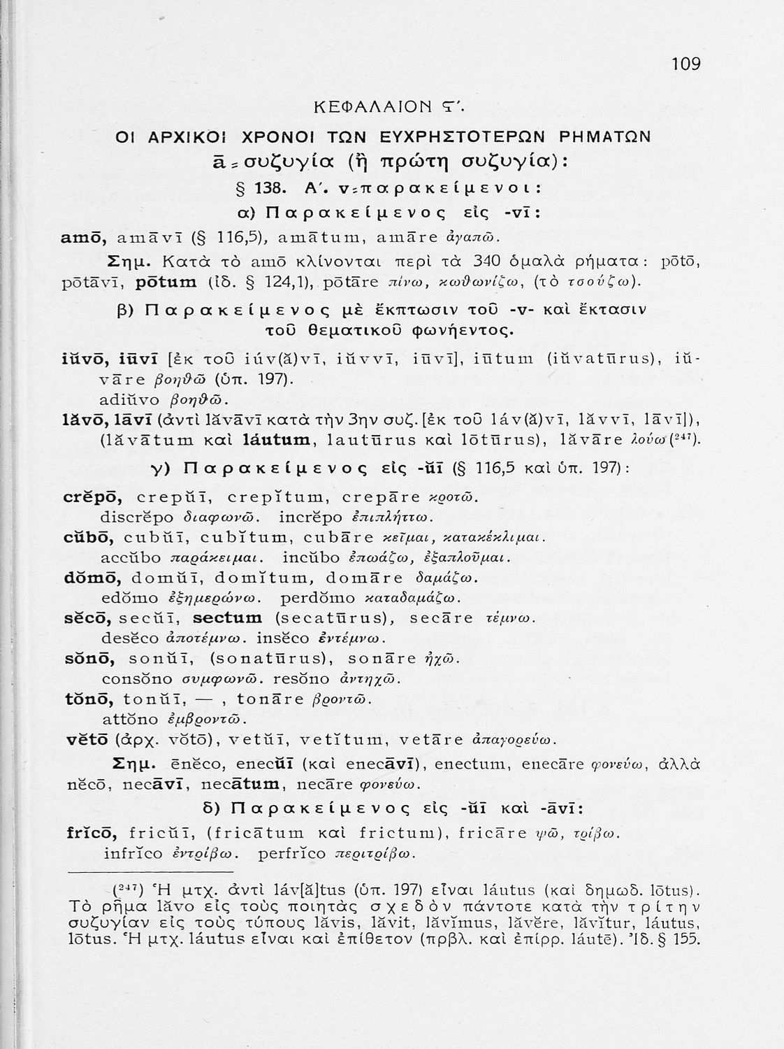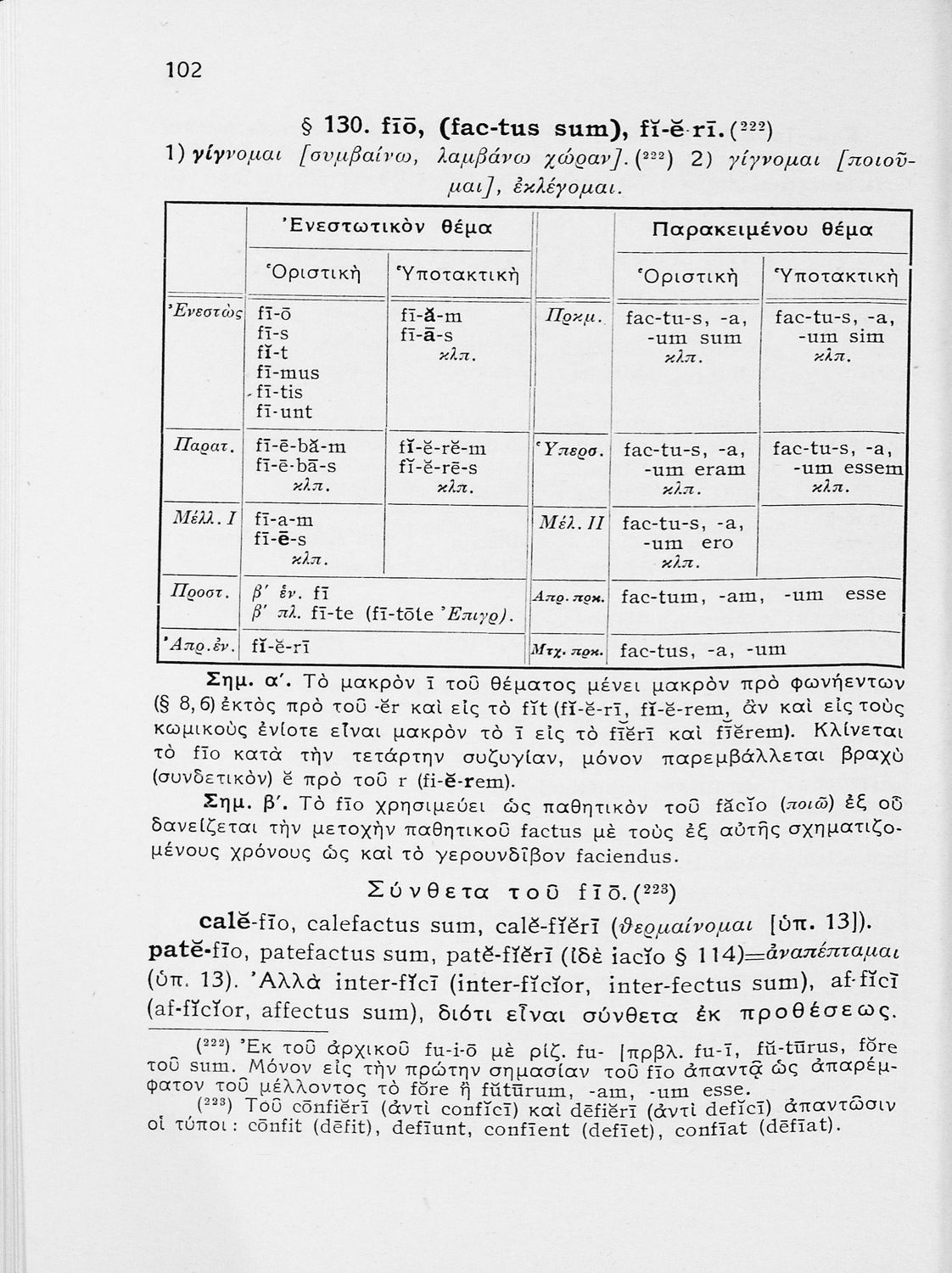Σχολικό εγχειρίδιο Λατινικών Γυμνασίου που περιλαμβάνει γραμματική και συντακτικό και είναι χωρισμένο σε φθογγολογικό, τυπολογικό και ετυμολογικό μέρος.