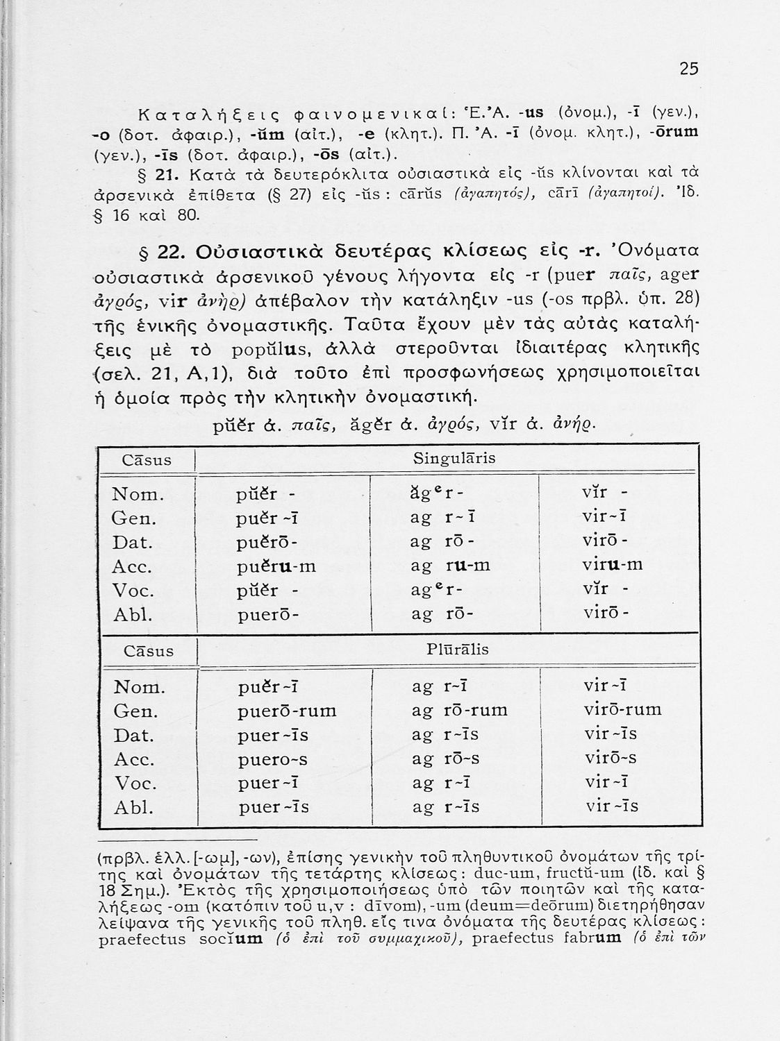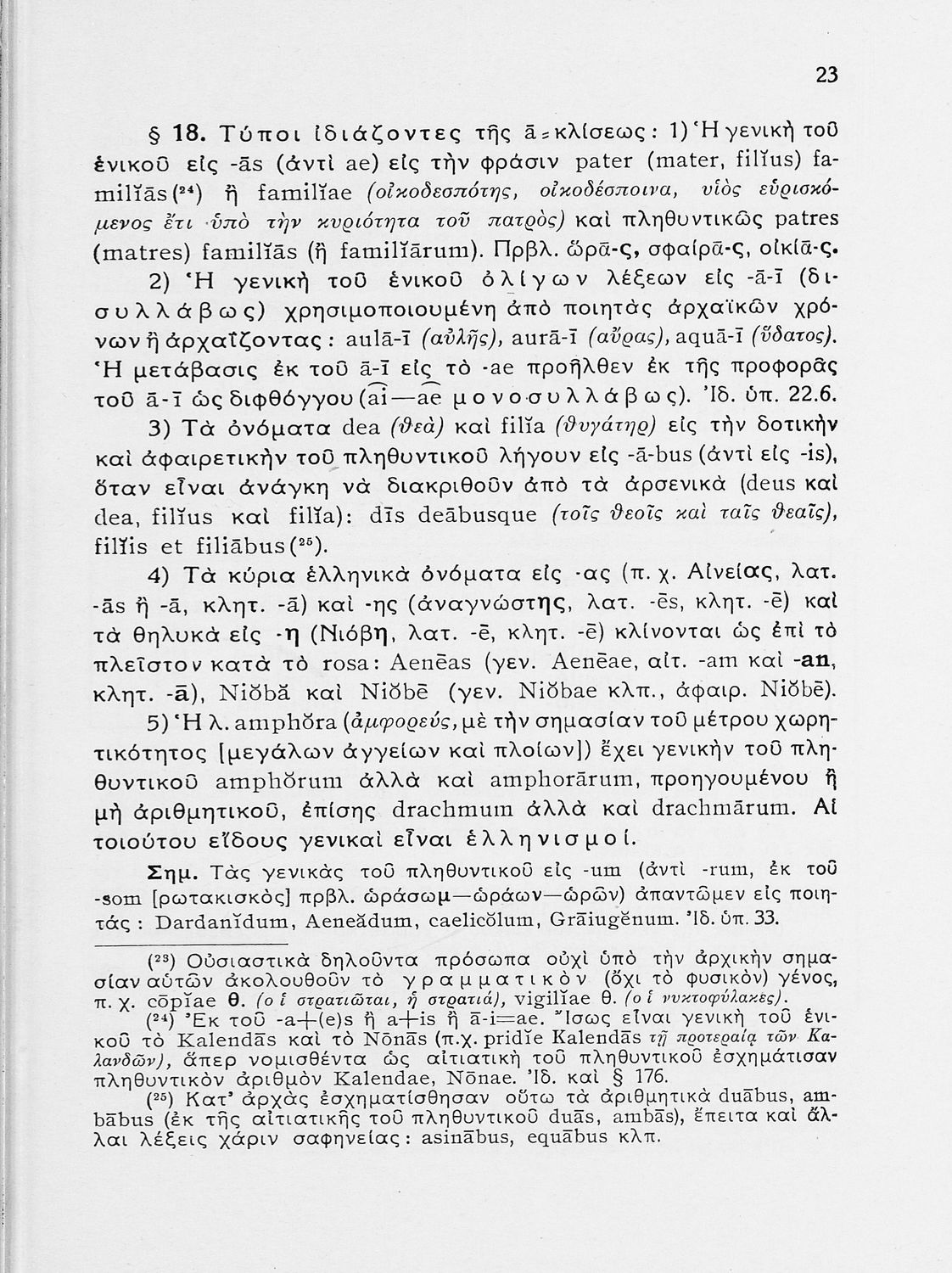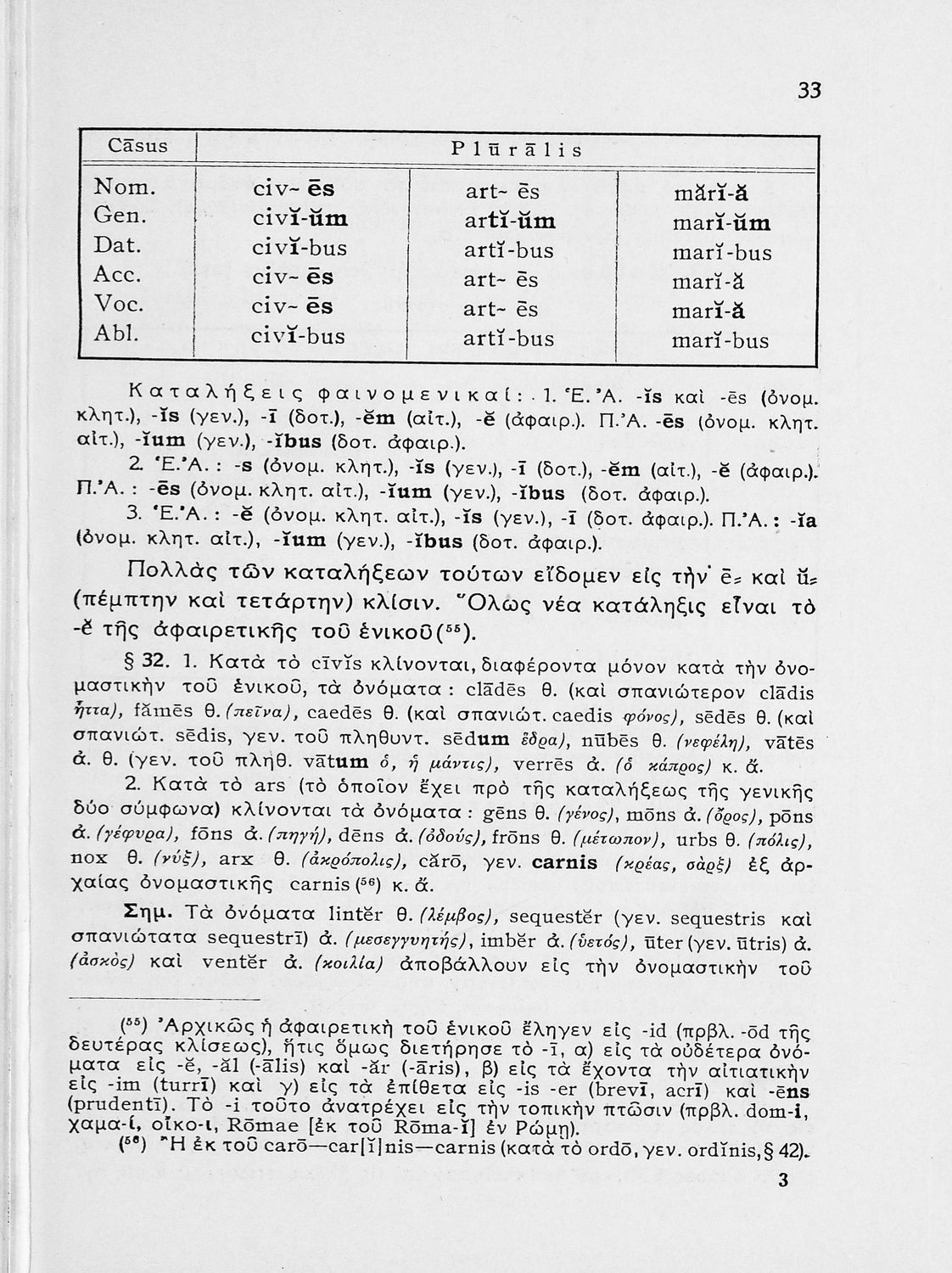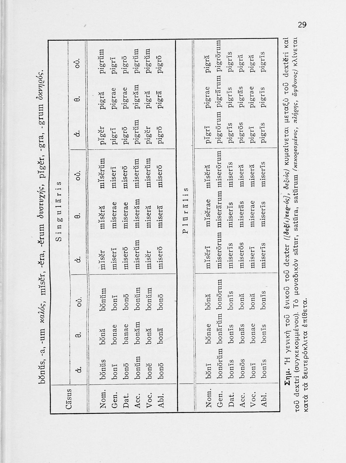 Σχολικό εγχειρίδιο Λατινικών Γυμνασίου που περιλαμβάνει γραμματική και συντακτικό και είναι χωρισμένο σε φθογγολογικό, τυπολογικό και ετυμολογικό μέρος.