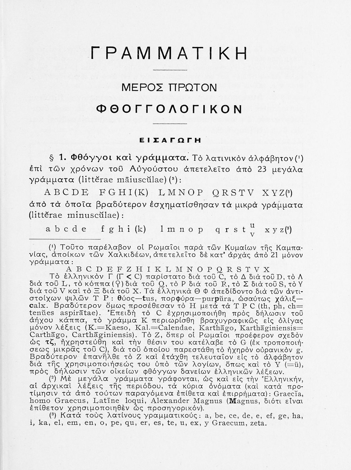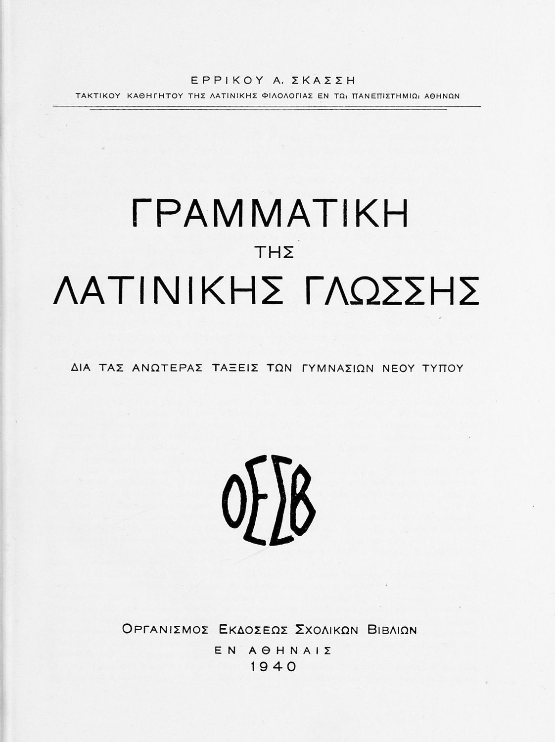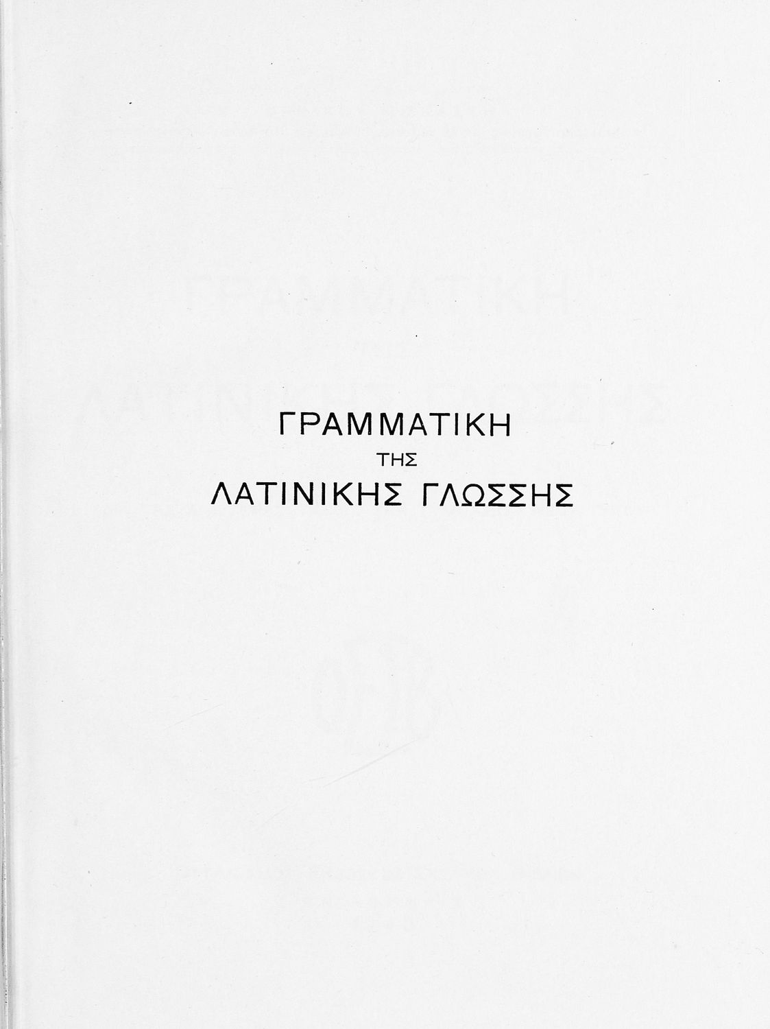 Σχολικό εγχειρίδιο Λατινικών Γυμνασίου που περιλαμβάνει γραμματική και συντακτικό και είναι χωρισμένο σε φθογγολογικό, τυπολογικό και ετυμολογικό μέρος.