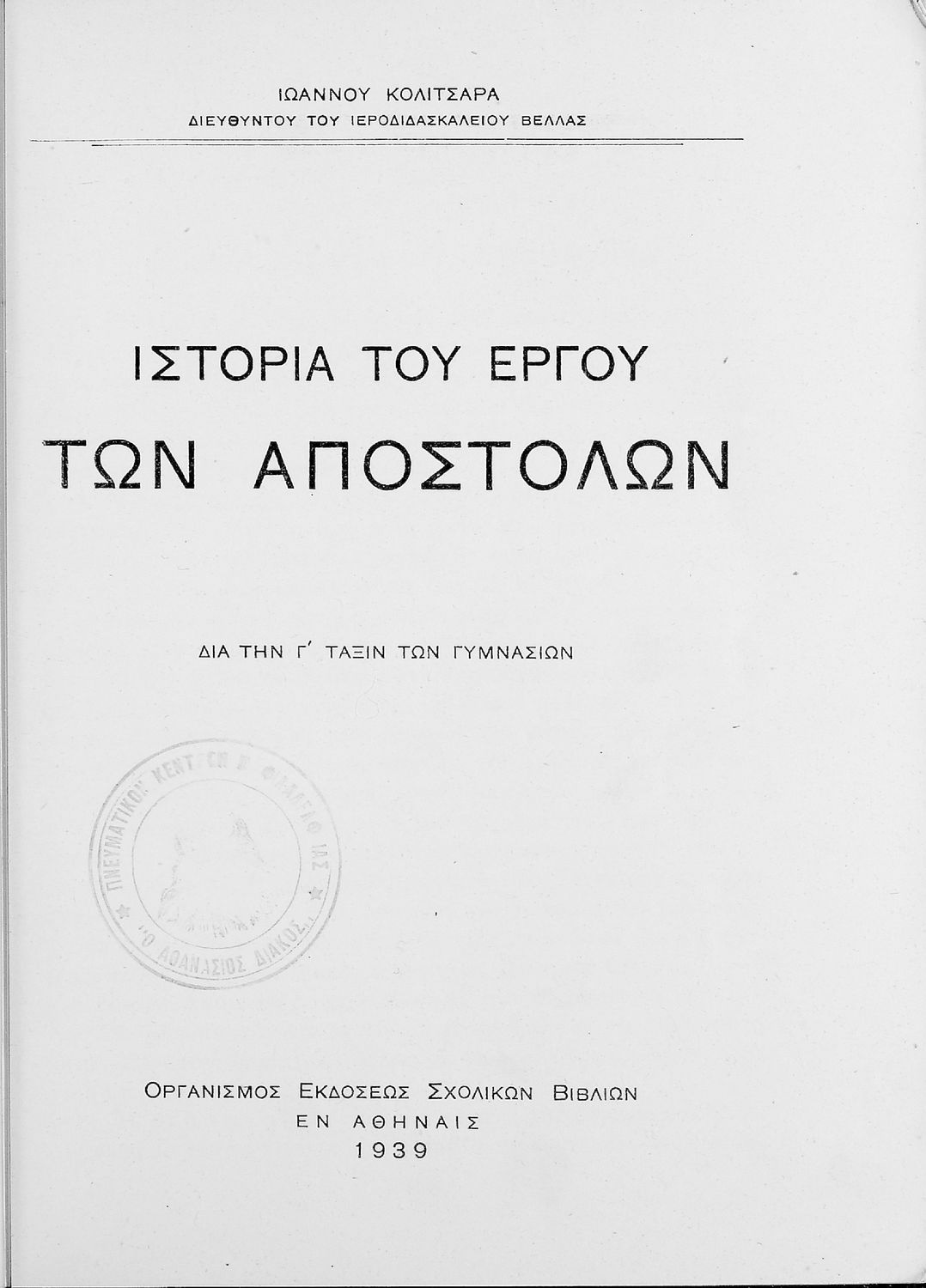 Τίτλος: Ιστορία του έργου των Αποστόλων δια την Γ΄ τάξιν των Γυμνασίων