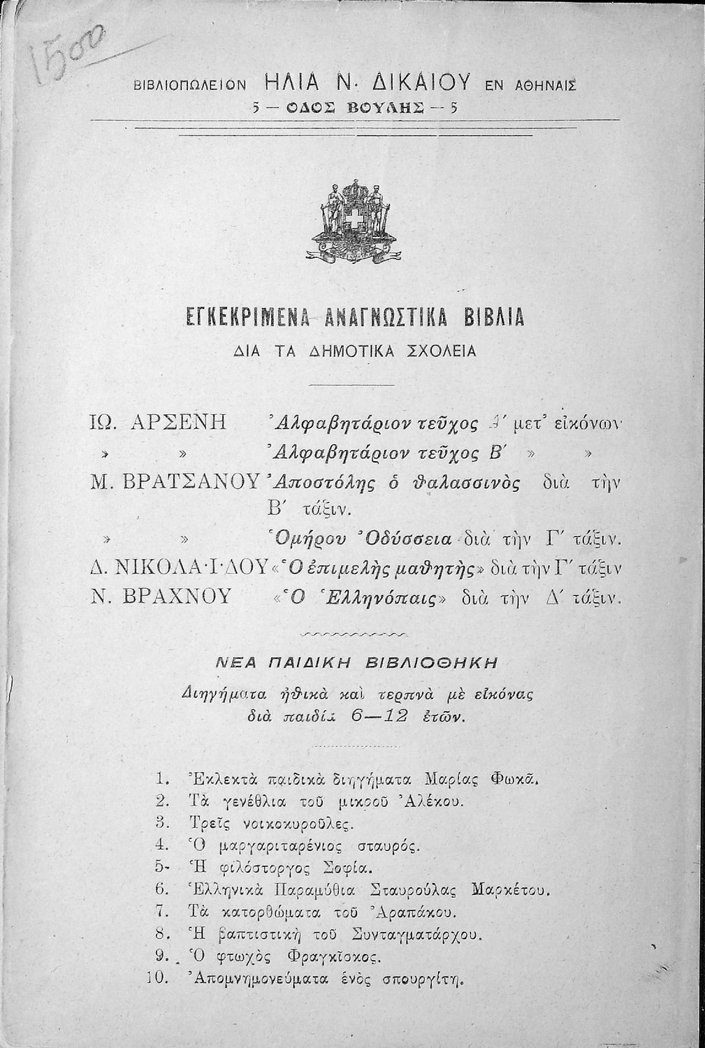 Σχολικό εγχειρίδιο Αρχαίων Ελληνικών για τις Α' Ελληνικού Σχολείου και Παρθεναγωγείου και την Ε΄ Δημοτικού που περιέχει κείμενα στην αρχαία ελληνική εμπνευσμένα από την ελληνική μυθολογία, και γραμματικές, ...