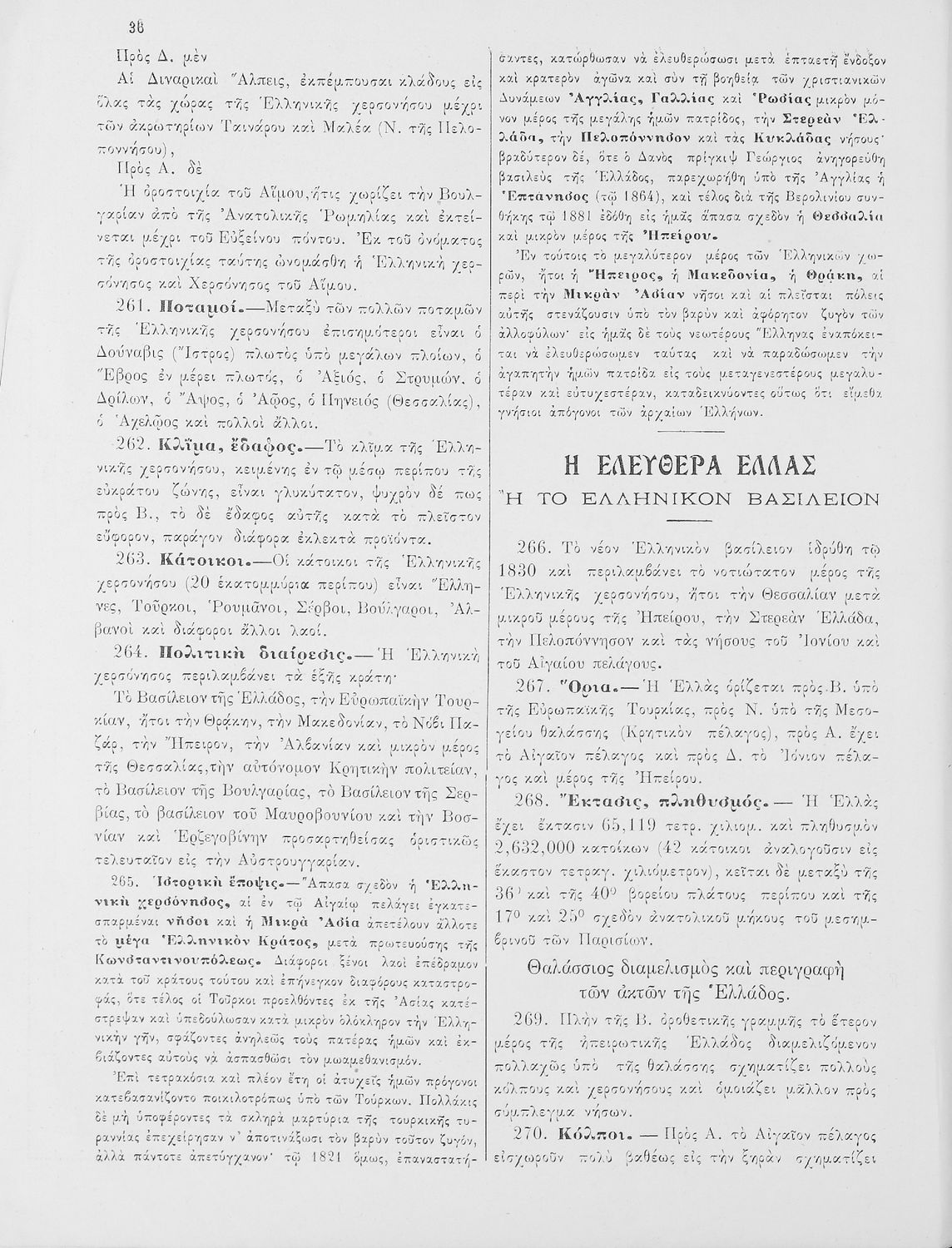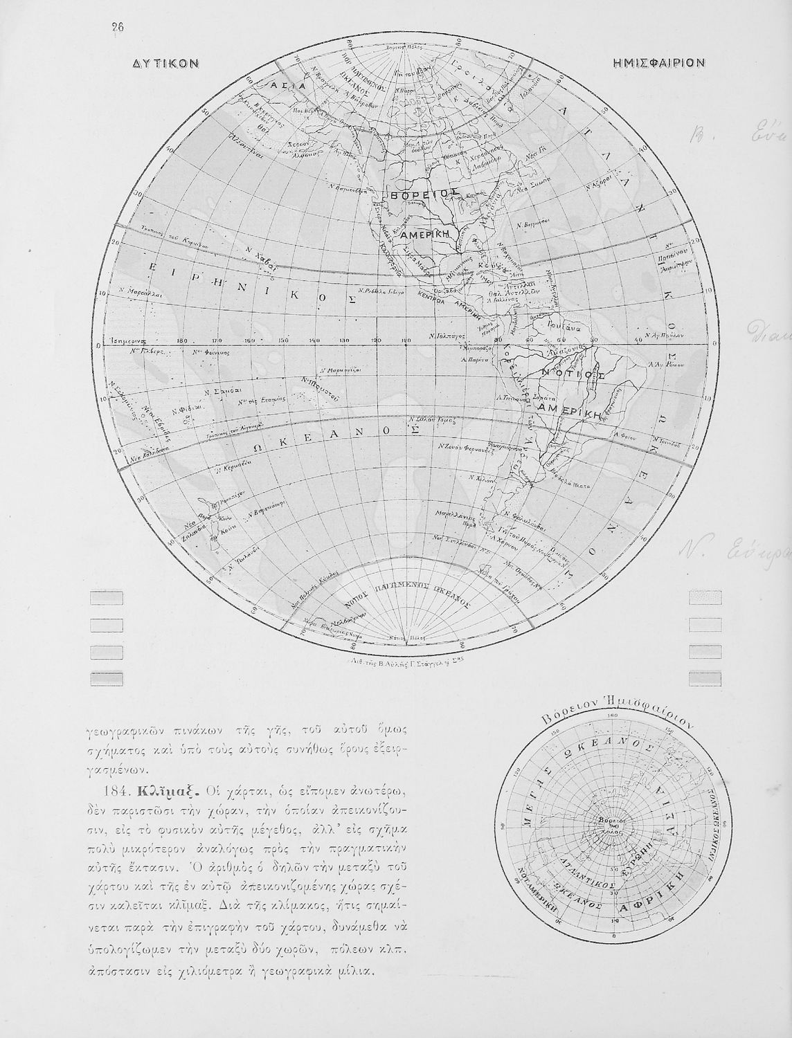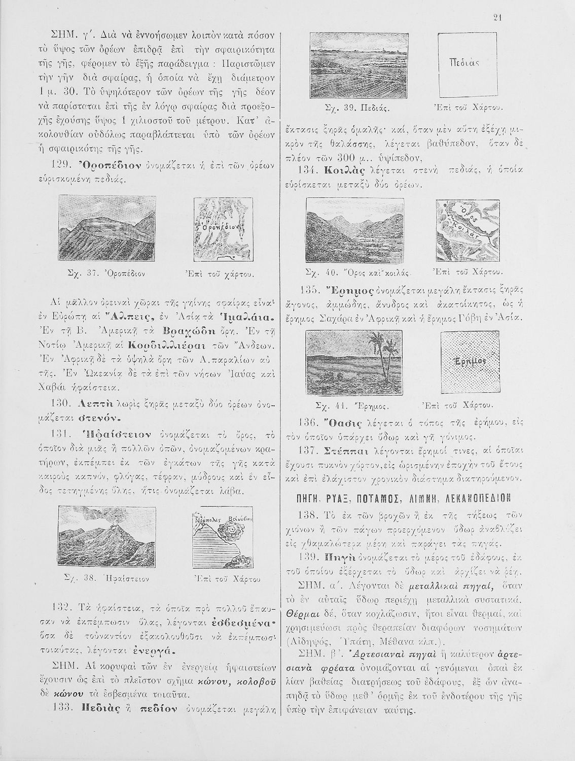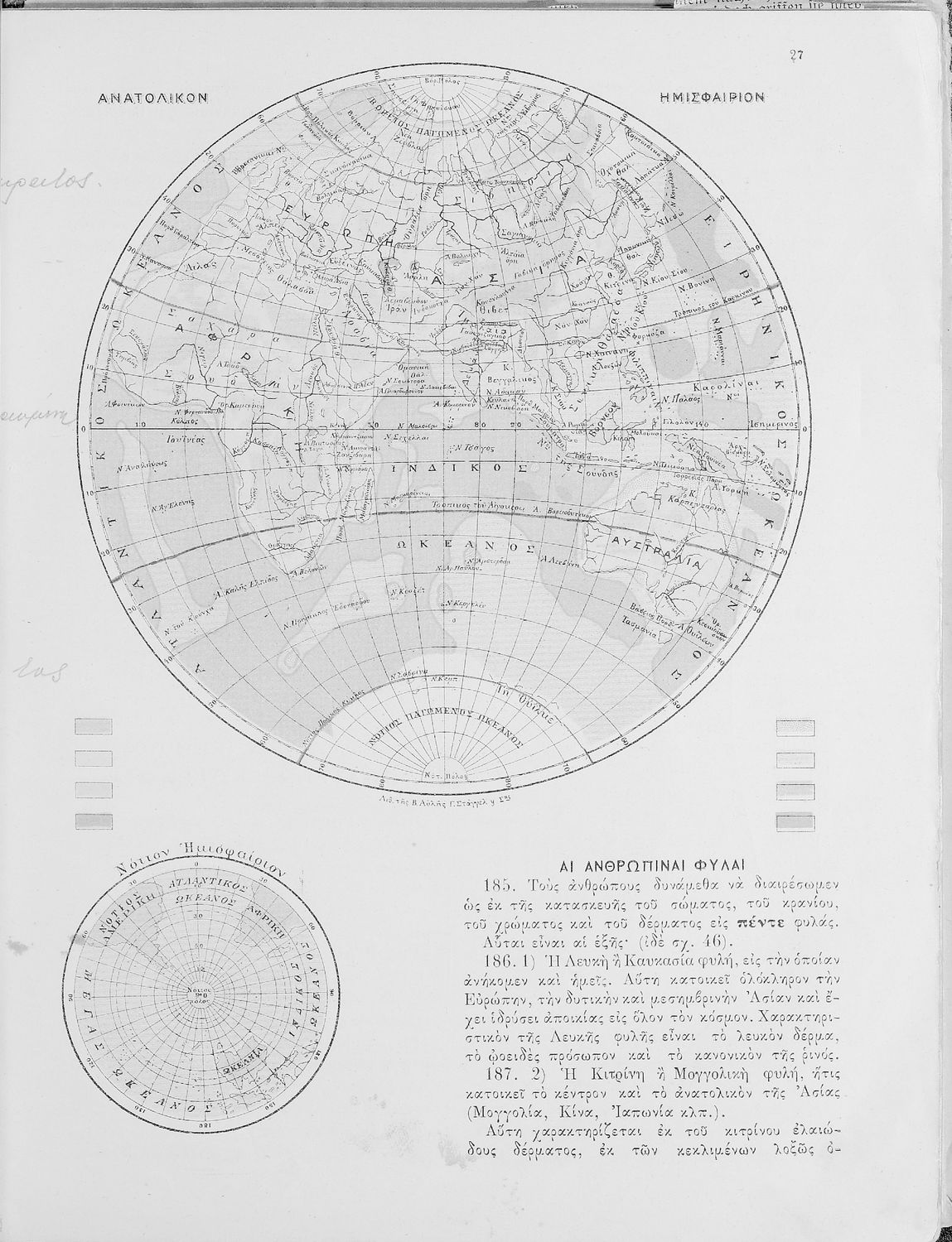 Σχολικό εγχειρίδιο Γεωγραφίας για τις Δ΄, Ε΄, ΣΤ΄, Ζ΄ Δημοτικού, Παρθεναγωγείων και Αστικών Σχολείων. Πρόκειται για βιβλίο φυσικής και πολιτικής γεωγραφίας της Ελλάδας και των Ηπείρων. Η Ελλάδα εξετάζεται με βάση τη διοικητική διαίρεση του τότε Βασιλείου της Ελλάδας.