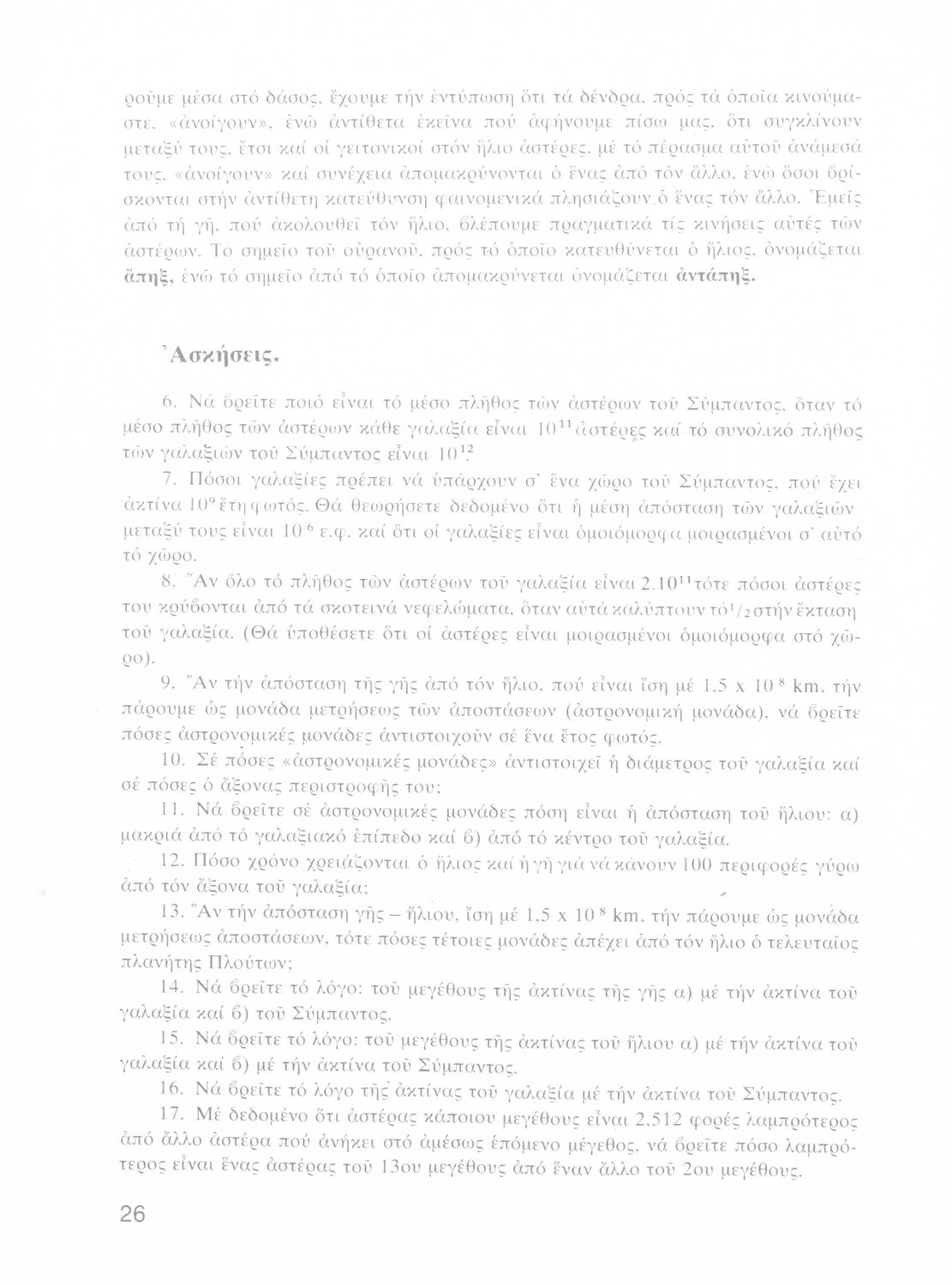 Σχολικό εγχειρίδιο Κοσμογραφίας Γ΄ Λυκείου που πραγματεύεται τη μορφή, σύσταση, μέγεθος και κίνηση των γαλαξιών και των πλανητών. Περιέχει στοιχεία αστροναυτικής και πίνακα με 88 αστερισμούς, τα διεθνή ονόματα