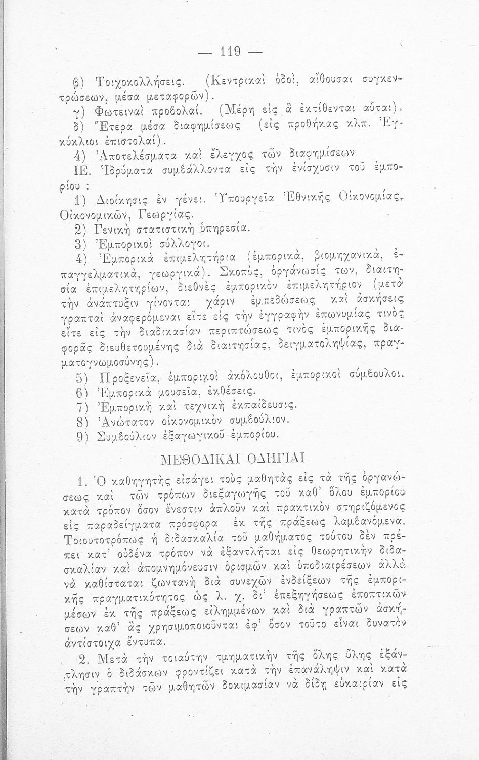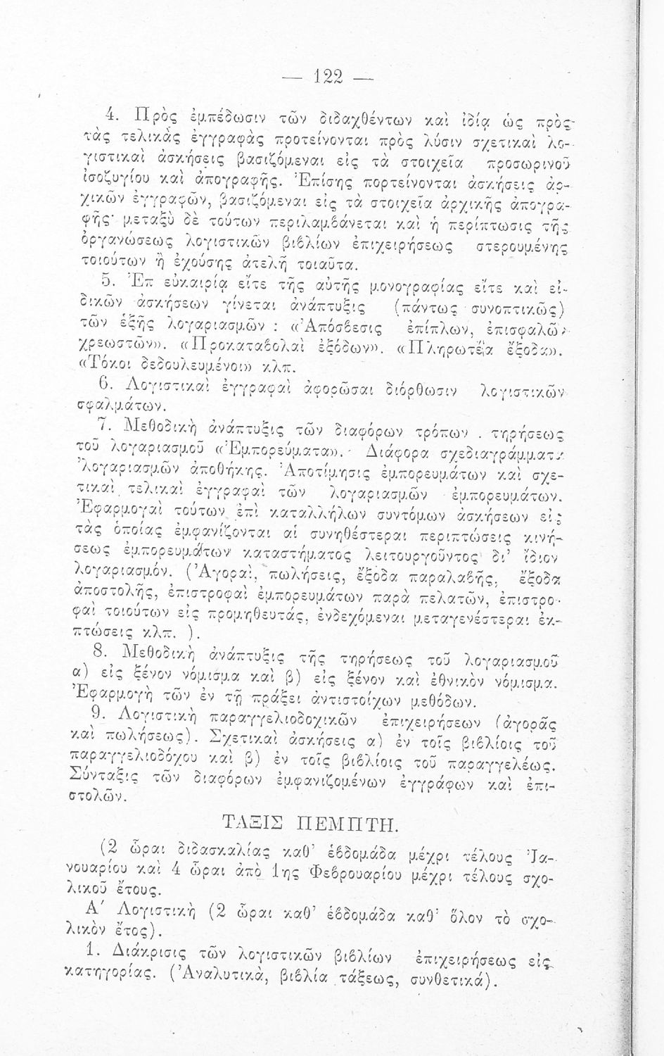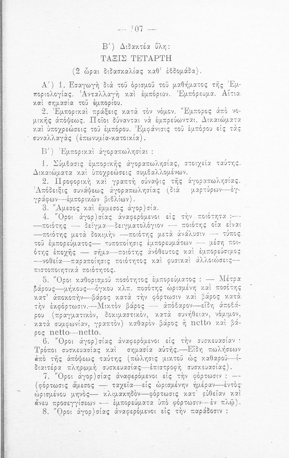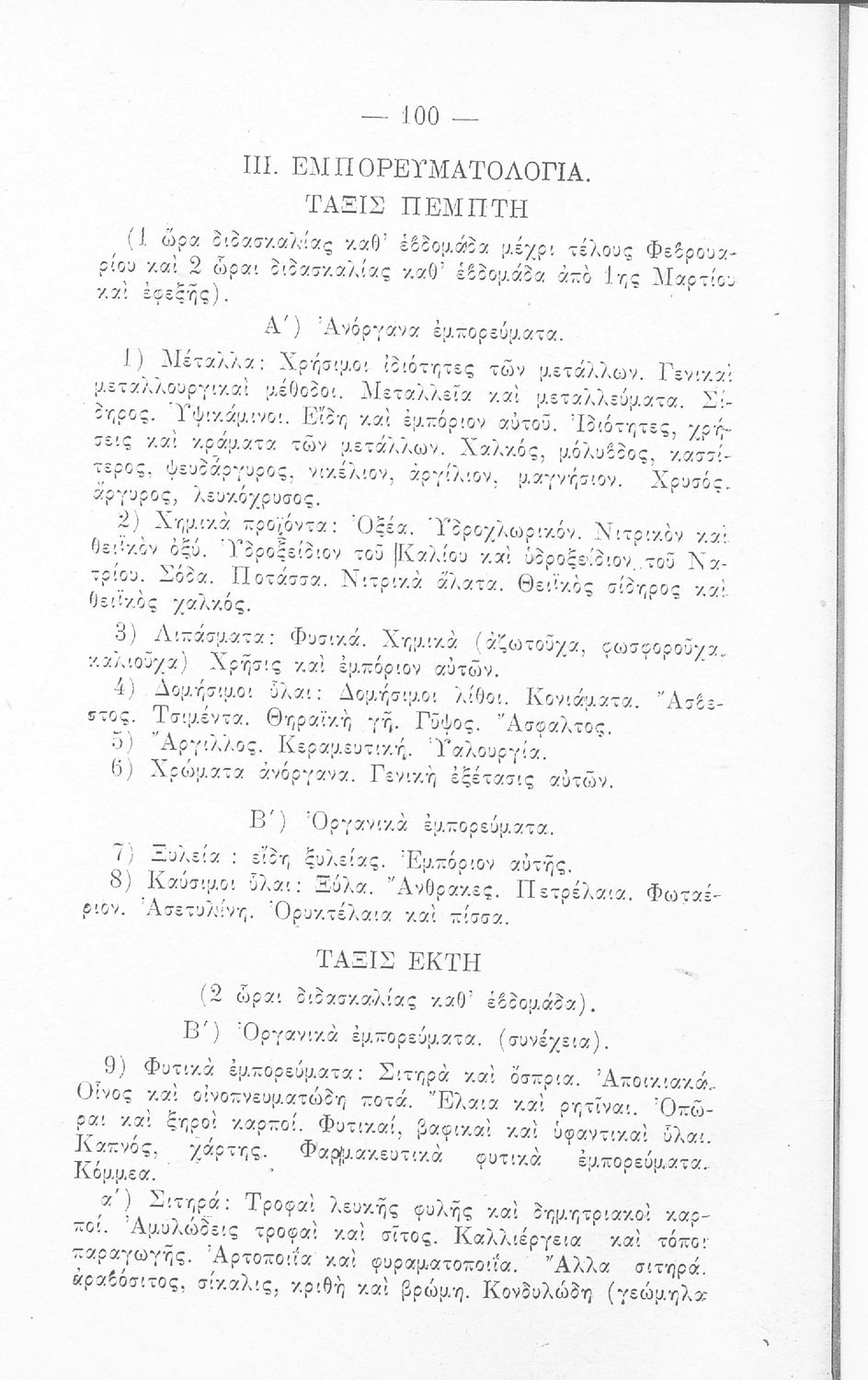 Αναλυτικόν Πρόγραμμα των Διδασκομένων Μαθημάτων εν ταις Μέσαις Εξαταξίοις Εμπορικαίς Σχολαίς.