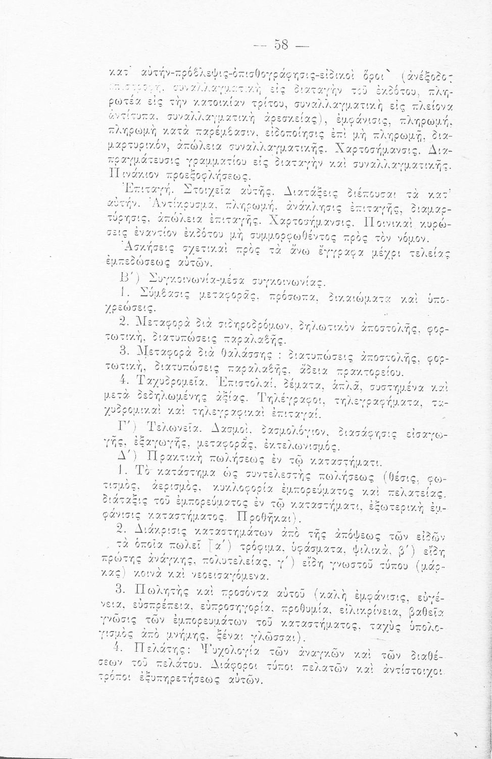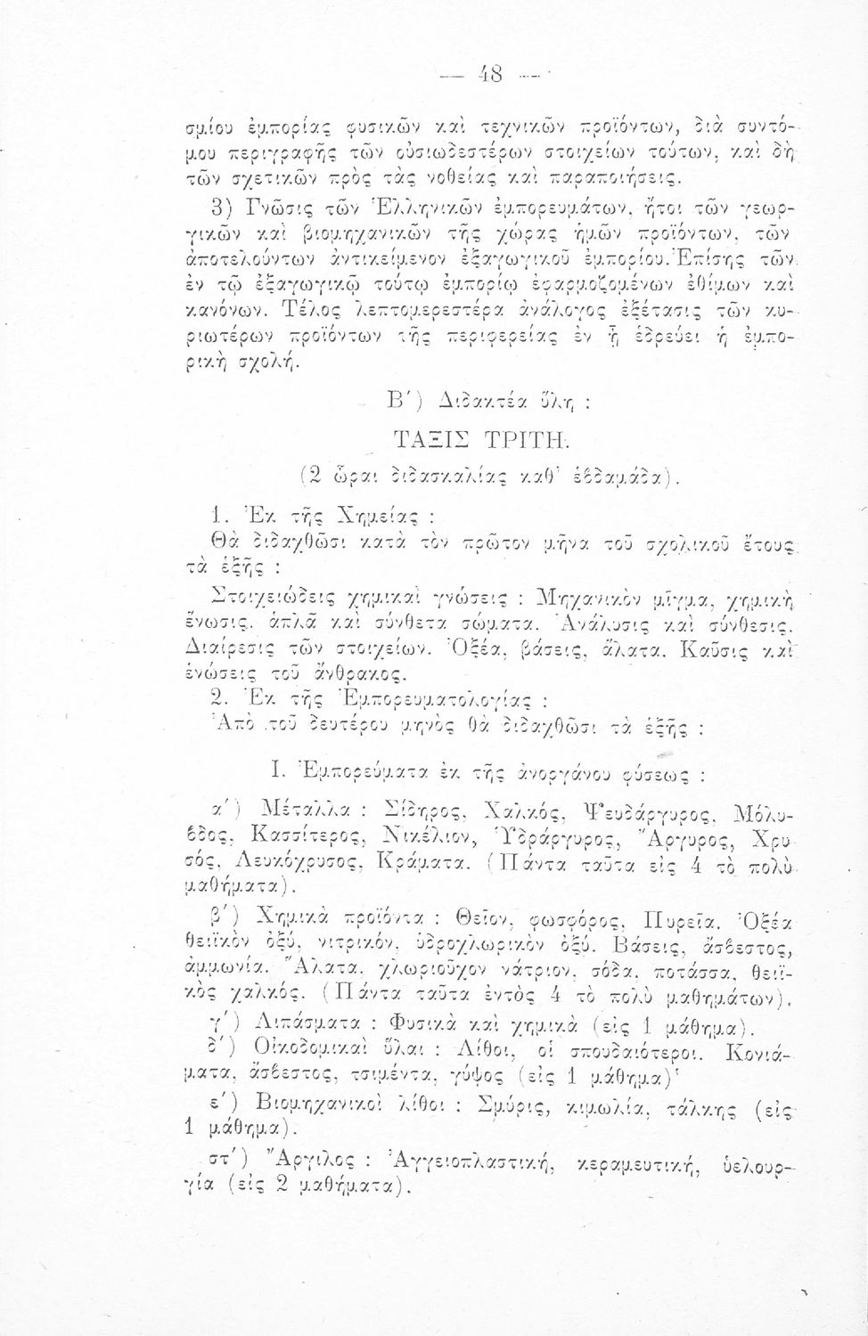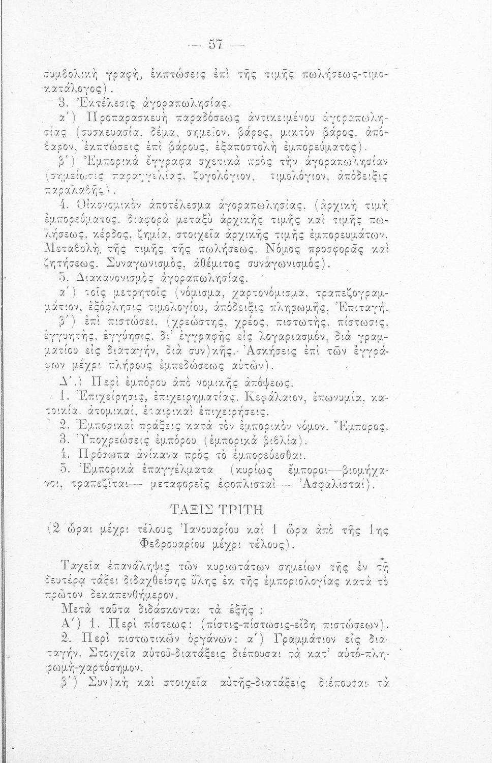 Έκδοση του Υπουργείου Εθνικής Οικονομίας που περιλαμβάνει το αναλυτικό πρόγραμμα των μαθημάτων που διδάσκονταν στις μεσαίες τάξεις των εμπορικών σχολών.