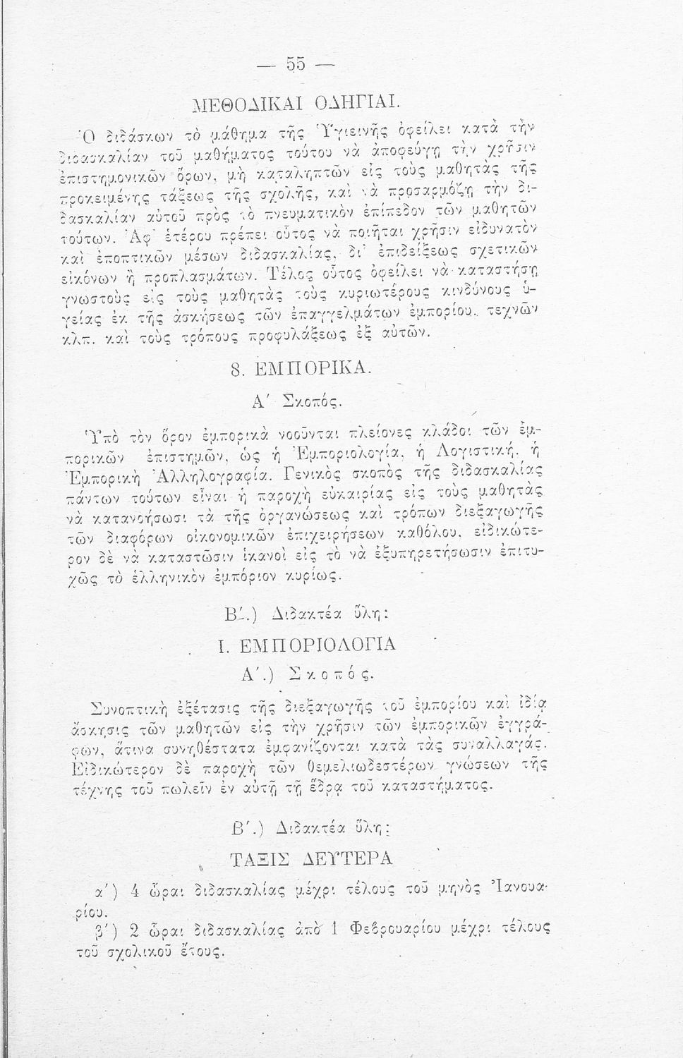 Έκδοση του Υπουργείου Παιδείας και Θρησκευμάτων που περιλαμβάνει τα ωρολόγια και αναλυτικά προγράμματα των μαθημάτων που διδάσκονται στις Εμπορικές Σχολές.
