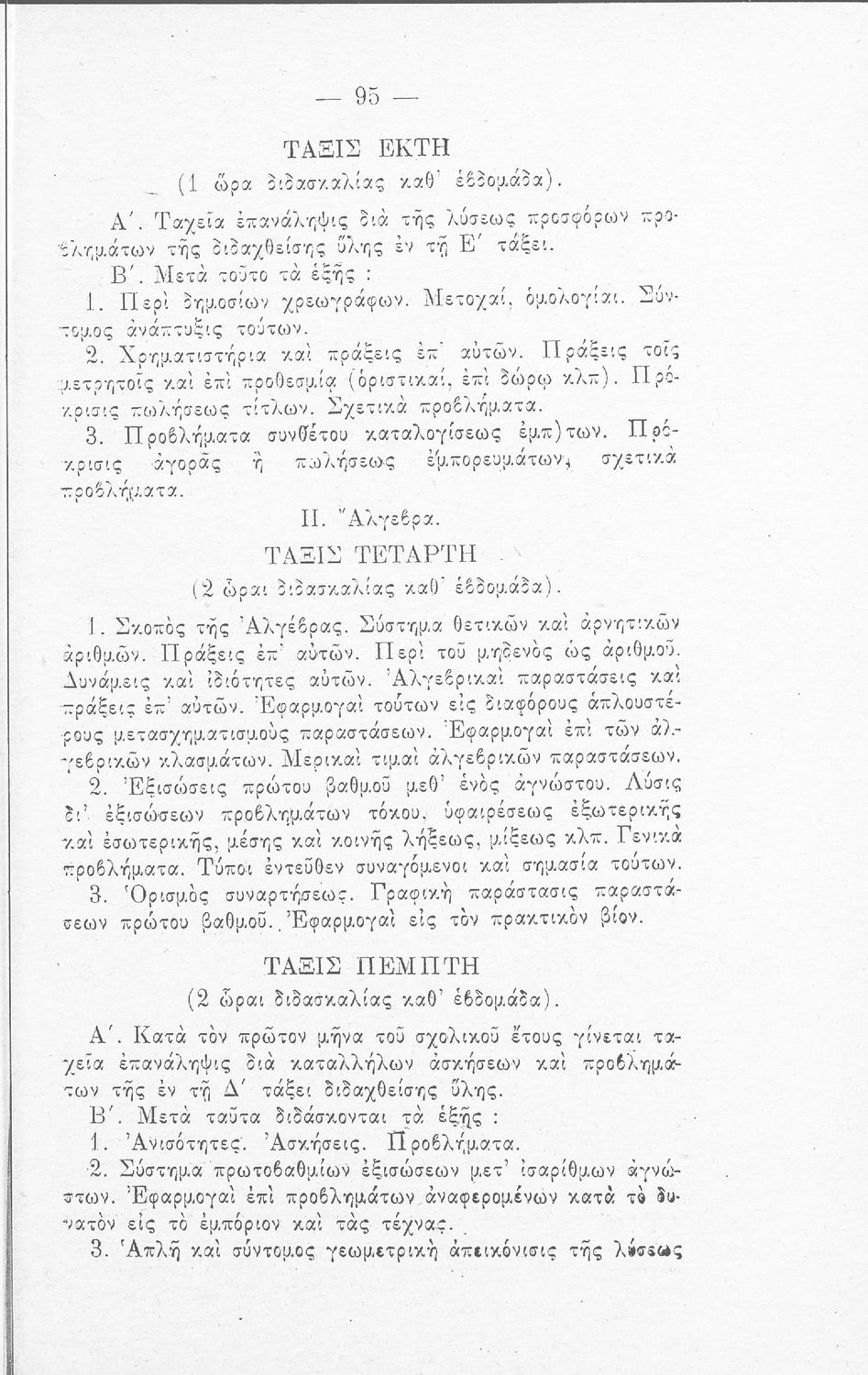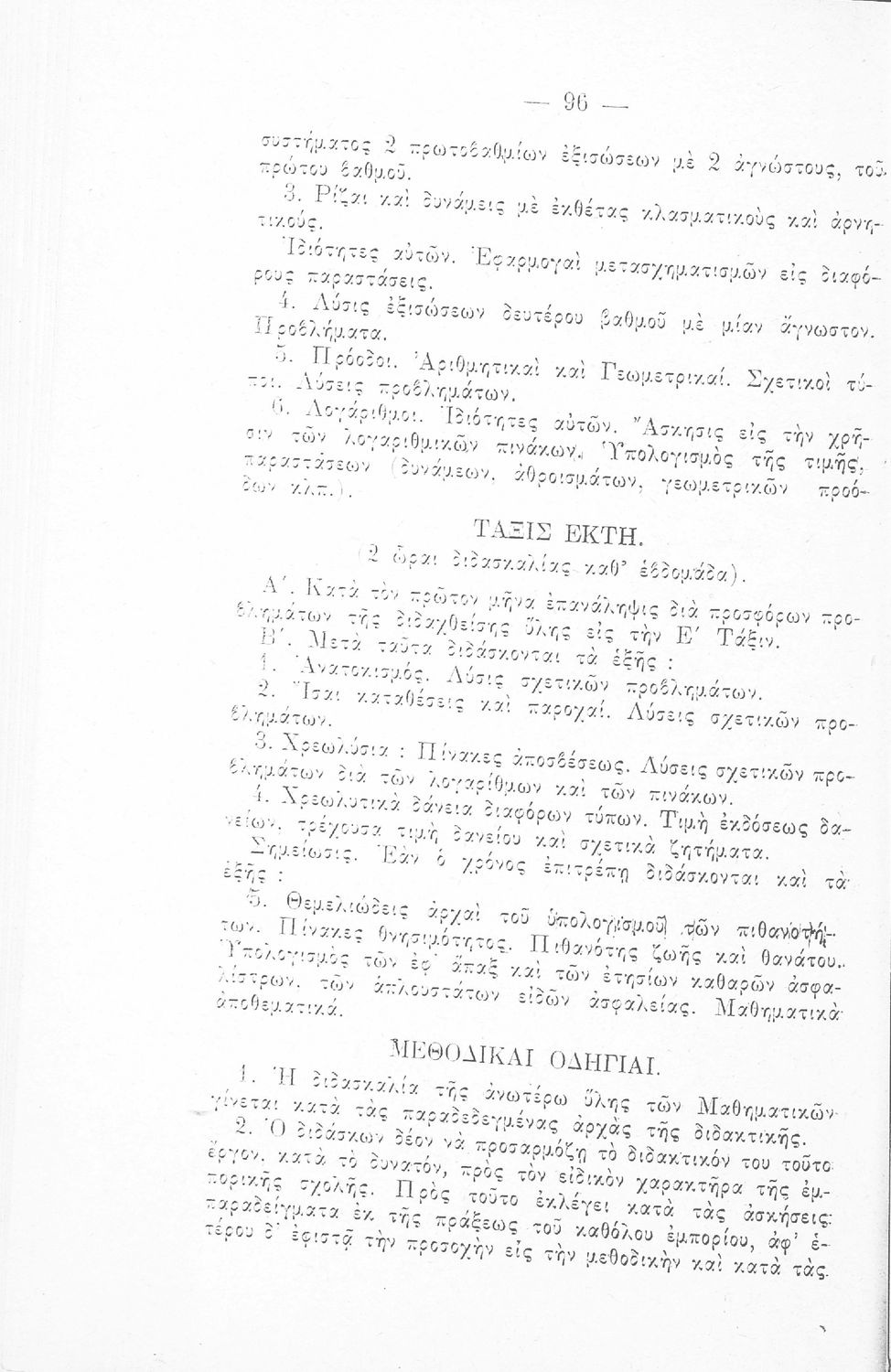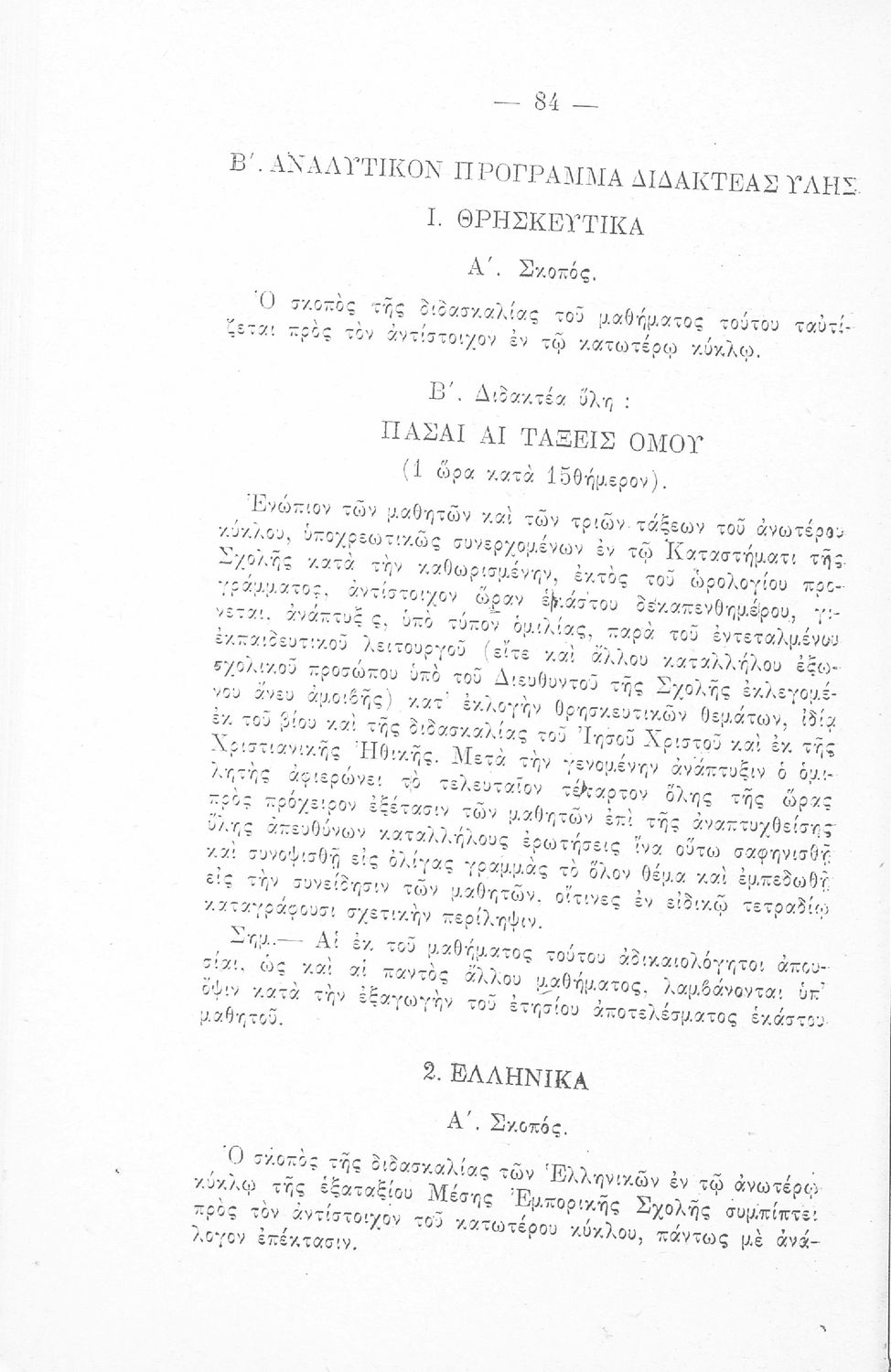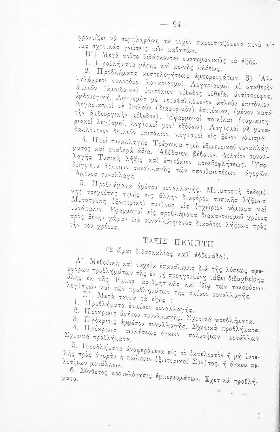 Αναλυτικόν Πρόγραμμα των Διδασκομένων Μαθημάτων εν ταις Μέσαις Εξαταξίοις Εμπορικαίς Σχολαίς.