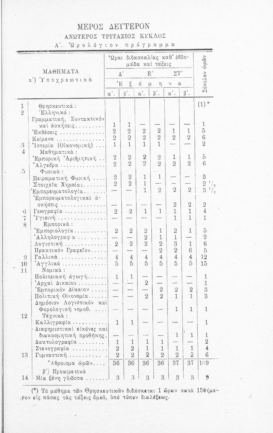 Έκδοση του Υπουργείου Παιδείας και Θρησκευμάτων που περιλαμβάνει τα ωρολόγια και αναλυτικά προγράμματα των μαθημάτων που διδάσκονται στις Εμπορικές Σχολές.