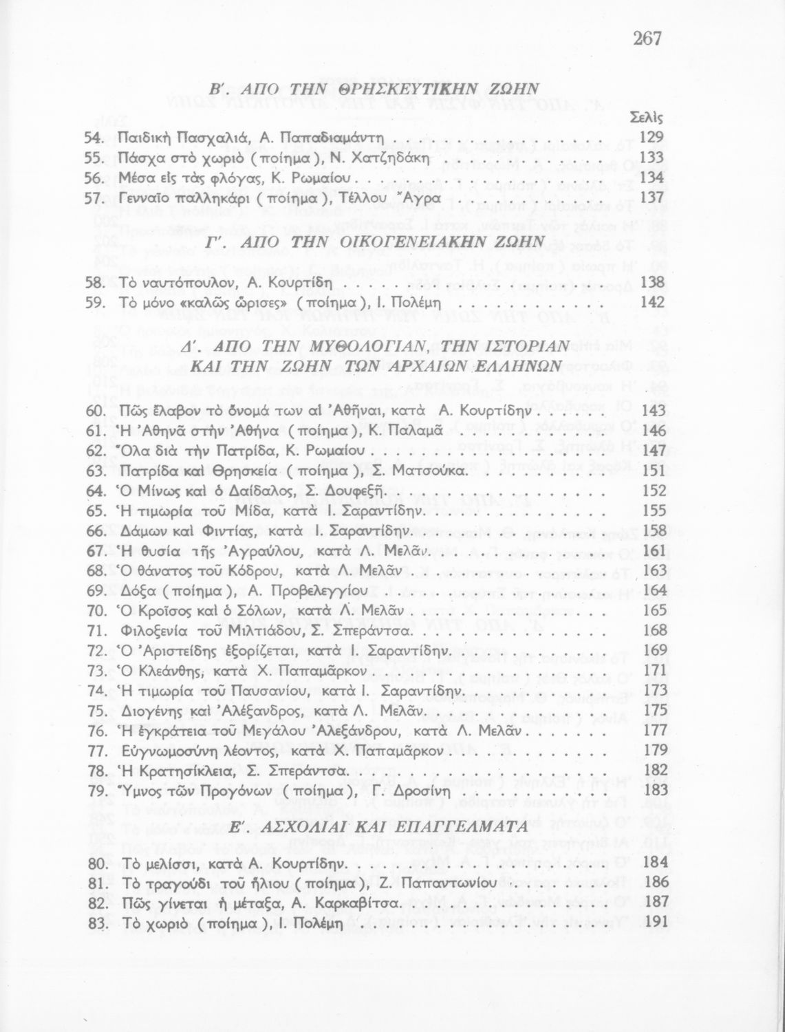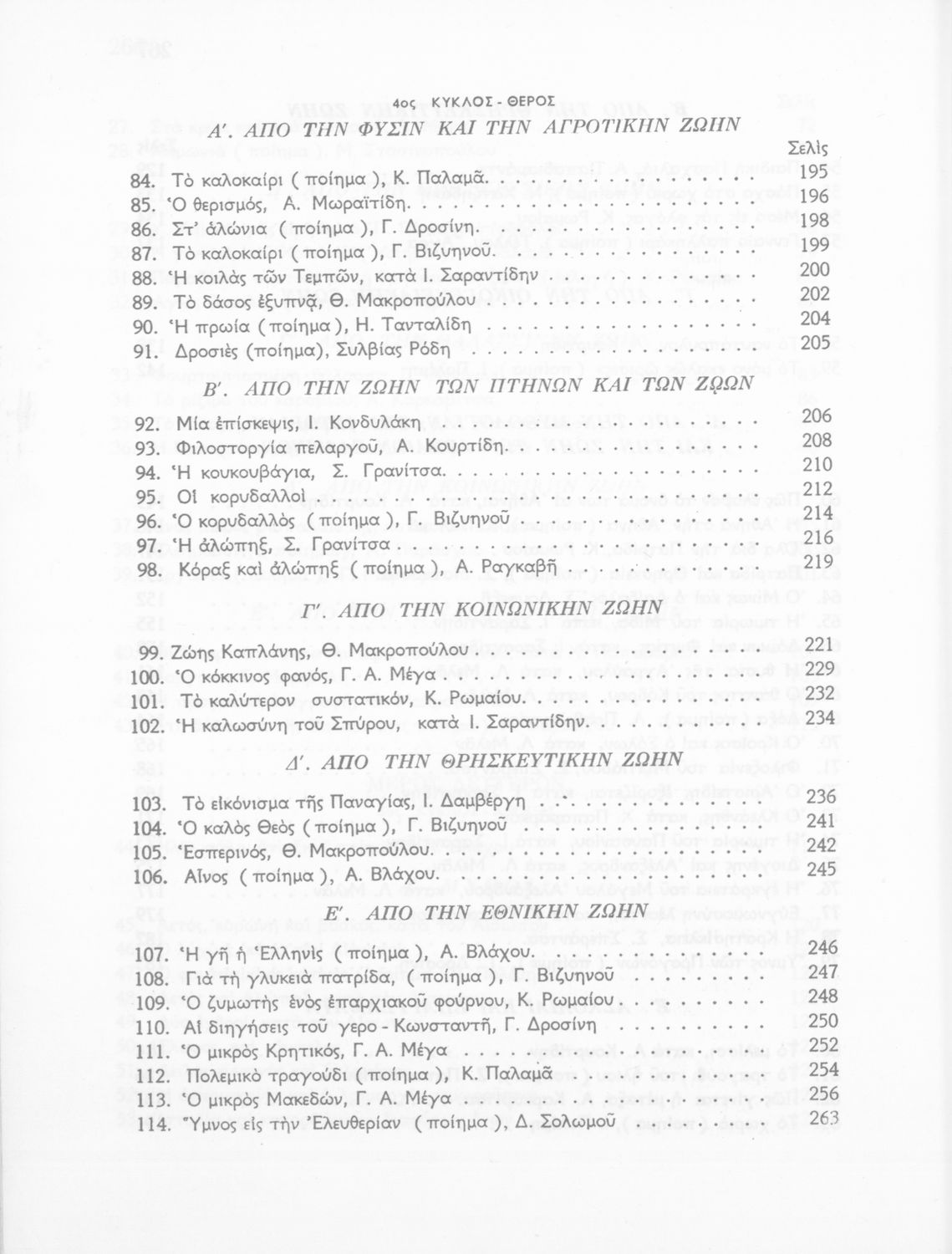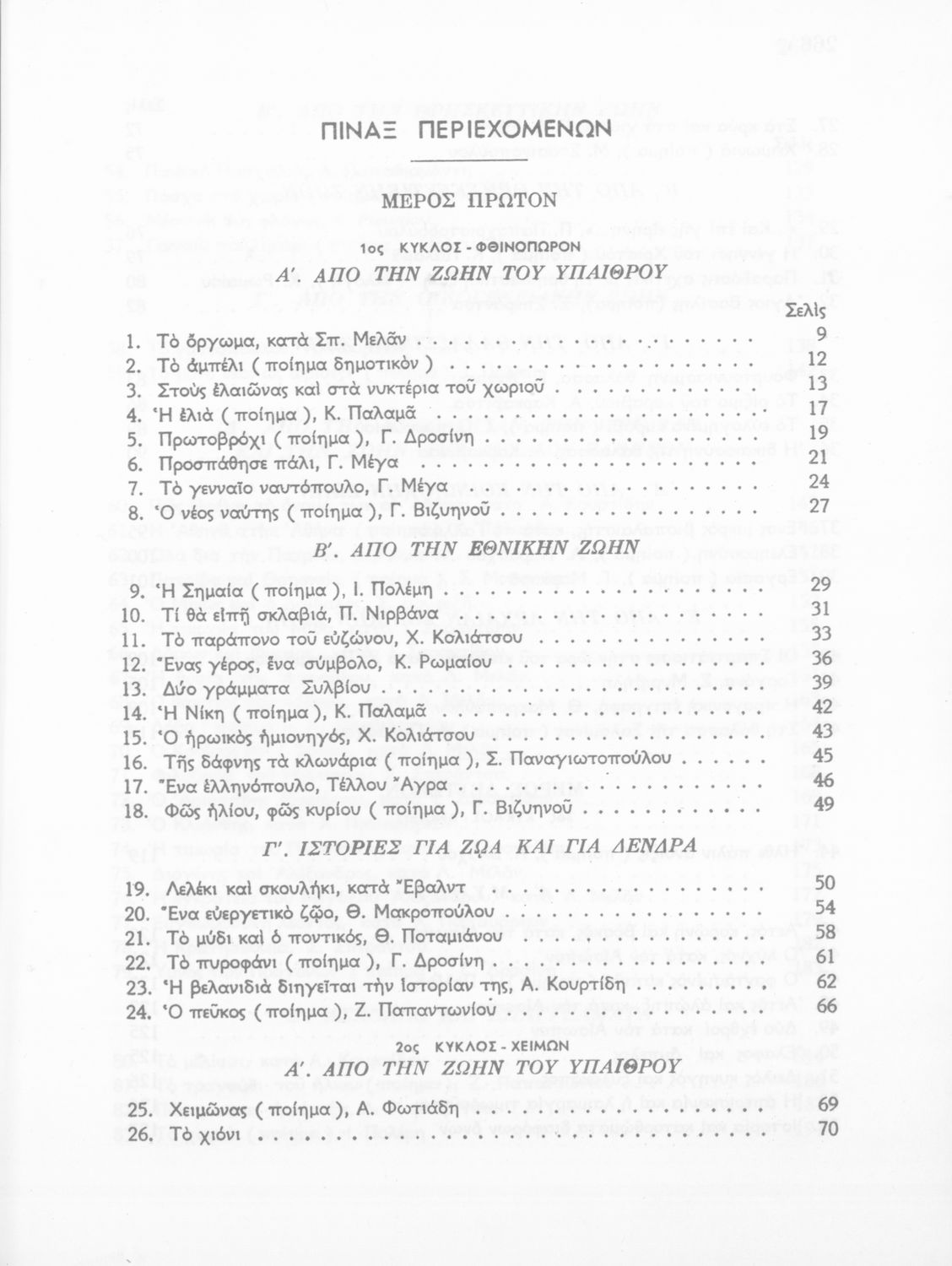 Αναγνωστικό Δ' Δημοτικού που είναι χωρισμένο σύμφωνα με τις εποχές του χρόνου και περιλαμβάνει ποιήματα και πεζά εμπνευσμένα από τη ζωή στην ύπαιθρο, την εθνική, οικογενειακή και κοινωνική ζωή, τη θρησκευτική ...
