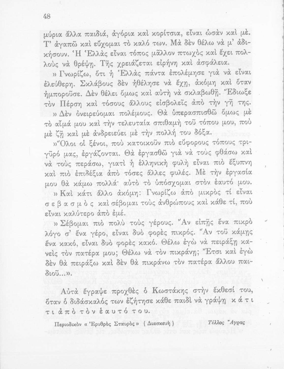 Βαθμίδα εκπαίδευσης: Πρωτοβάθμια Τάξη: Δ' Δημοτικού Μάθημα: Νέα Ελληνικά Γλώσσα: Καθαρεύουσα Παρουσίαση περιεχομένου: Αναγνωστικό Δ' Δημοτικού που είναι χωρισμένο σύμφωνα με τις εποχές του χρόνου και περιλαμβάνει ποιήματα και πεζά εμπνευσμένα από τη ζωή στην ύπαιθρο, την εθνική, οικογενειακή και κοινωνική ζωή, τη θρησκευτική παράδοση, τις ασχολίες των ανθρώπων, και την ελληνική φύση, ιστορία και μυθολογία. Φέρει το σύμβολο της δικτατορίας. |