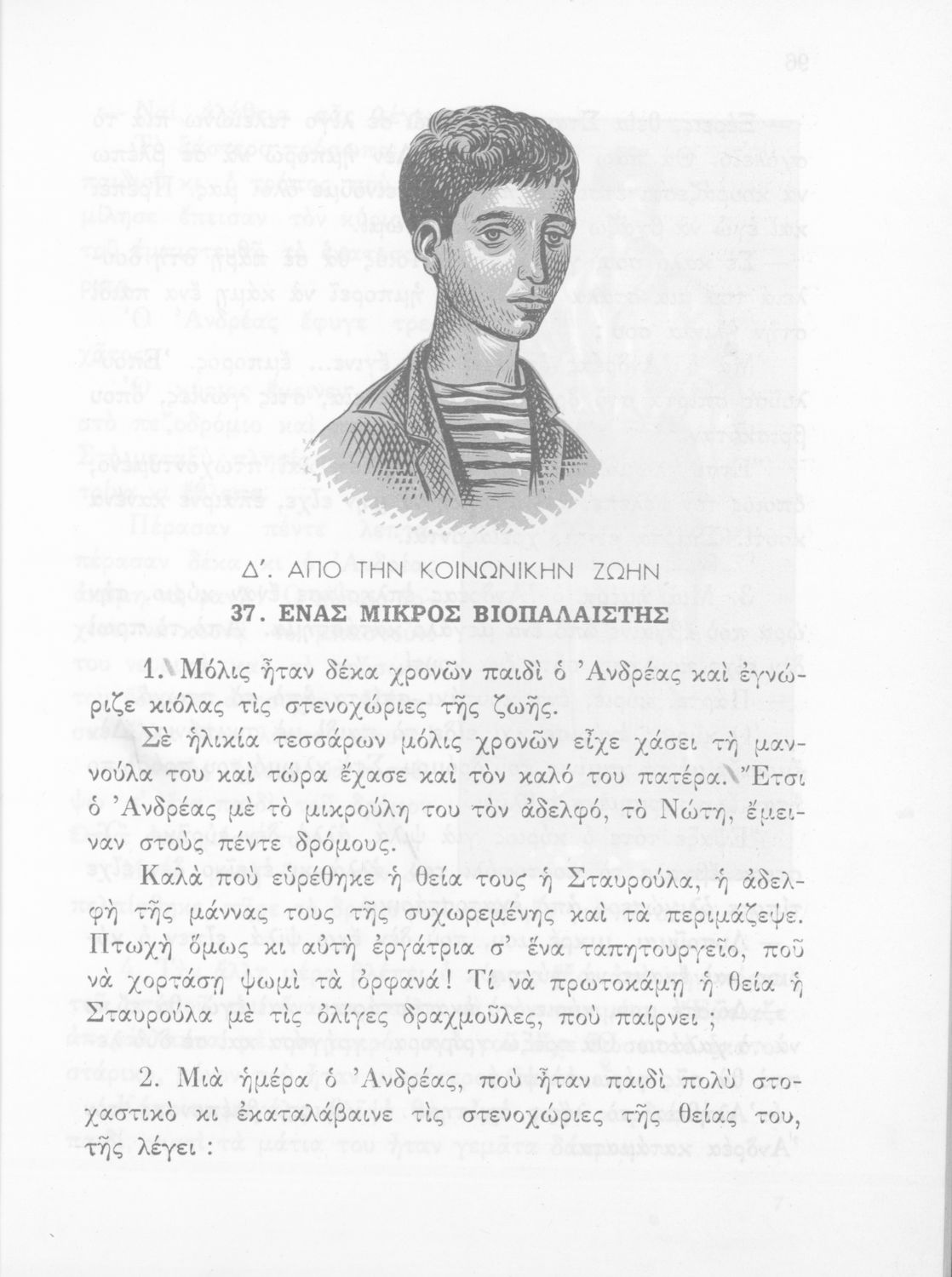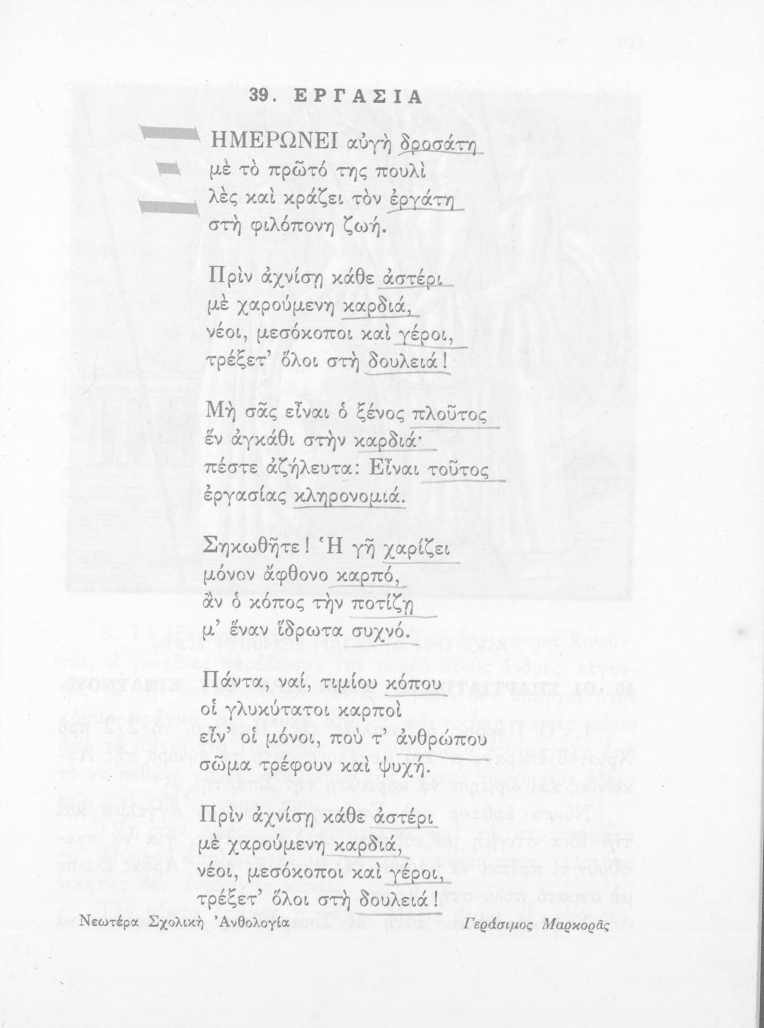 Βαθμίδα εκπαίδευσης: Πρωτοβάθμια Τάξη: Δ' Δημοτικού Μάθημα: Νέα Ελληνικά Γλώσσα: Καθαρεύουσα Παρουσίαση περιεχομένου: Αναγνωστικό Δ' Δημοτικού που είναι χωρισμένο σύμφωνα με τις εποχές του χρόνου και περιλαμβάνει ποιήματα και πεζά εμπνευσμένα από τη ζωή στην ύπαιθρο, την εθνική, οικογενειακή και κοινωνική ζωή, τη θρησκευτική παράδοση, τις ασχολίες των ανθρώπων, και την ελληνική φύση, ιστορία και μυθολογία. Φέρει το σύμβολο της δικτατορίας. |