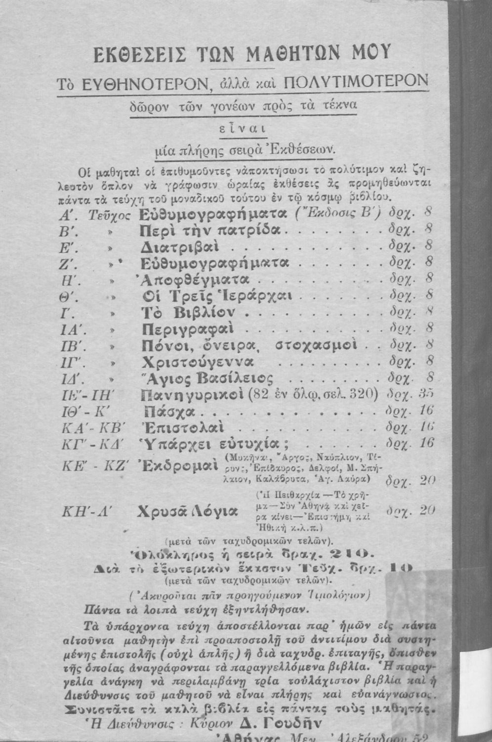 Εκδότης: Τυπογραφείο: Νικ. Σ. Μπαξεβανάκις Έτος έκδοσης: 1930 Τόπος έκδοσης: Αθήνα Υπουργική απόφαση / Σύμβαση: 42433/4-8-1933 Έτος έγκρισης: 1933 |