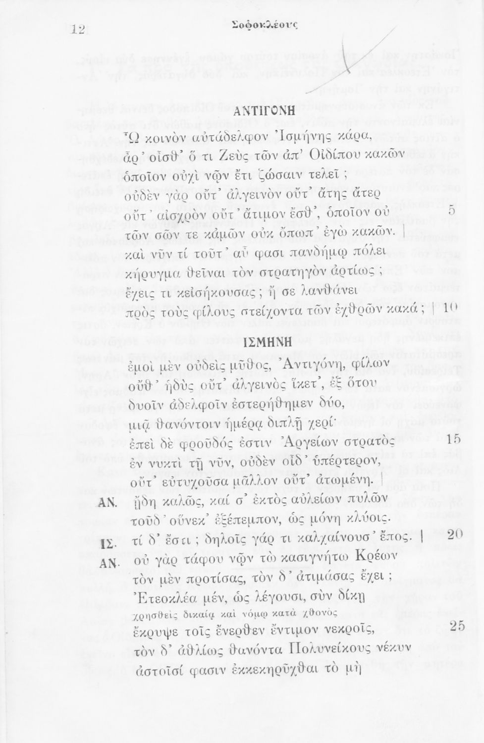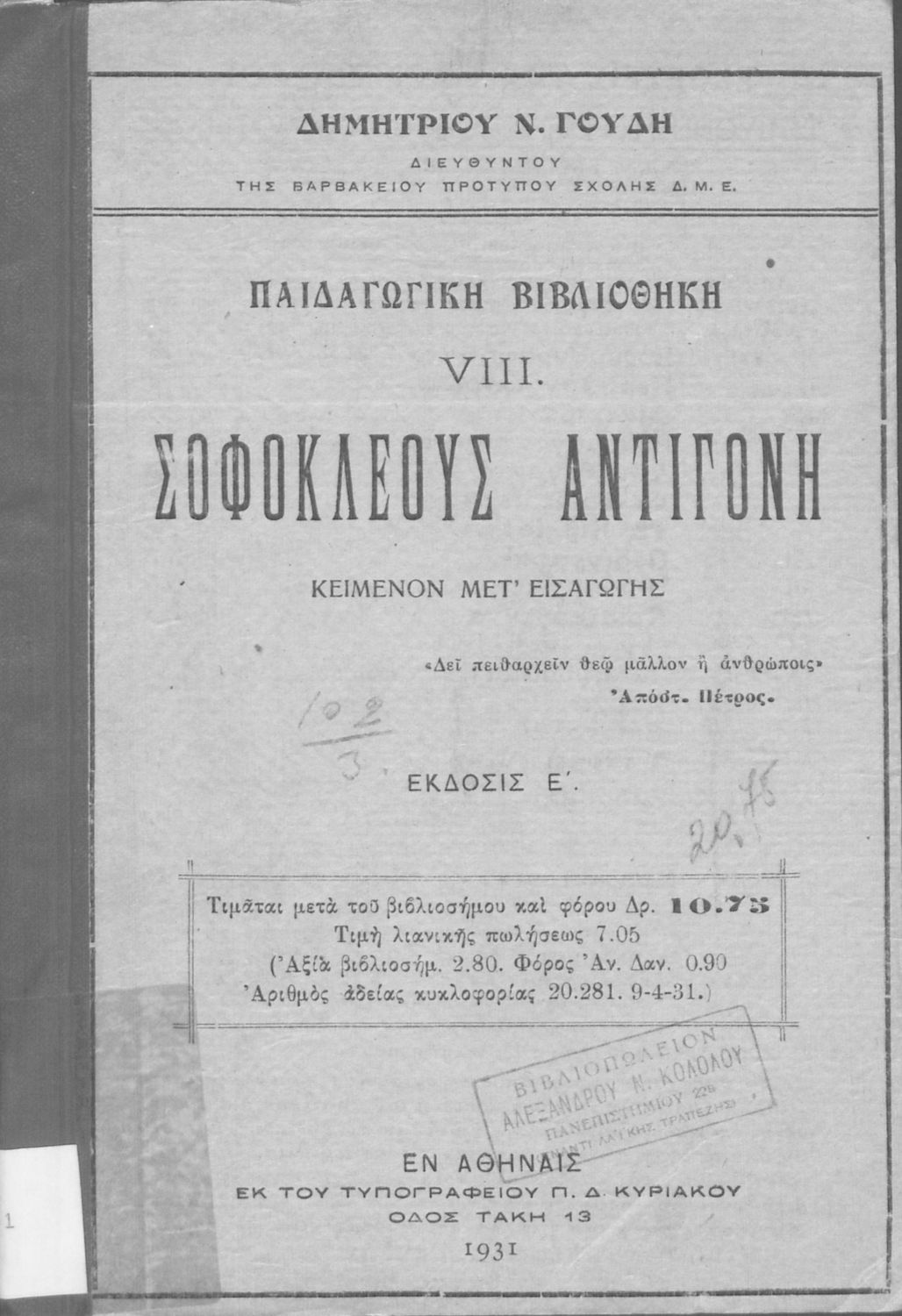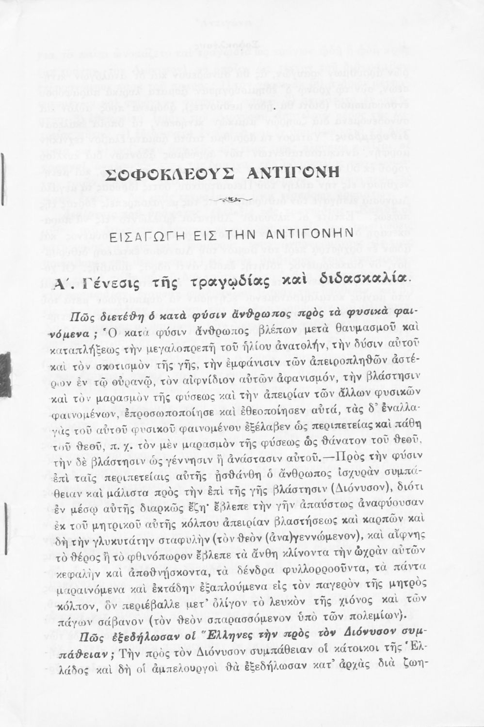 Μαθητικό βοήθημα της Δ΄ Γυμνασίου για το μάθημα των Αρχαίων Ελληνικών που περιλαμβάνει την Αντιγόνη του Σοφοκλή, πραγματολογικά σχόλια και λεξιλογικές παρατηρήσεις. Ο συγγραφέας ήταν Διευθυντής στη Βαρβάκειο πρότυπο σχολή.