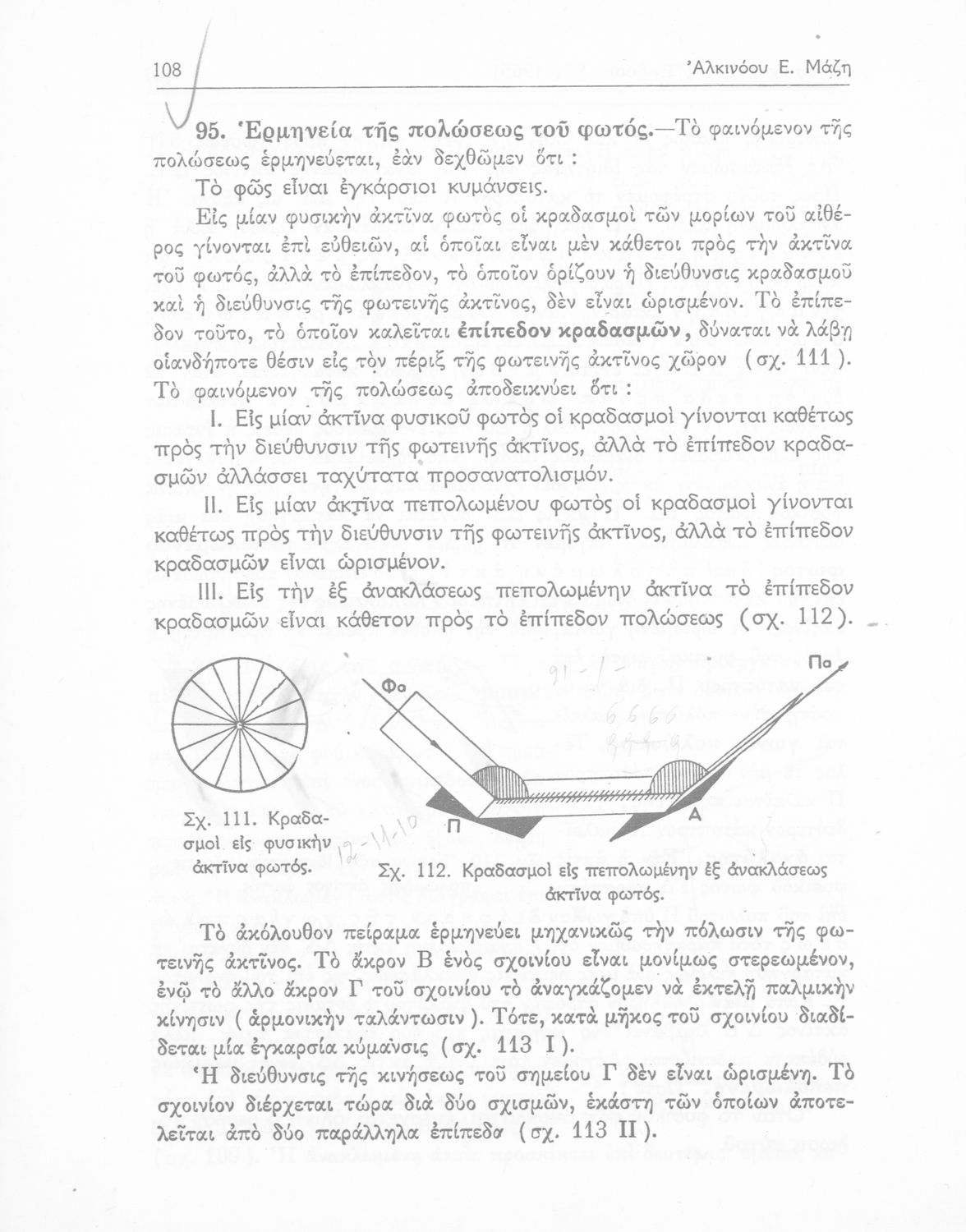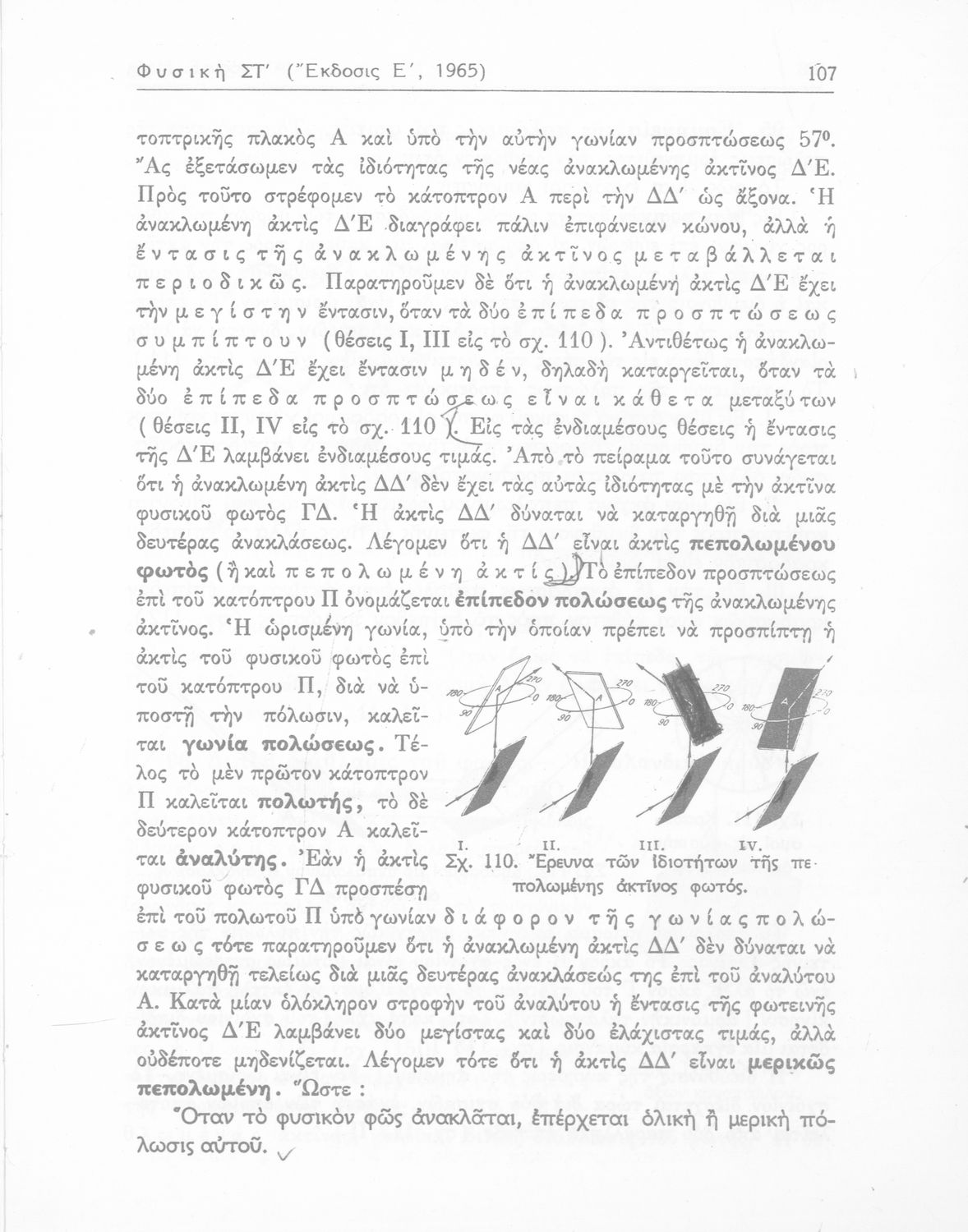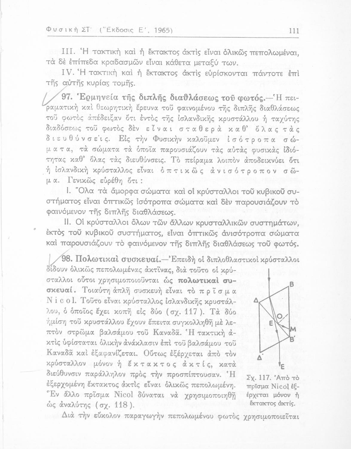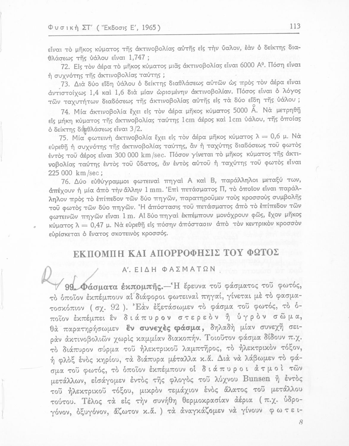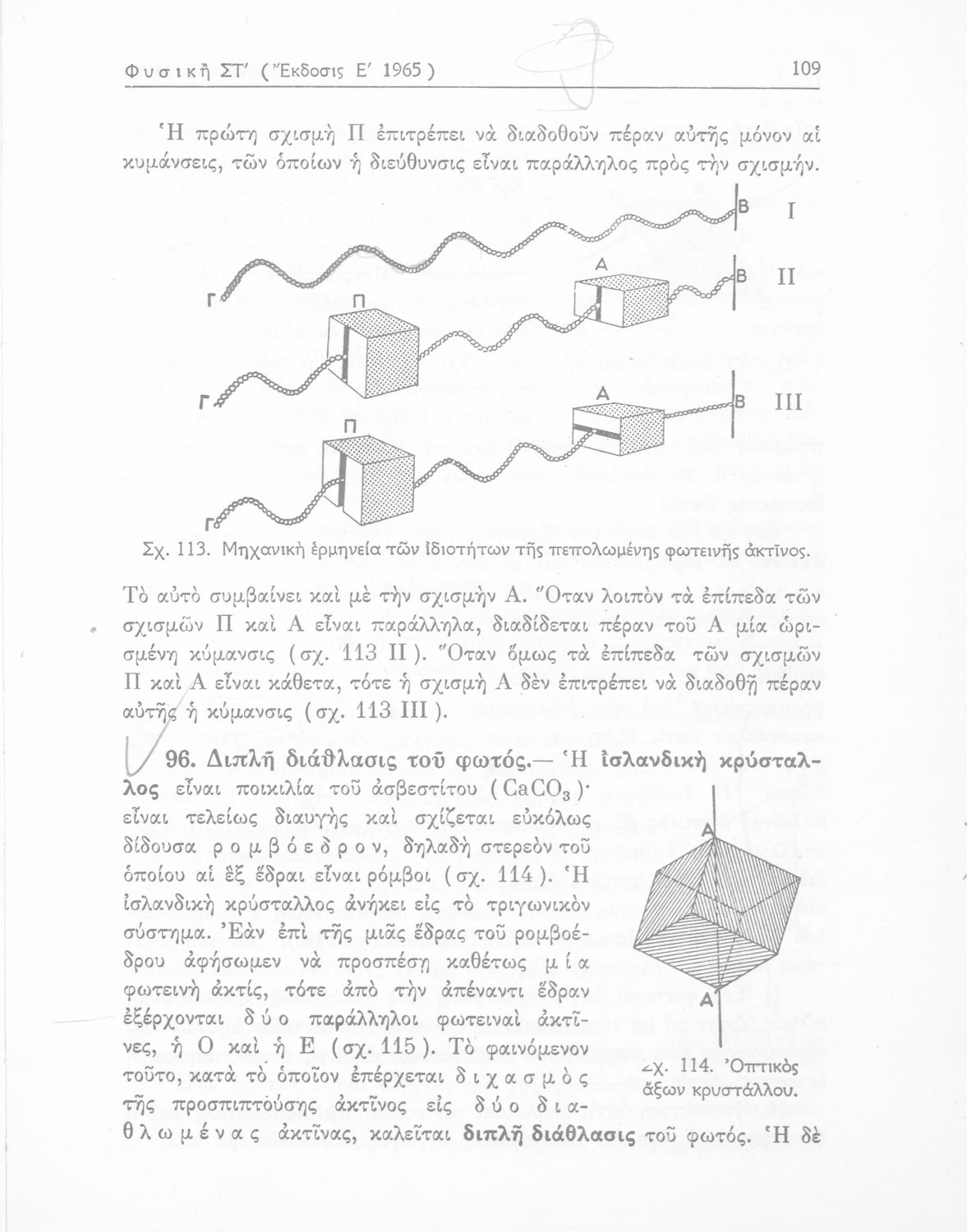 Σχολικό εγχειρίδιο Φυσικής. Το βιβλίο χωρίζεται σε τέσσερα μέρη καθένα από τα οποία περιγράφει συγκεκριμένο πεδίο της φυσικής (οπτική, μαγνητισμός, ηλεκτρισμός κλπ.). Ερμηνεύονται τα φυσικά μεγέθη, δίνονται οι ορισμοί και οι θεμελιώδης έννοιες για όλα τα πεδία ξεχωριστά.