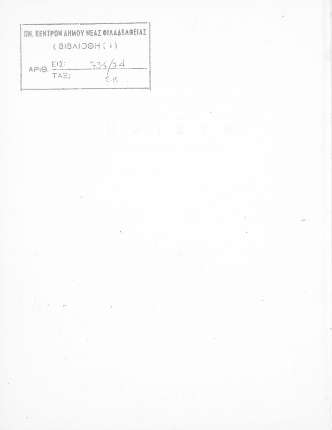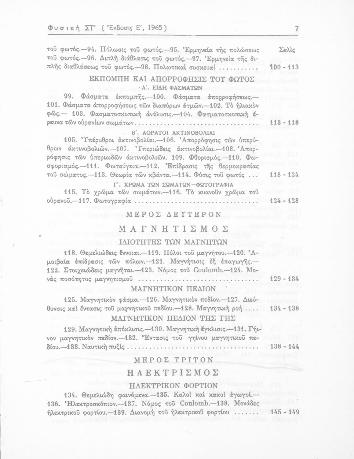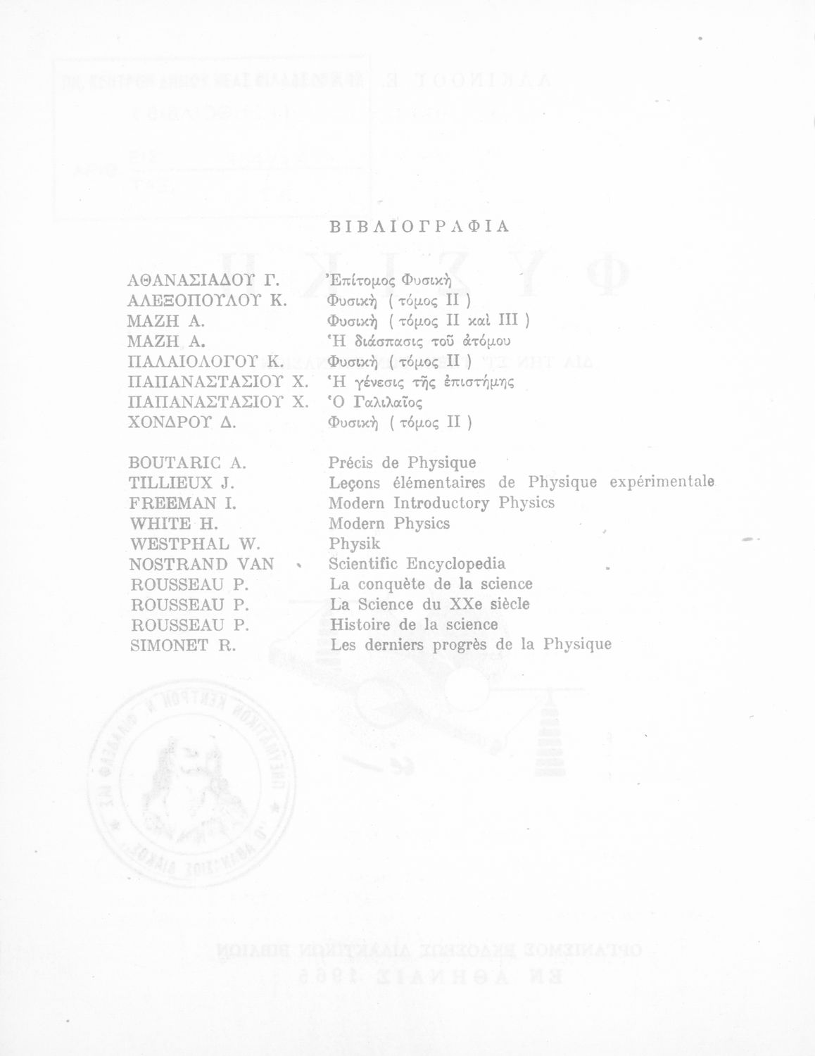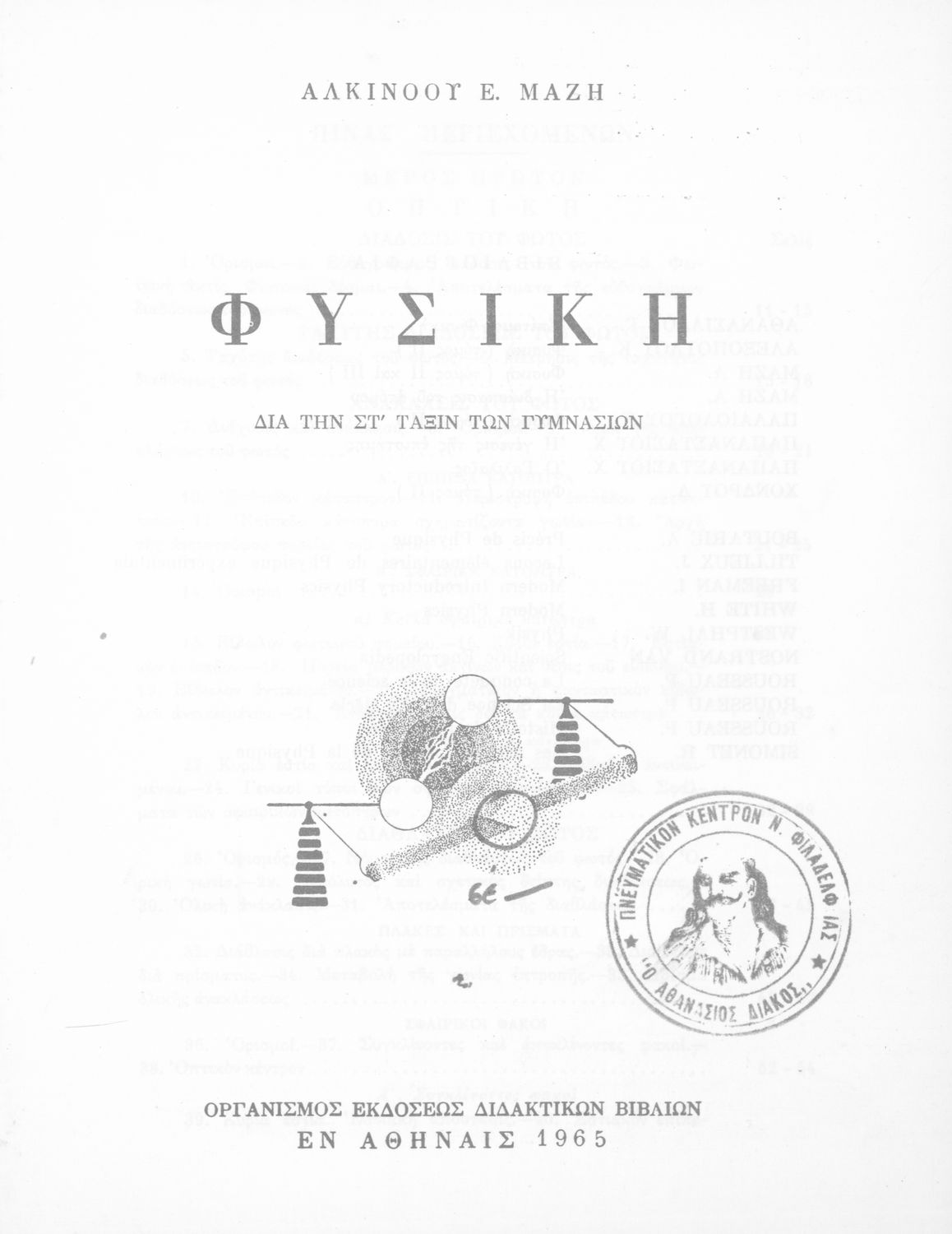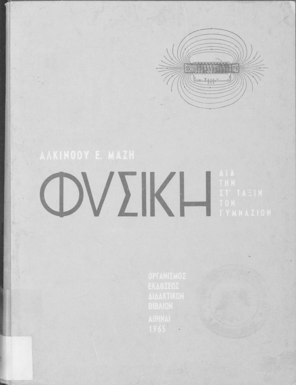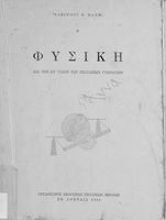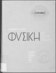 Σχολικό εγχειρίδιο Φυσικής. Το βιβλίο χωρίζεται σε τέσσερα μέρη καθένα από τα οποία περιγράφει συγκεκριμένο πεδίο της φυσικής (οπτική, μαγνητισμός, ηλεκτρισμός κλπ.). Ερμηνεύονται τα φυσικά μεγέθη, δίνονται οι ορισμοί και οι θεμελιώδης έννοιες για όλα τα πεδία ξεχωριστά.