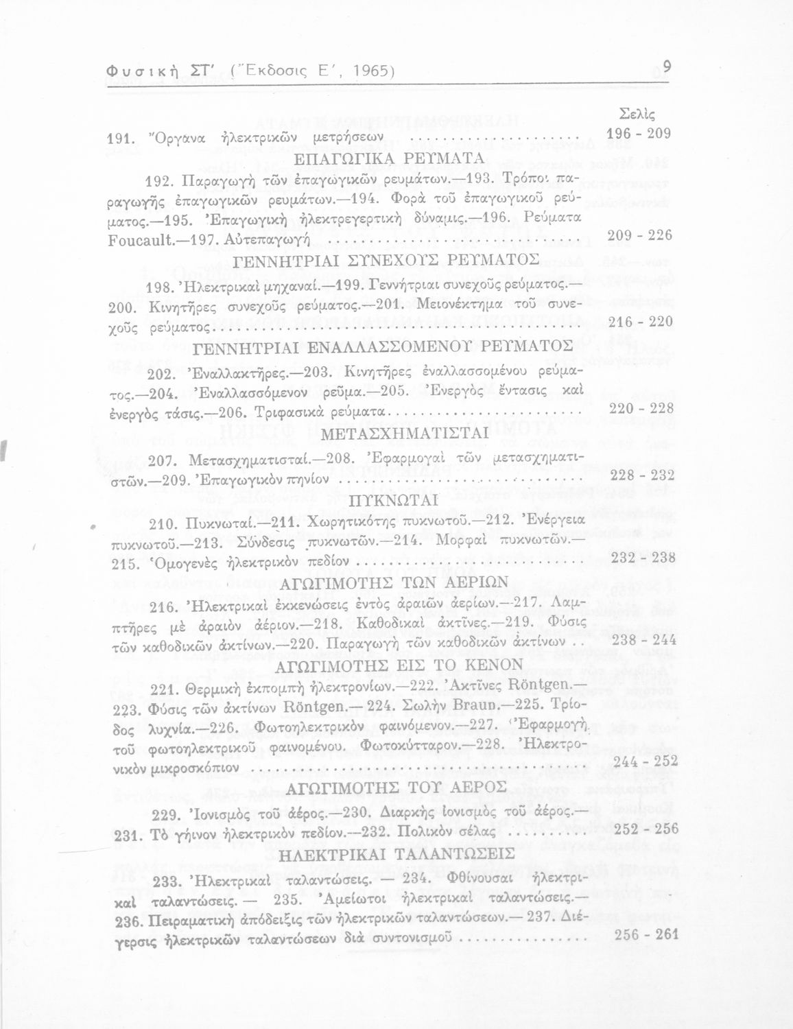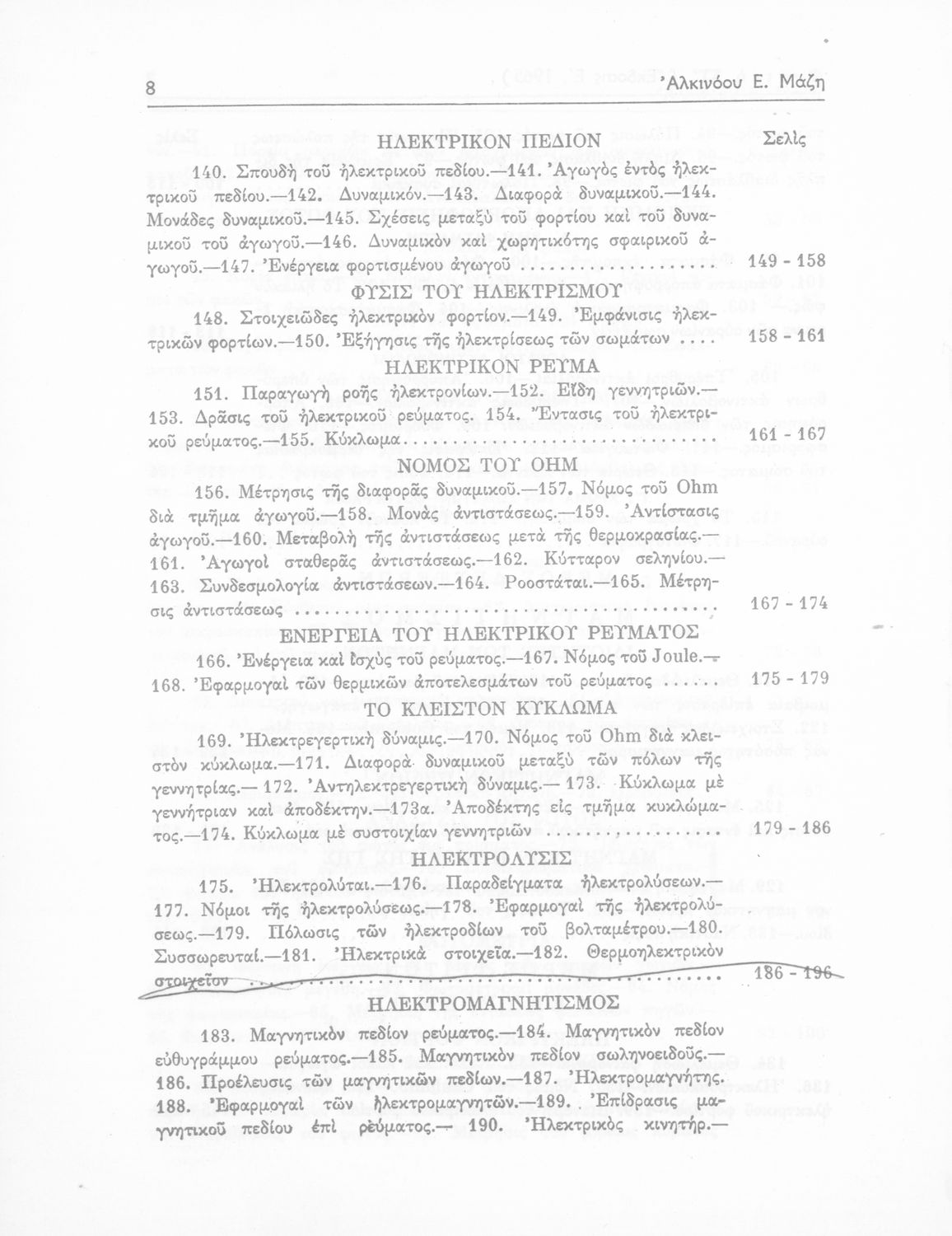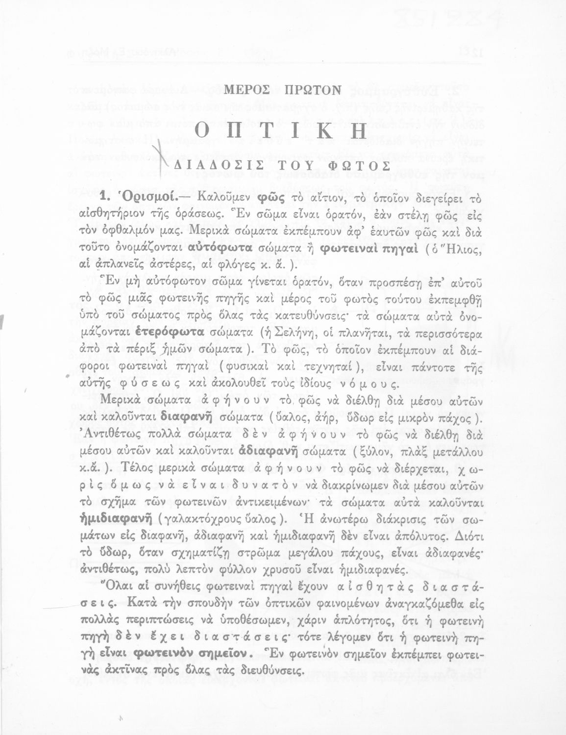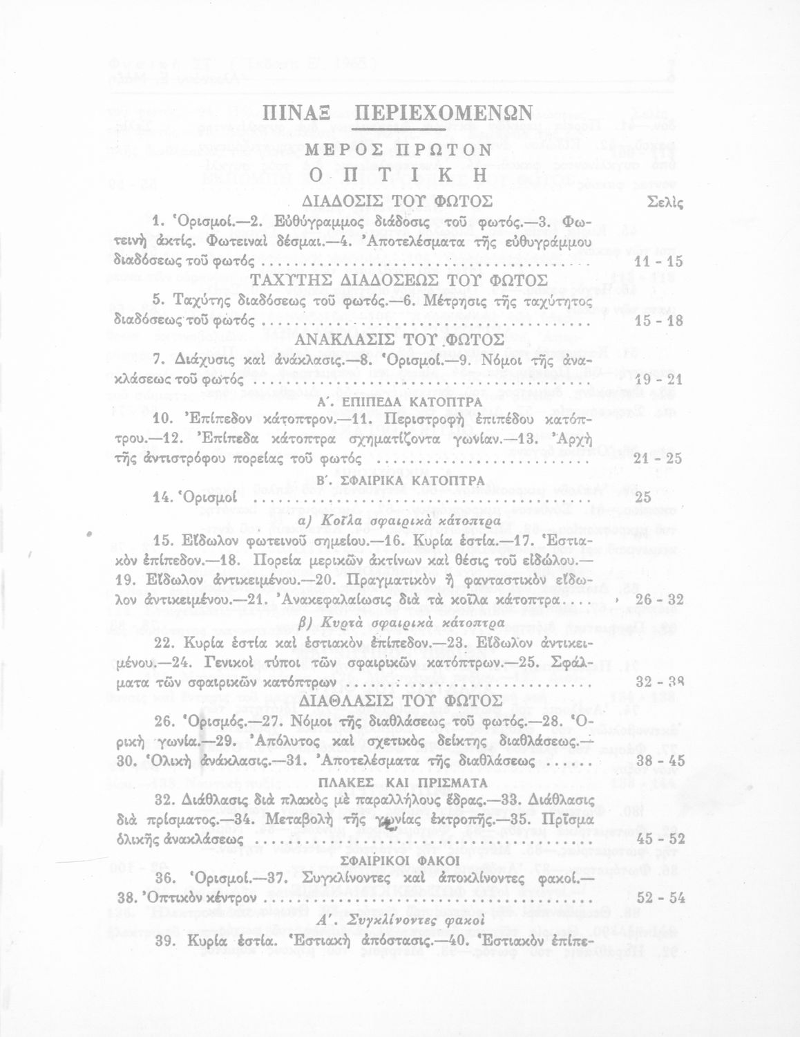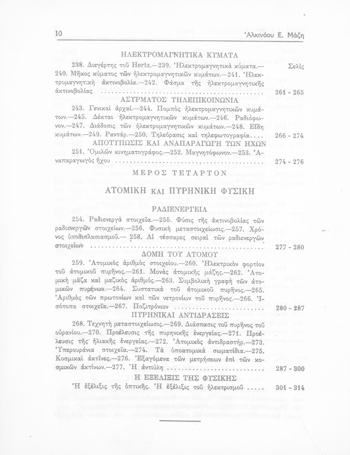 Σχολικό εγχειρίδιο Φυσικής. Το βιβλίο χωρίζεται σε τέσσερα μέρη καθένα από τα οποία περιγράφει συγκεκριμένο πεδίο της φυσικής (οπτική, μαγνητισμός, ηλεκτρισμός κλπ.). Ερμηνεύονται τα φυσικά μεγέθη, δίνονται οι ορισμοί και οι θεμελιώδης έννοιες για όλα τα πεδία ξεχωριστά.