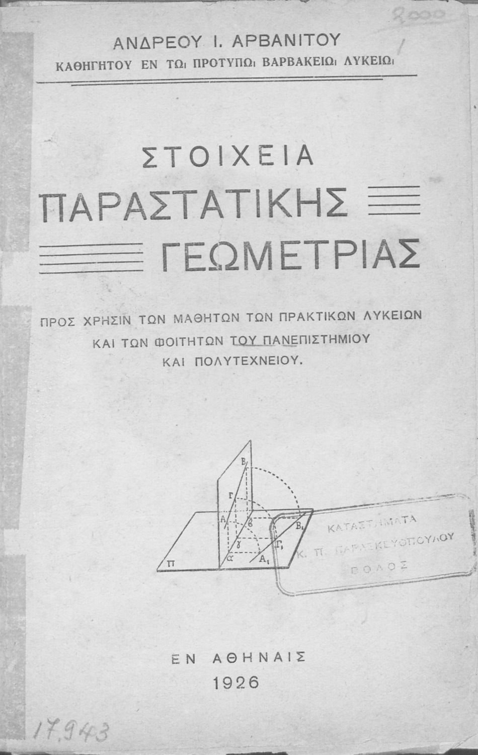 Τίτλος: Στοιχεία παραστατικής Γεωμετρίας προς χρήσιν των μαθητών των Πρακτικών Λυκείων και των φοιτητών του Πανεπιστήμιου και Πολυτεχνείου