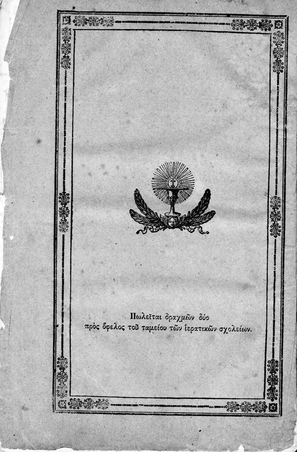 Σχολικό εγχειρίδιο Αρχαίων Ελληνικών για τα Ιερατικά Σχολεία. Ο τόμος περιέχει: «Γραμματικάς γυμνάσεις, Μύθους του Αισώπου και Φιλοσόφων ανέκδοτα, εκ των λόγων του θείου Χρυσόστομου τους περί προσευχής και τον