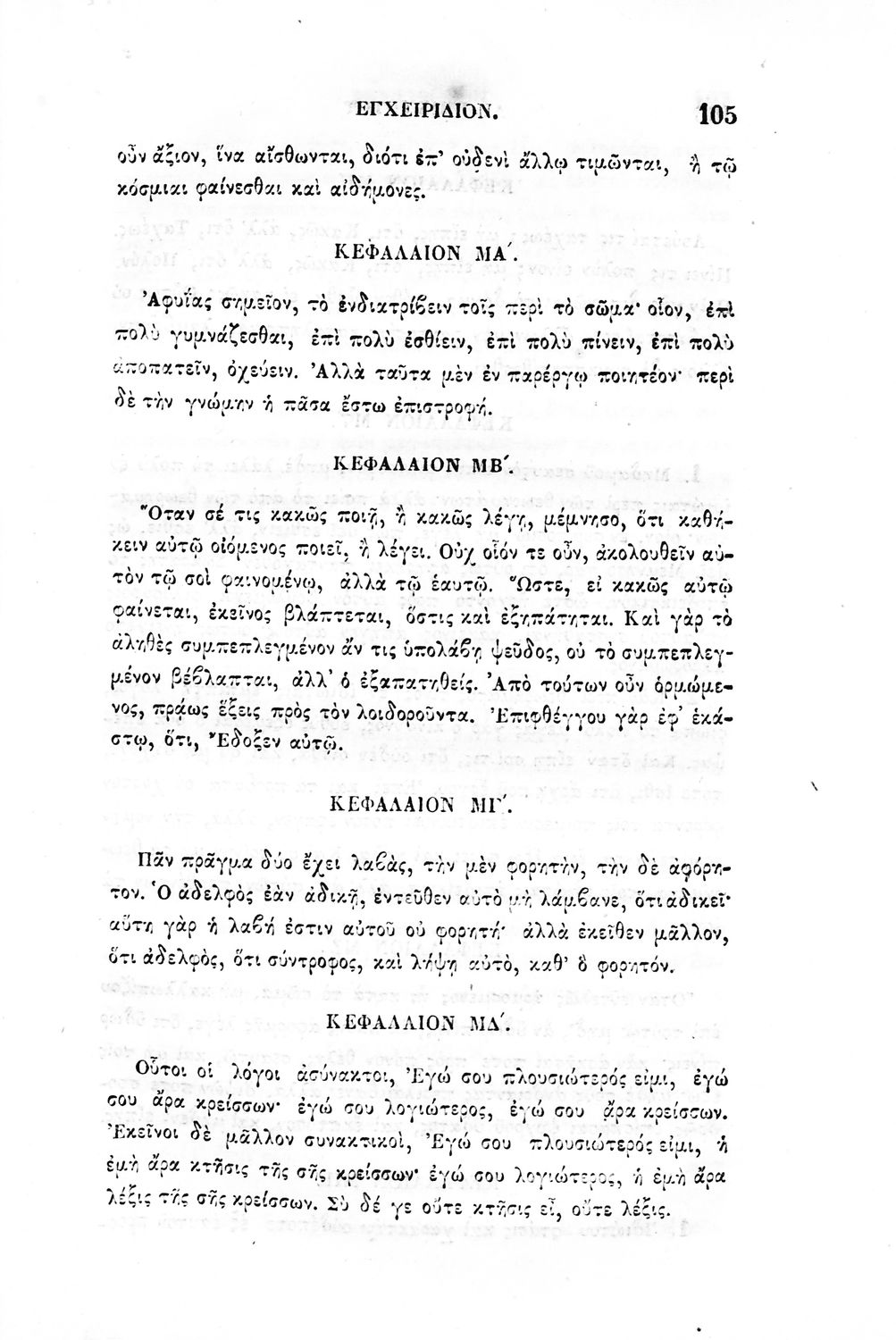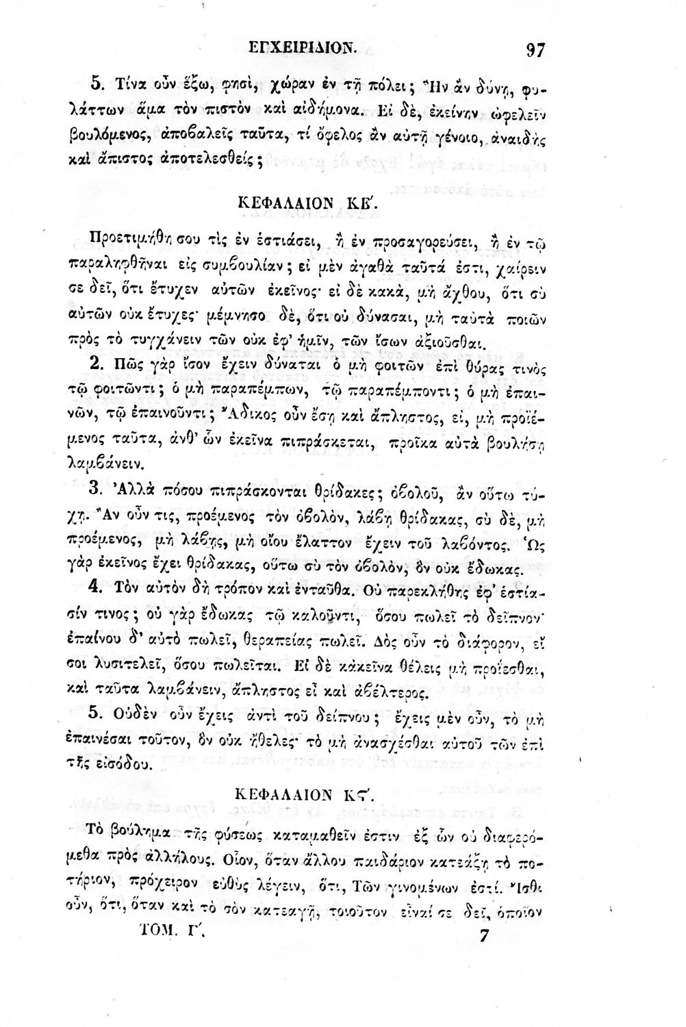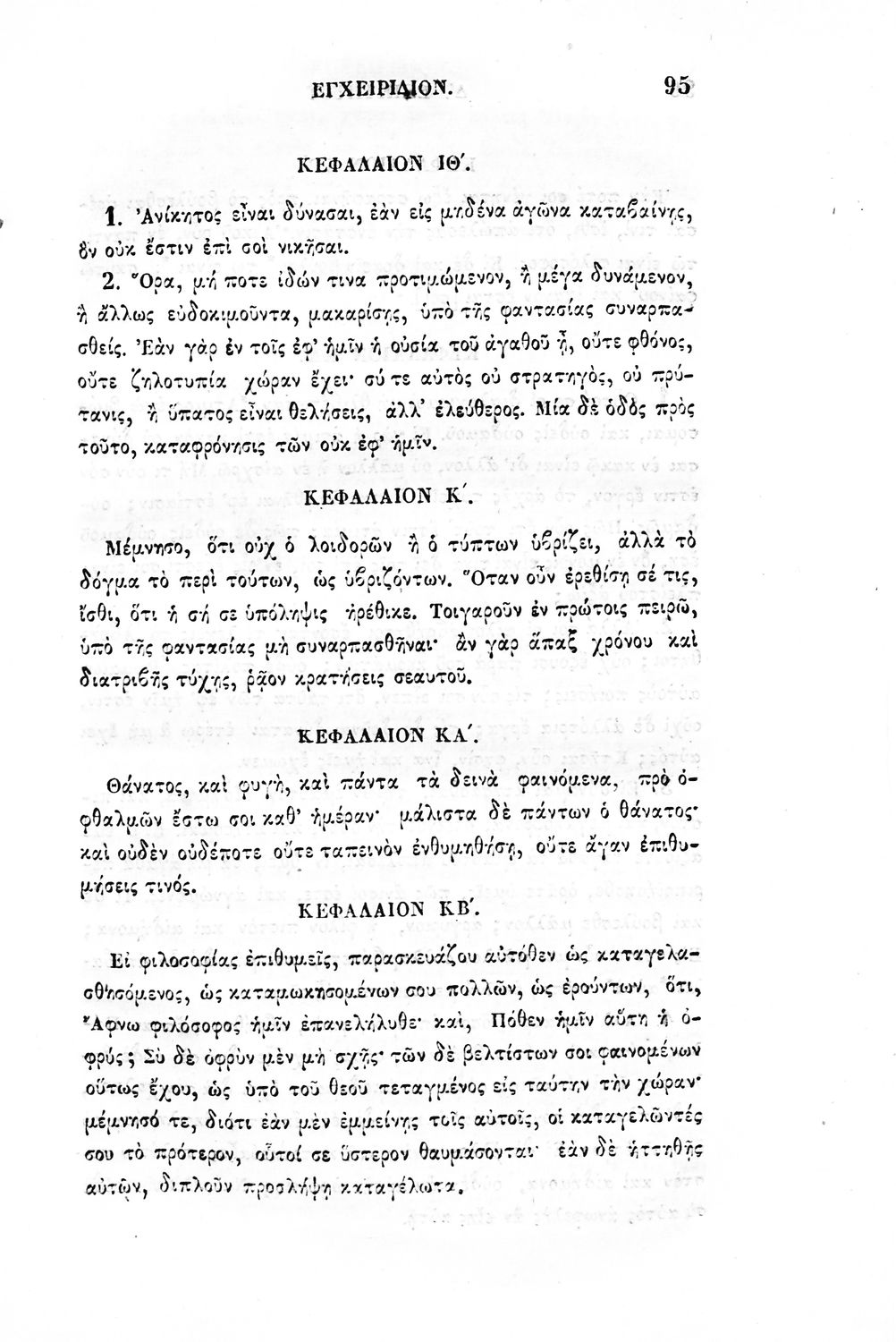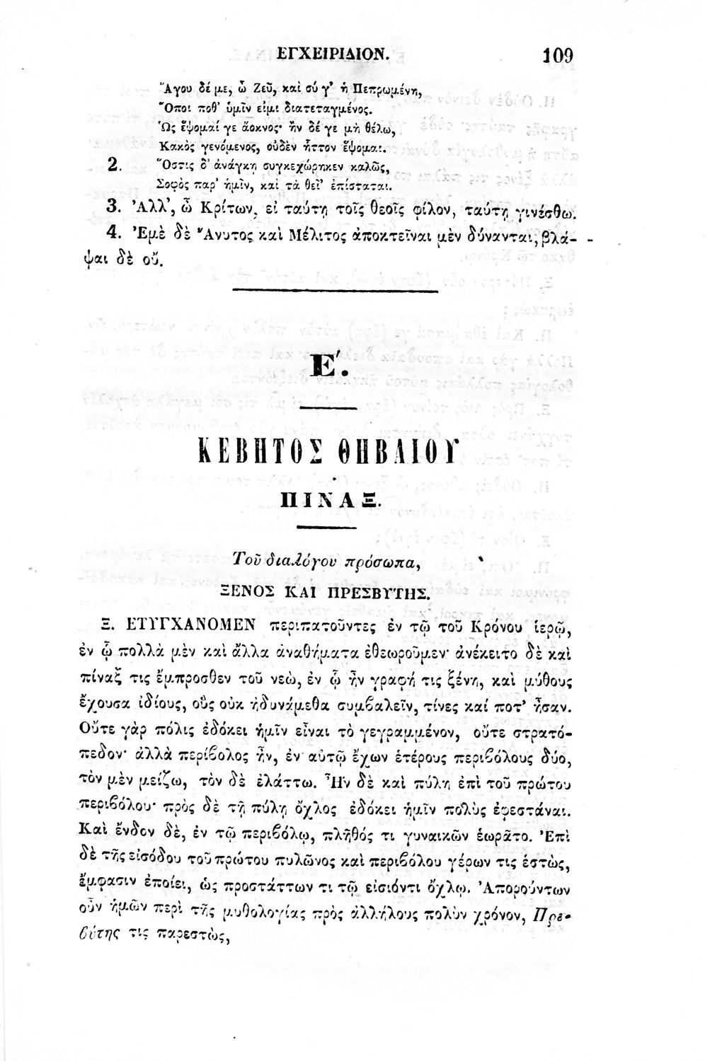 Σχολικό εγχειρίδιο Αρχαίων Ελληνικών για τα Ιερατικά Σχολεία. Ο τόμος περιέχει: «Ξενοφώντος εκ των Ελληνικών Ιστοριών και εκ των Απομνημονευμάτων Σωκράτους, αποσπάσματα –Ισοκράτους, την προς Δημόνικον παραίνεσιν, και εκ των λόγων Αρεοπαγιτικού, Συμμαχικού και Παναθηναϊκού αποσπάσματα- το Εγχειρίδιον του Επίκτητου- τον Πίνακα του Κέβητος- την προς τους νέους παραίνεσιν Βασιλείου του Μεγάλου- και τους Κατηχητικούς και Μυσταγωγικούς λόγους του Κυρίλλου, του Ιεροσολύμων Αρχιεπισκόπου»