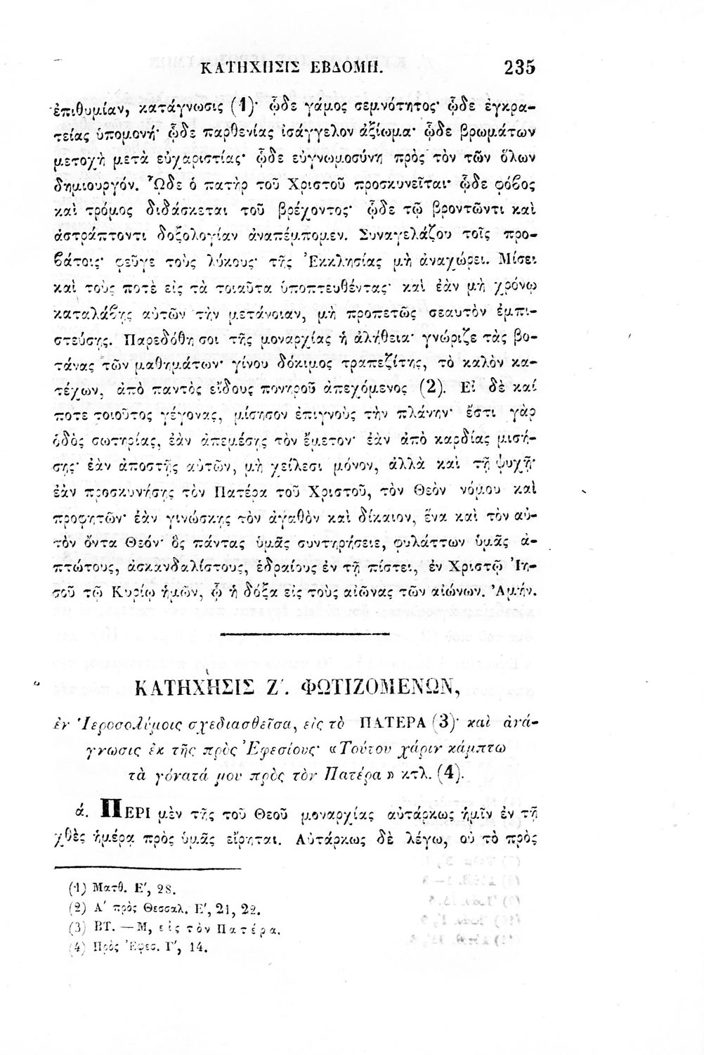 Σχολικό εγχειρίδιο Αρχαίων Ελληνικών για τα Ιερατικά Σχολεία. Ο τόμος περιέχει: «Ξενοφώντος εκ των Ελληνικών Ιστοριών και εκ των Απομνημονευμάτων Σωκράτους, αποσπάσματα –Ισοκράτους, την προς Δημόνικον παραίνεσιν, και εκ των λόγων Αρεοπαγιτικού, Συμμαχικού και Παναθηναϊκού αποσπάσματα- το Εγχειρίδιον του Επίκτητου- τον Πίνακα του Κέβητος- την προς τους νέους παραίνεσιν Βασιλείου του Μεγάλου- και τους Κατηχητικούς και Μυσταγωγικούς λόγους του Κυρίλλου, του Ιεροσολύμων Αρχιεπισκόπου»