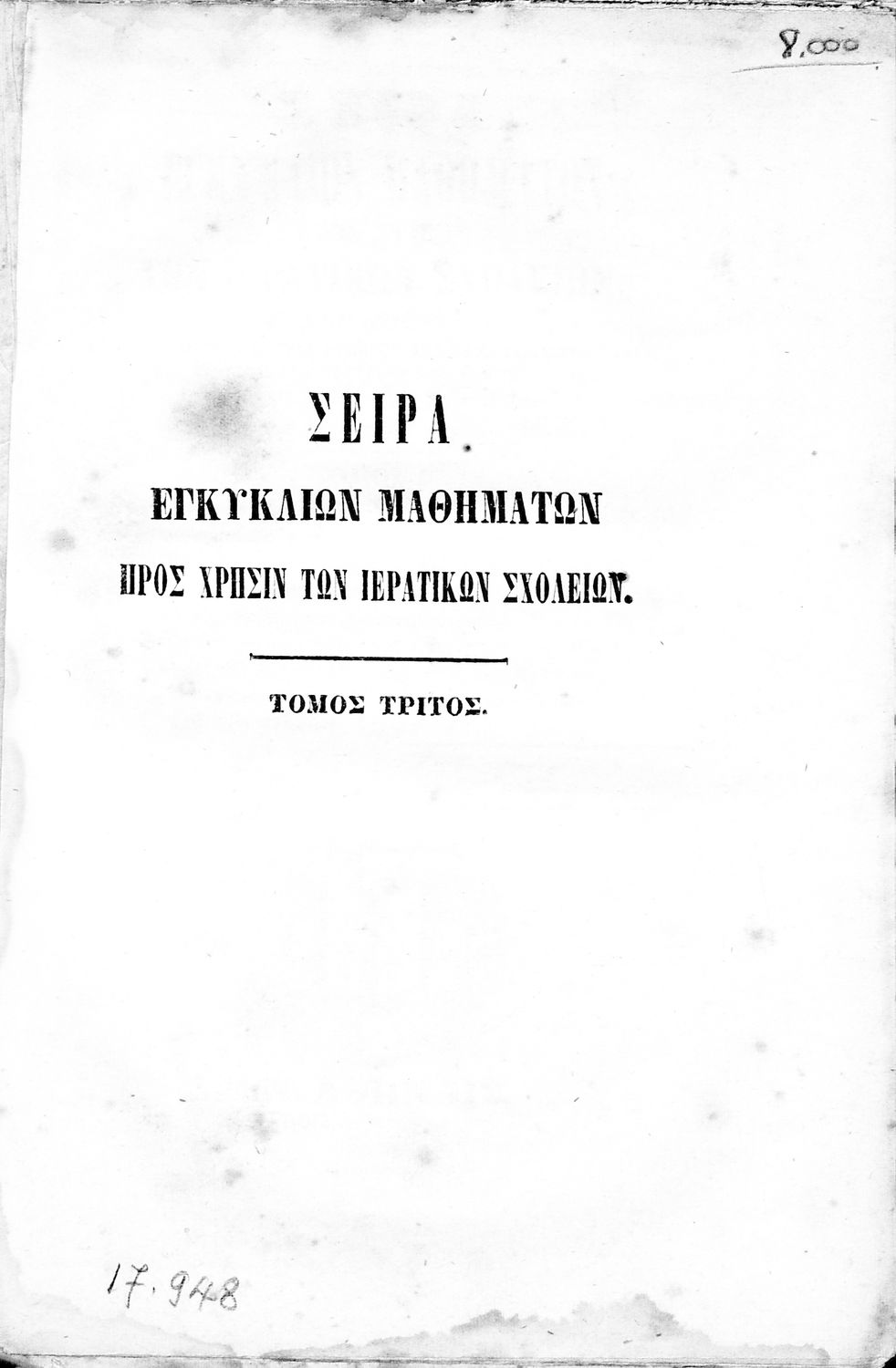 Τίτλος: Σειρά εγκύκλιων μαθημάτων προς χρήσιν των Ιερατικών Σχολείων, Συνερανισθείσα. Τόμος Γ΄
