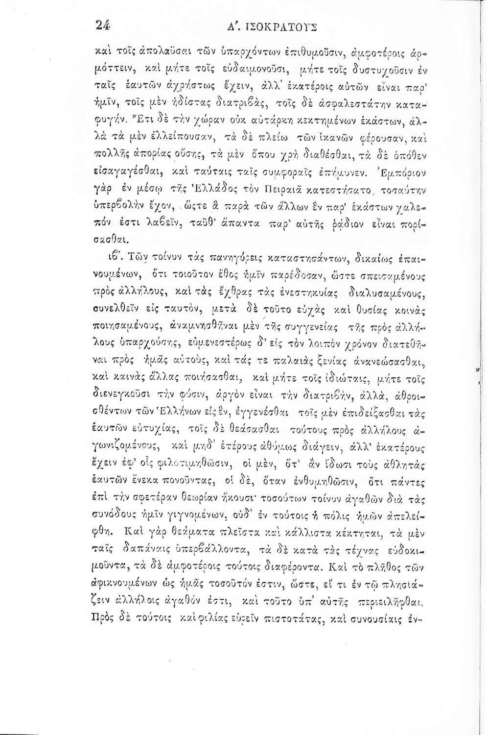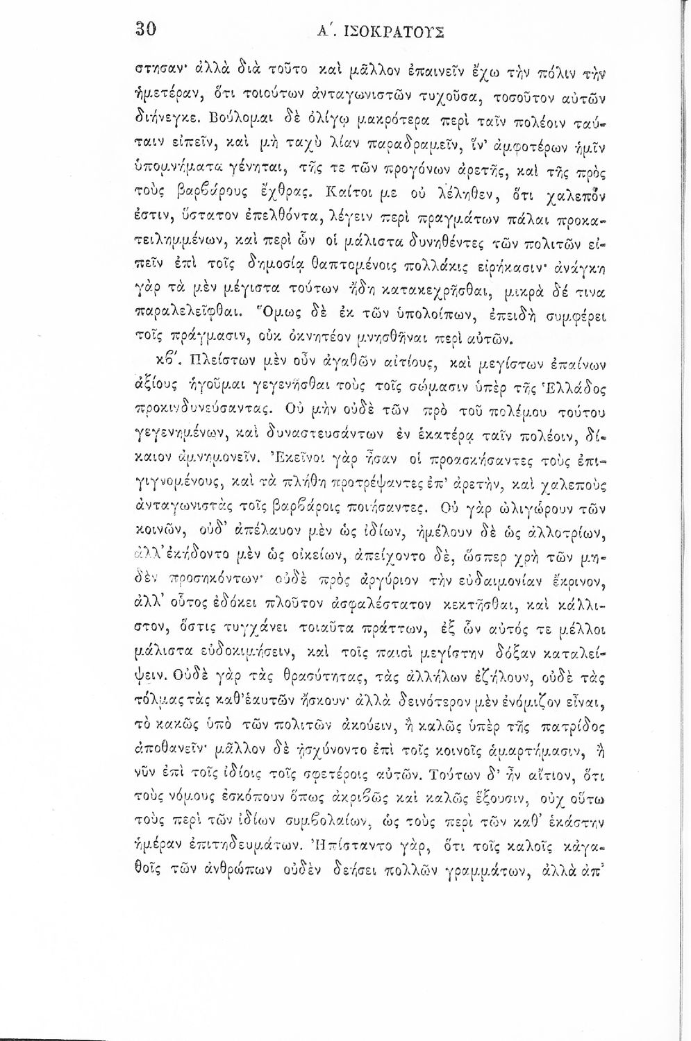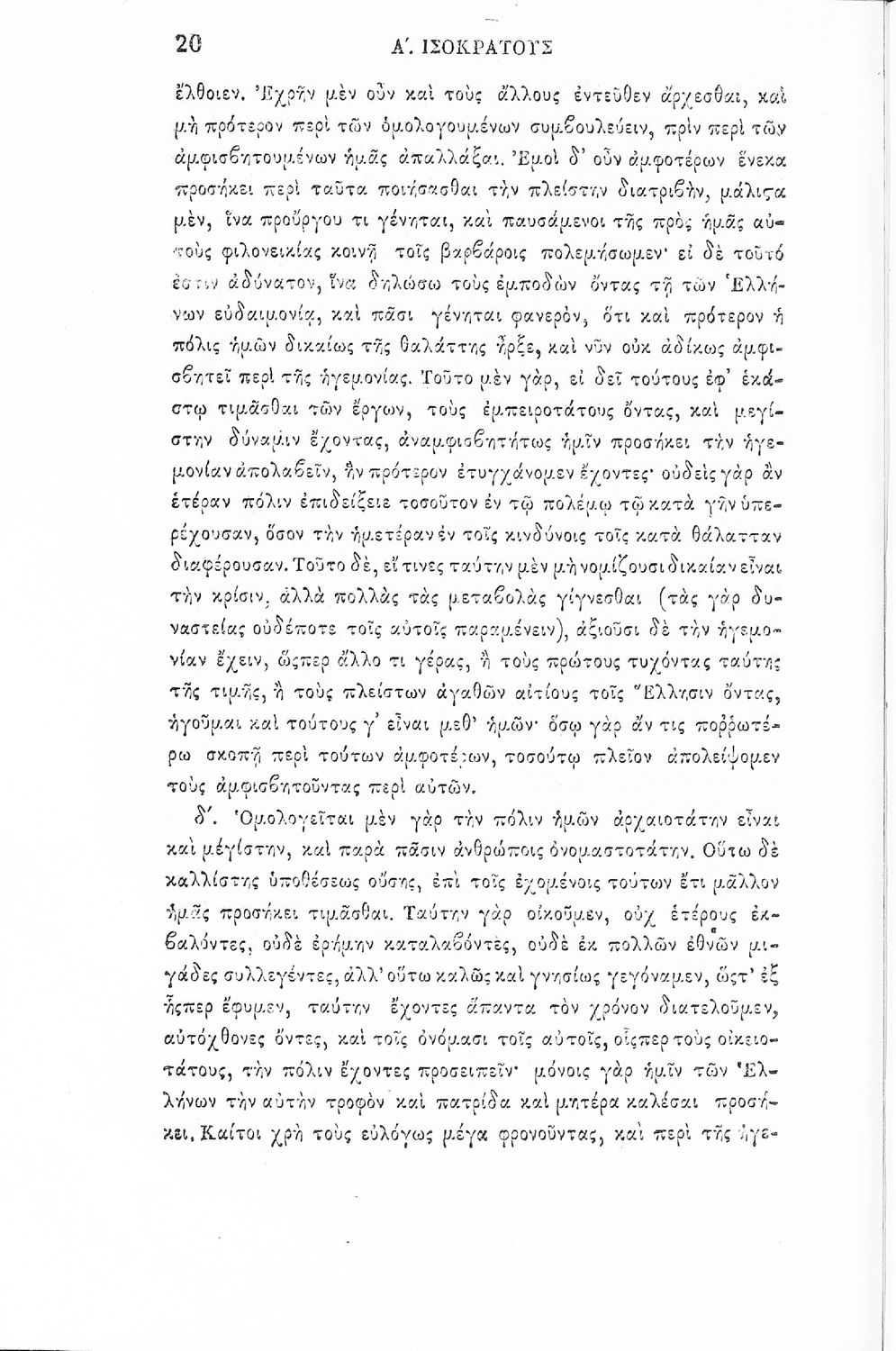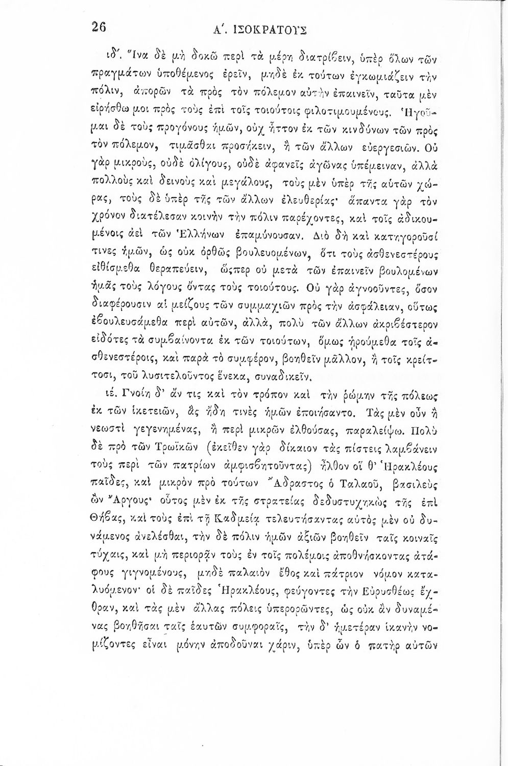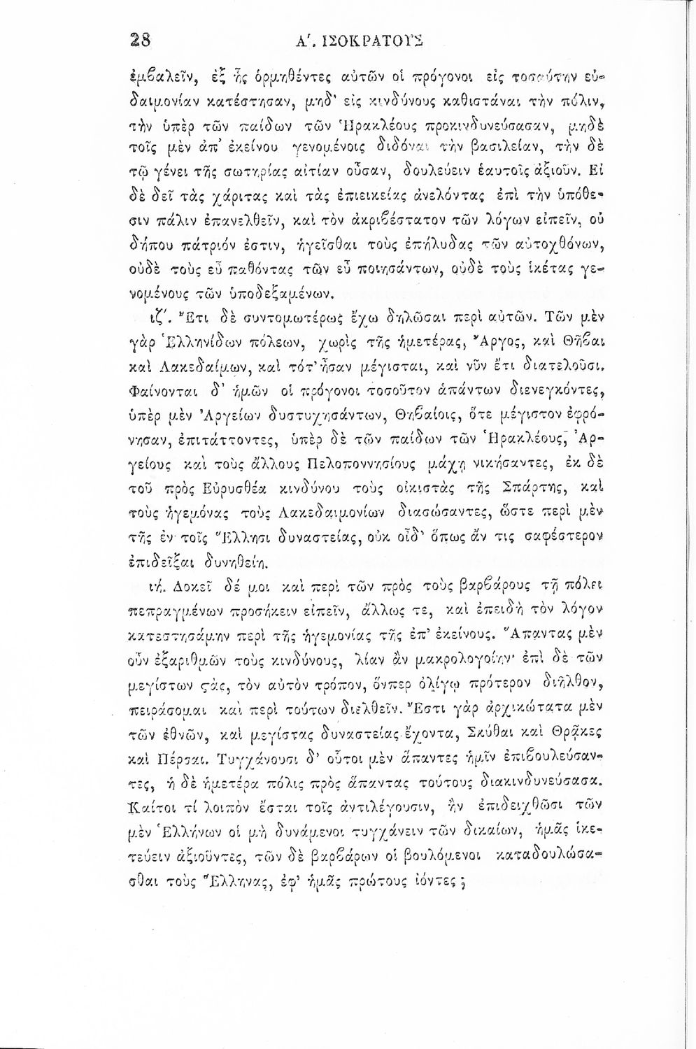 Σχολικό εγχειρίδιο Αρχαίων Ελληνικών για τα Ιερατικά Σχολεία. Ο τόμος περιέχει : «Ισοκράτους, το εις Ευαγόρα εγκώμιον, και τον Πανηγυρικόν- Πλουτάρχου, εκ των Παραλλήλων βίων τινάς- Ηροδότου, εκ των Ιστοριών Α΄, Ε΄, ΣΤ΄ και Η΄, αποσπάσματα- Γρηγορίου του Θεολόγου, τον απολογητικόν της εις τον Πόντον φυγής ένεκεν, η περί Ιερωσύνης και εκ των επιταφίων λόγων, τον εις Καισάριον τον εαυτού αδελφόν και εις τον Μέγαν Βασίλειον- και Ιωάννου του Χρυσοστόμου τους περί Ιερωσύνης λόγους, εις ανάγνωσιν»