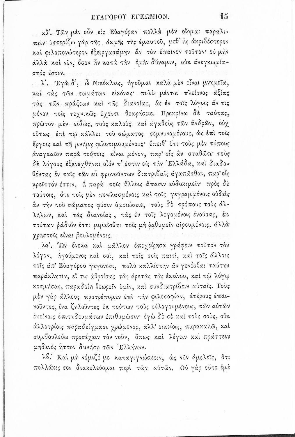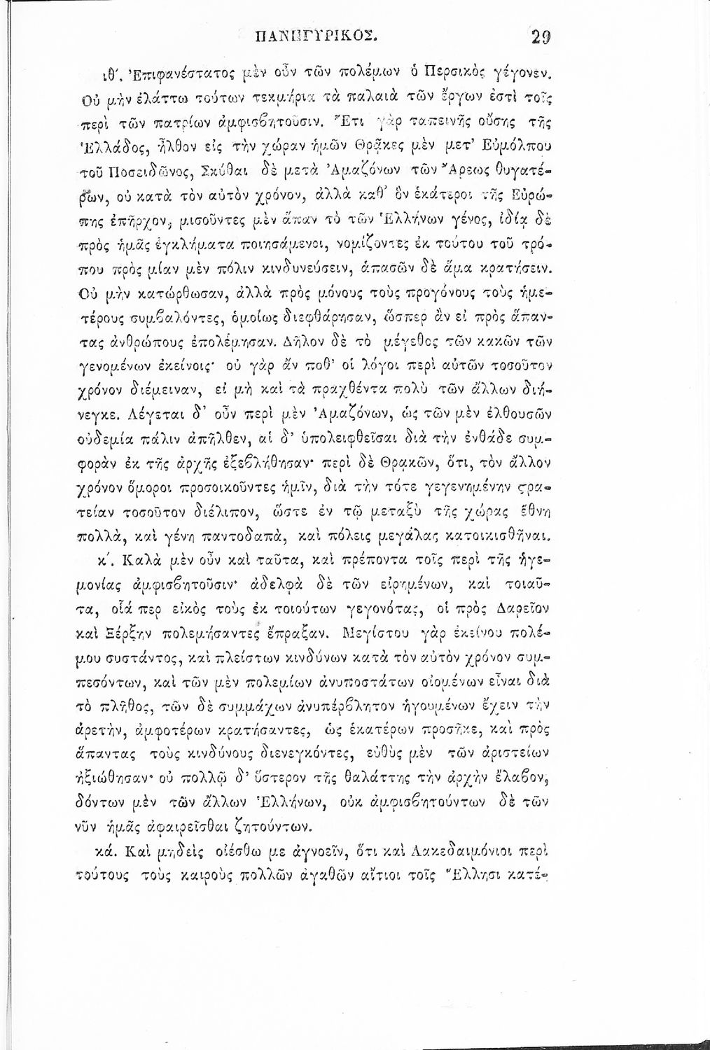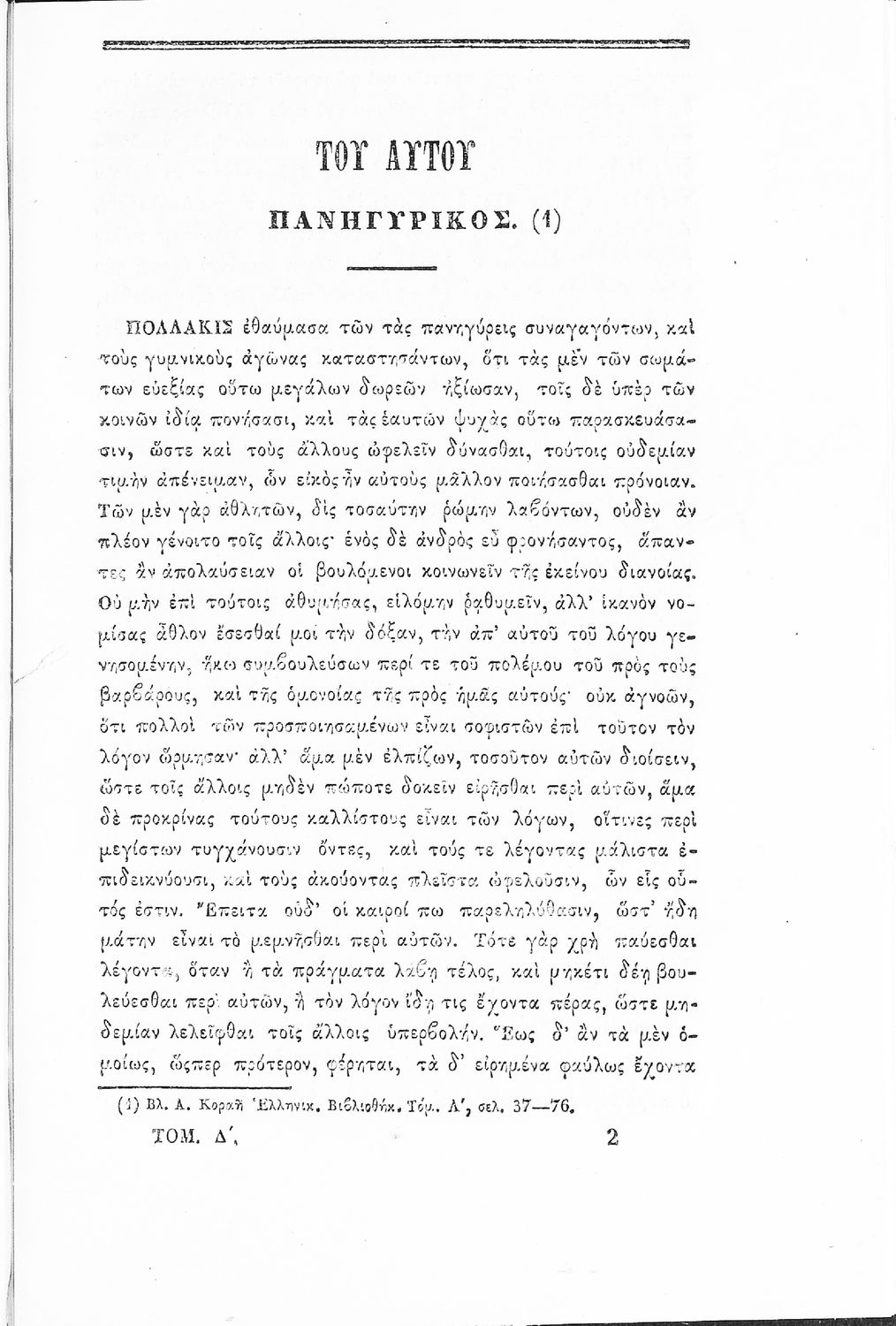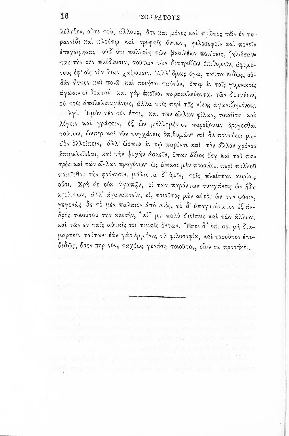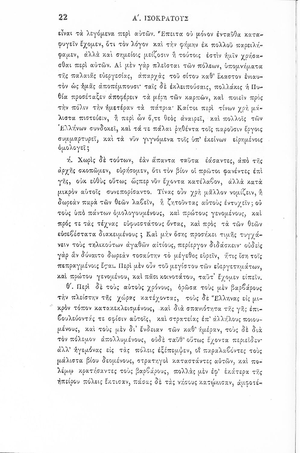Σχολικό εγχειρίδιο Αρχαίων Ελληνικών για τα Ιερατικά Σχολεία. Ο τόμος περιέχει : «Ισοκράτους, το εις Ευαγόρα εγκώμιον, και τον Πανηγυρικόν- Πλουτάρχου, εκ των Παραλλήλων βίων τινάς- Ηροδότου, εκ των Ιστοριών Α΄, Ε΄, ΣΤ΄ και Η΄, αποσπάσματα- Γρηγορίου του Θεολόγου, τον απολογητικόν της εις τον Πόντον φυγής ένεκεν, η περί Ιερωσύνης και εκ των επιταφίων λόγων, τον εις Καισάριον τον εαυτού αδελφόν και εις τον Μέγαν Βασίλειον- και Ιωάννου του Χρυσοστόμου τους περί Ιερωσύνης λόγους, εις ανάγνωσιν»
