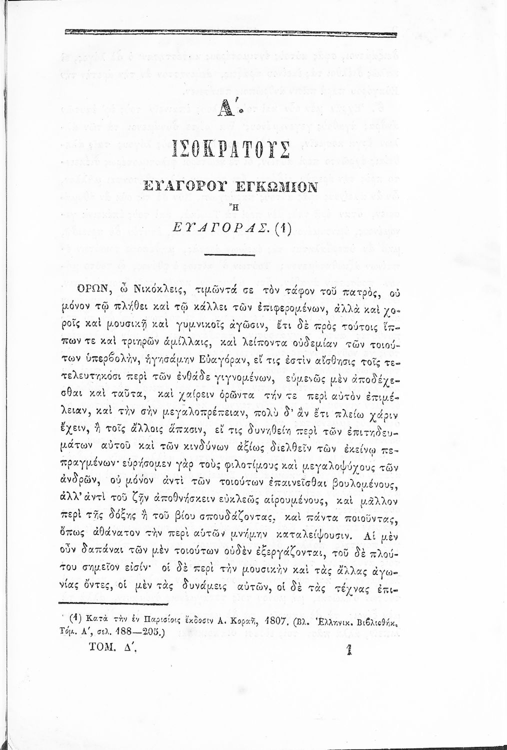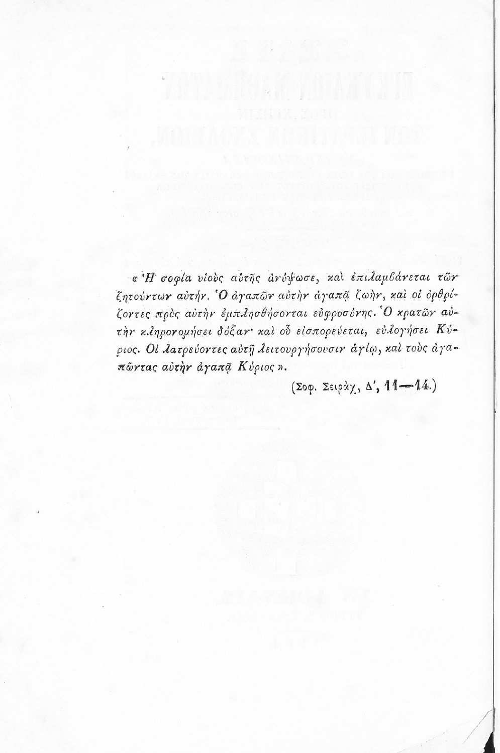 Σχολικό εγχειρίδιο Αρχαίων Ελληνικών για τα Ιερατικά Σχολεία. Ο τόμος περιέχει : «Ισοκράτους, το εις Ευαγόρα εγκώμιον, και τον Πανηγυρικόν- Πλουτάρχου, εκ των Παραλλήλων βίων τινάς- Ηροδότου, εκ των Ιστοριών Α΄, Ε΄, ΣΤ΄ και Η΄, αποσπάσματα- Γρηγορίου του Θεολόγου, τον απολογητικόν της εις τον Πόντον φυγής ένεκεν, η περί Ιερωσύνης και εκ των επιταφίων λόγων, τον εις Καισάριον τον εαυτού αδελφόν και εις τον Μέγαν Βασίλειον- και Ιωάννου του Χρυσοστόμου τους περί Ιερωσύνης λόγους, εις ανάγνωσιν»