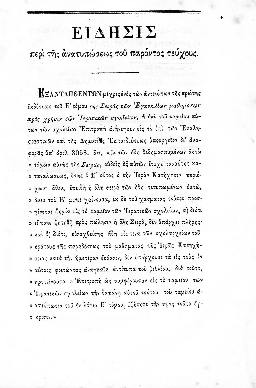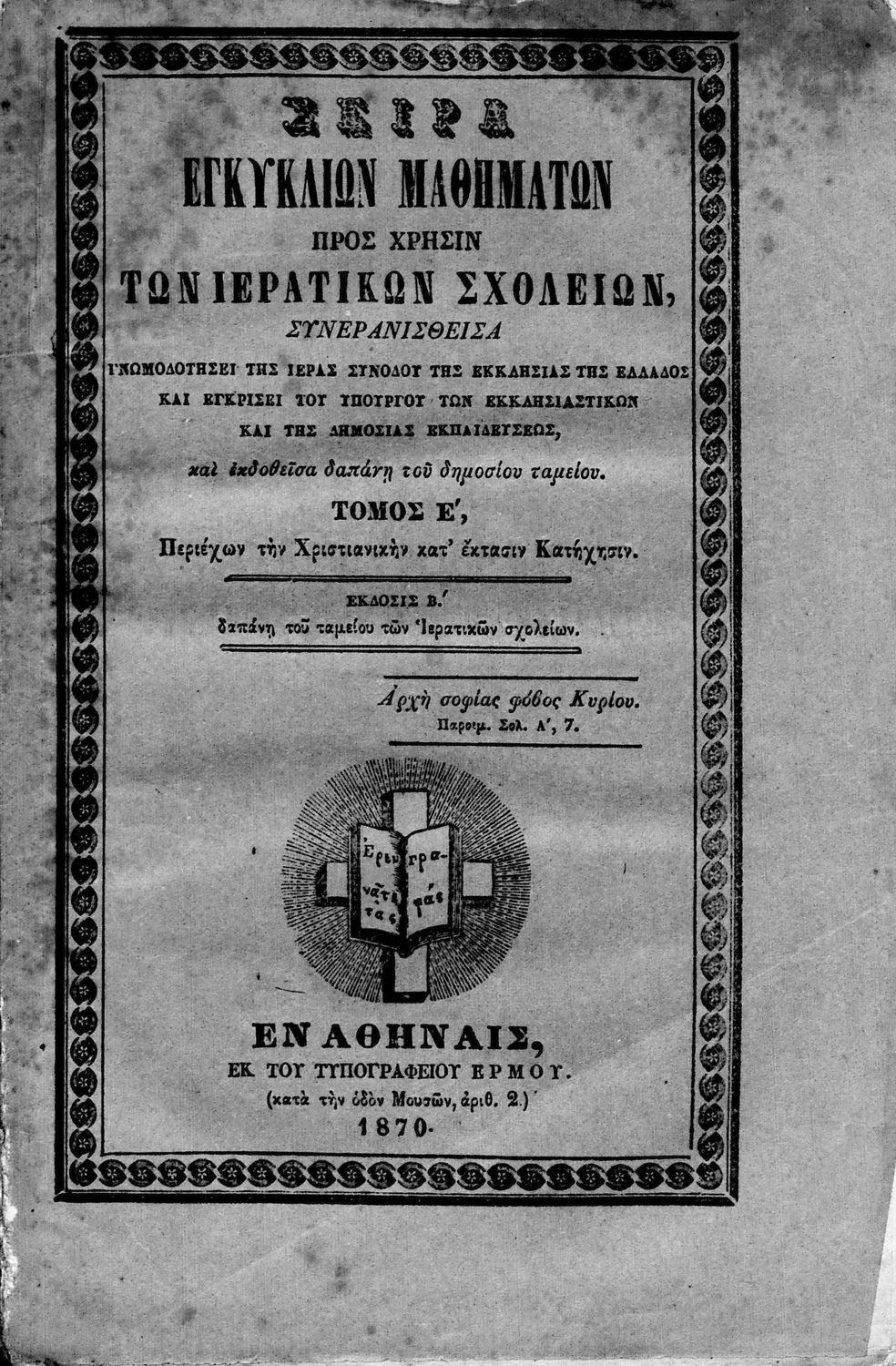 Τίτλος: Σειρά Εγκυκλίων μαθημάτων προς χρήσιν των Ιερατικών Σχολείων, Τόμος πέμπτος