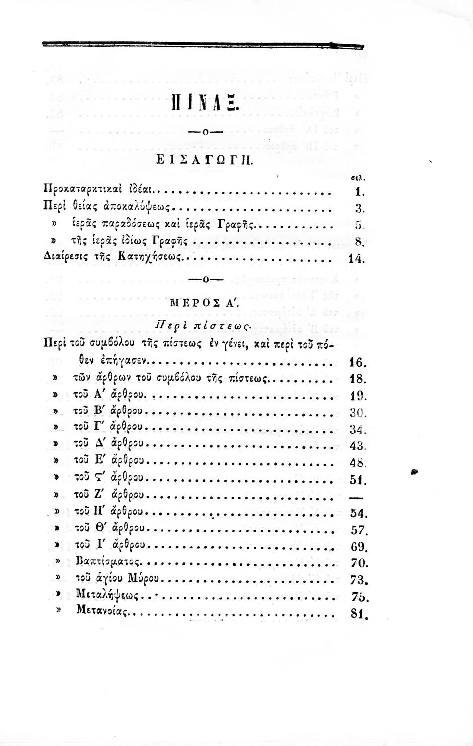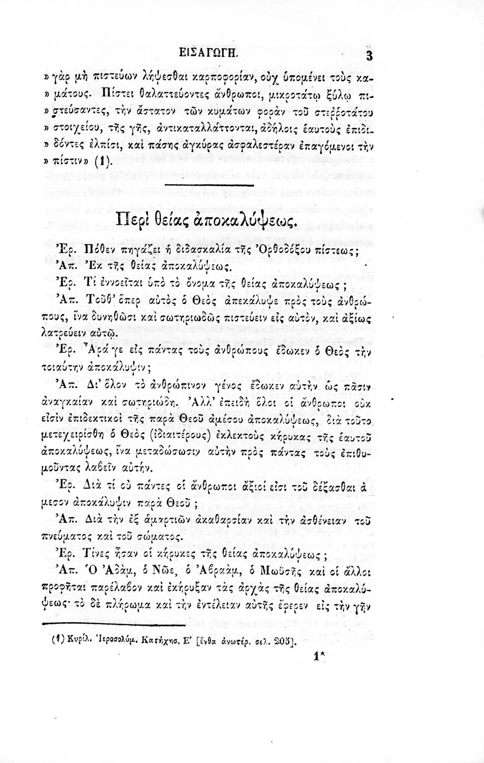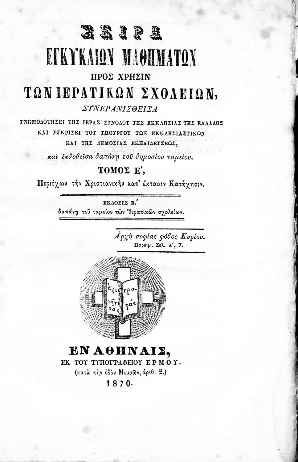 Σχολικό εγχειρίδιο Θρησκευτικών για τα Ιερατικά σχολεία με τη γνωμοδότηση της Ιεράς Συνόδου και έγκριση του υπουργού των Εκκλησιαστικών και της δημόσιας εκπαίδευσης. Η θεματολογία των μαθημάτων είναι σχετική με τα μυστήρια της εκκλησίας καθώς και από κείμενα της Αποκάλυψης.