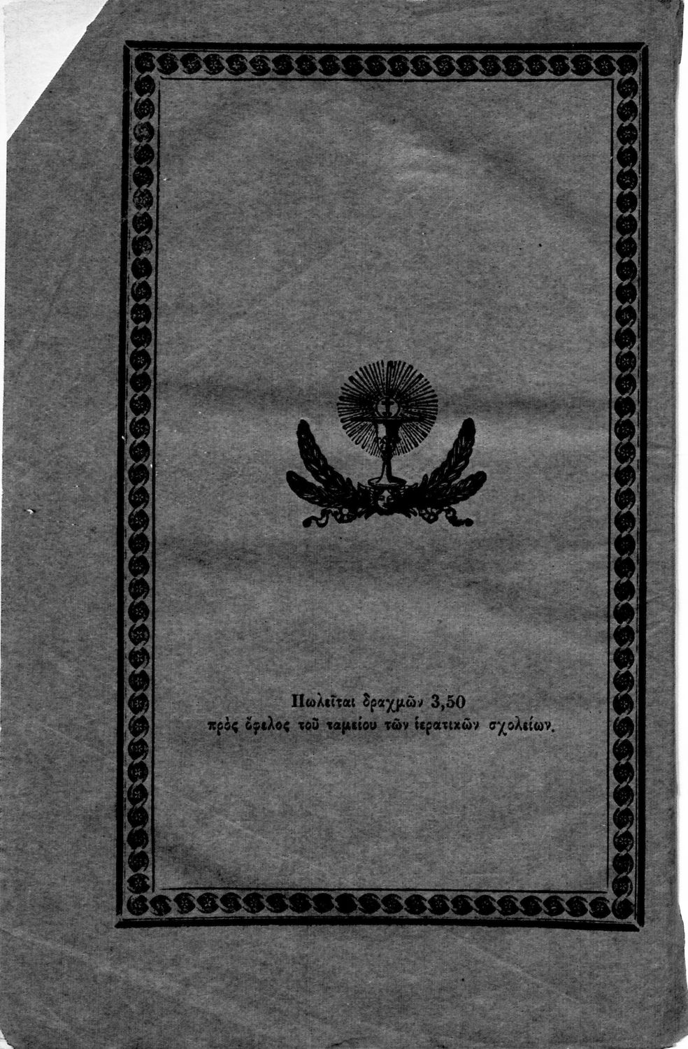 Σχολικό εγχειρίδιο Θρησκευτικών για τα Ιερατικά σχολεία με τη γνωμοδότηση της Ιεράς Συνόδου και έγκριση του υπουργού των Εκκλησιαστικών και της δημόσιας εκπαίδευσης. Η θεματολογία είναι σχετική με τη ...