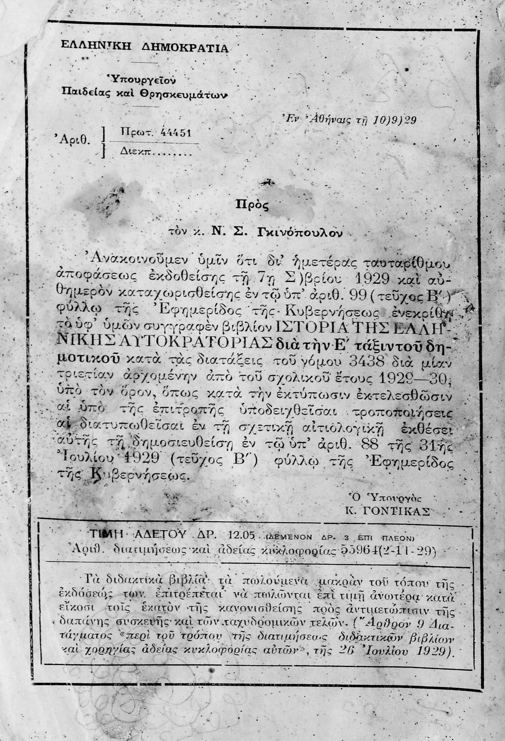 Υπουργική απόφαση / Σύμβαση: 444451/10-9-1929