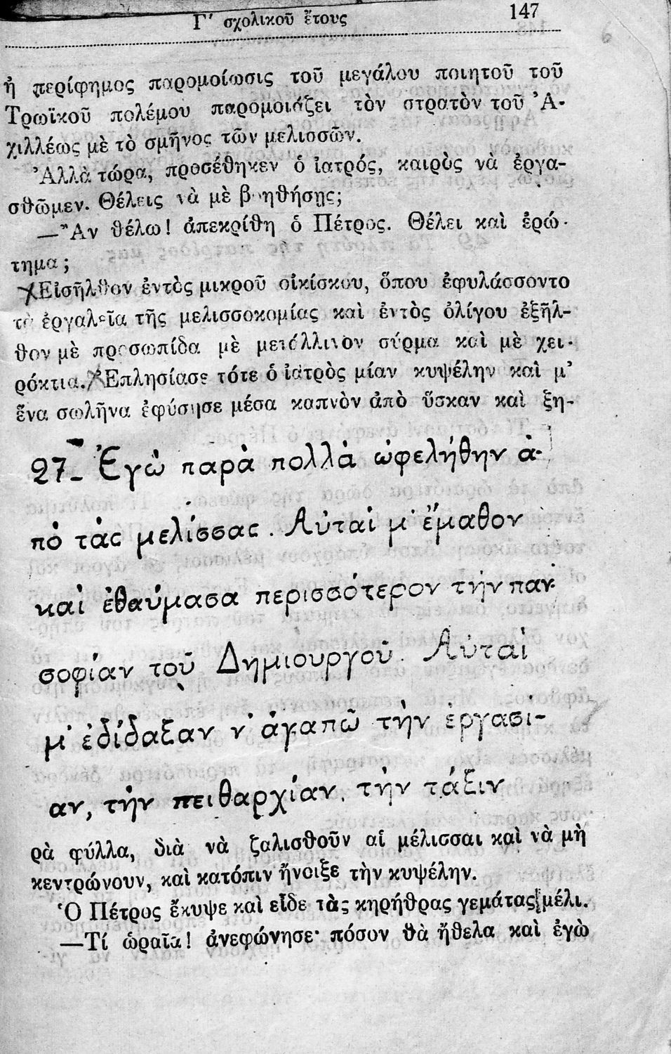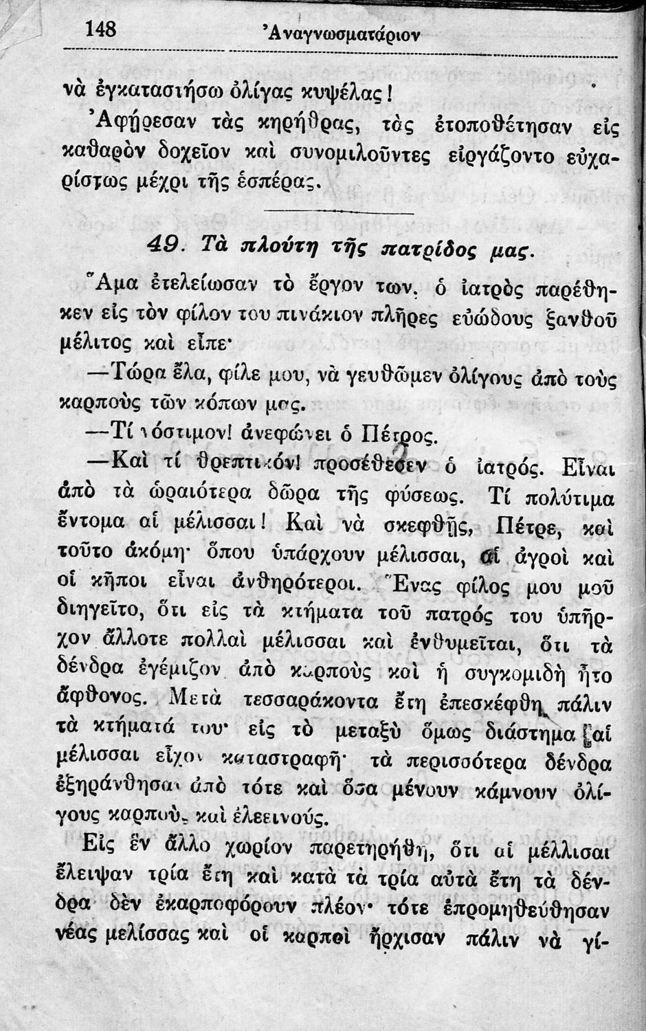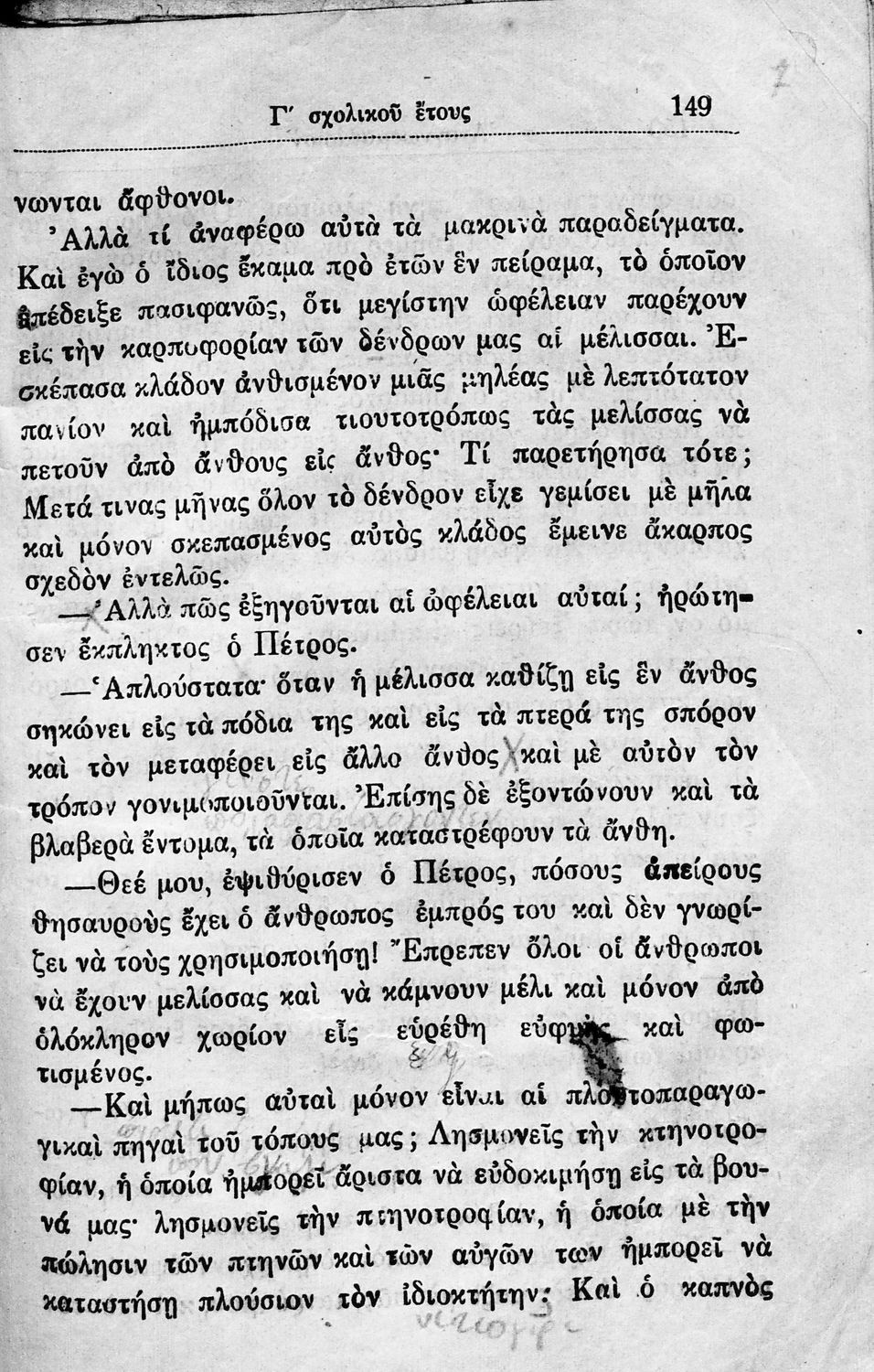 Παρουσίαση περιεχομένου: Σχολικό εγχειρίδιο Γλώσσας για την Γ΄ Δημοτικού. Περιλαμβάνει κείμενα σχετικά με την αγροτική ζωή και τη φύση. Εγκρίθηκε στον Πανταζοπούλειο διαγωνισμό που προκηρύχτηκε στις 24-7-1913 για να συνταχτεί αναγνωσματάριο για τα Α΄, Β΄, Γ΄, Δ΄ έτη της Δημοτικής Εκπαιδεύσεως.