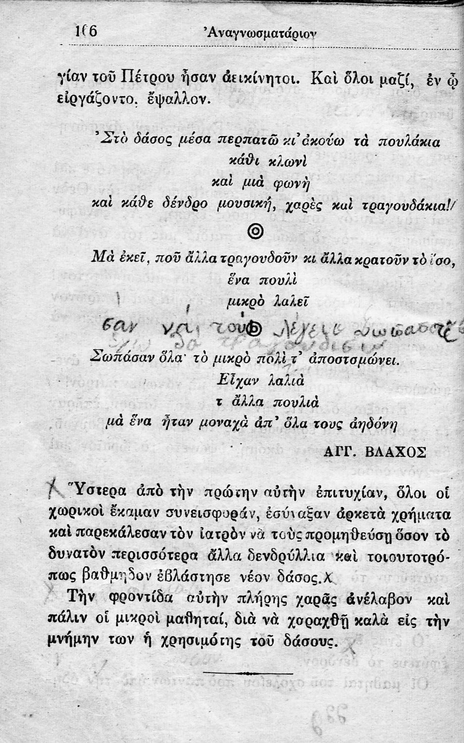 Σχολικό εγχειρίδιο Γλώσσας για την Γ΄ Δημοτικού. Περιλαμβάνει κείμενα σχετικά με την αγροτική ζωή και τη φύση. Εγκρίθηκε στον Πανταζοπούλειο διαγωνισμό που προκηρύχτηκε στις 24-7-1913 για να συνταχτεί αναγνωσματάριο για τα Α΄, Β΄, Γ΄, Δ΄ έτη της Δημοτικής Εκπαιδεύσεως.