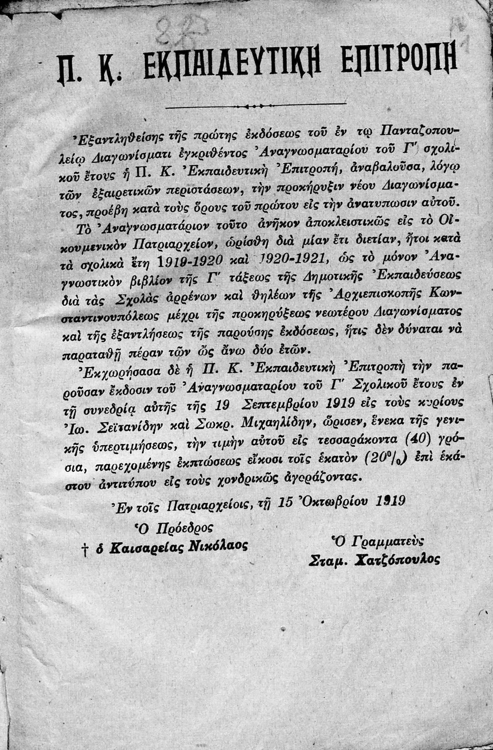 Εκδότης: Ι. Κ. Σεϊτανίδης και Σ. Κ. Μιχαηλίδης Έτος έκδοσης: 1919 Τόπος έκδοσης: Κωνσταντινούπολη Έκδοση: 2η Έτος έγκρισης: 1914 |